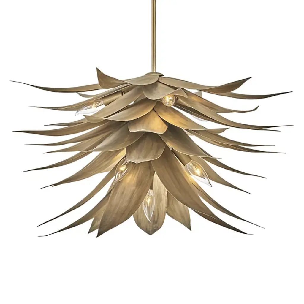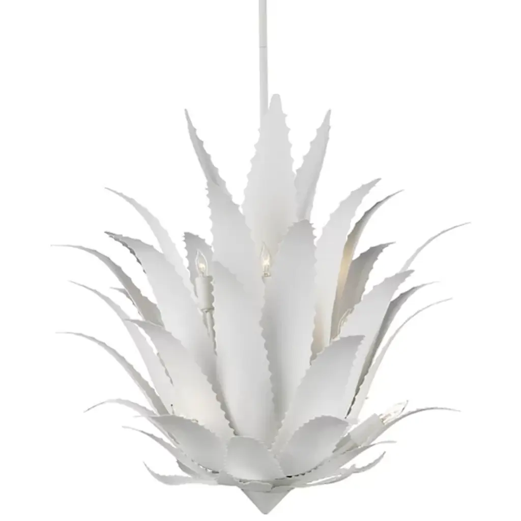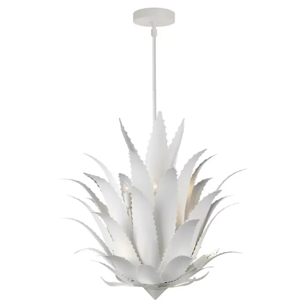 The Agave Chandelier from Currey & Company captures the essence of its namesake plant through dramatic metal fronds curling upward. Designer Marjorie Skouras translates her passion for Yucatan flora into this botanical-inspired piece. The wrought iron construction allows for precisely shaping each spiky leaf, while a gesso finish unifies the composition. Light filters between the overlapping fronds, creating organic shadow play. The adjustable suspension system ensures perfect positioning in various settings. This chandelier brings the sculptural beauty of desert plants indoors.