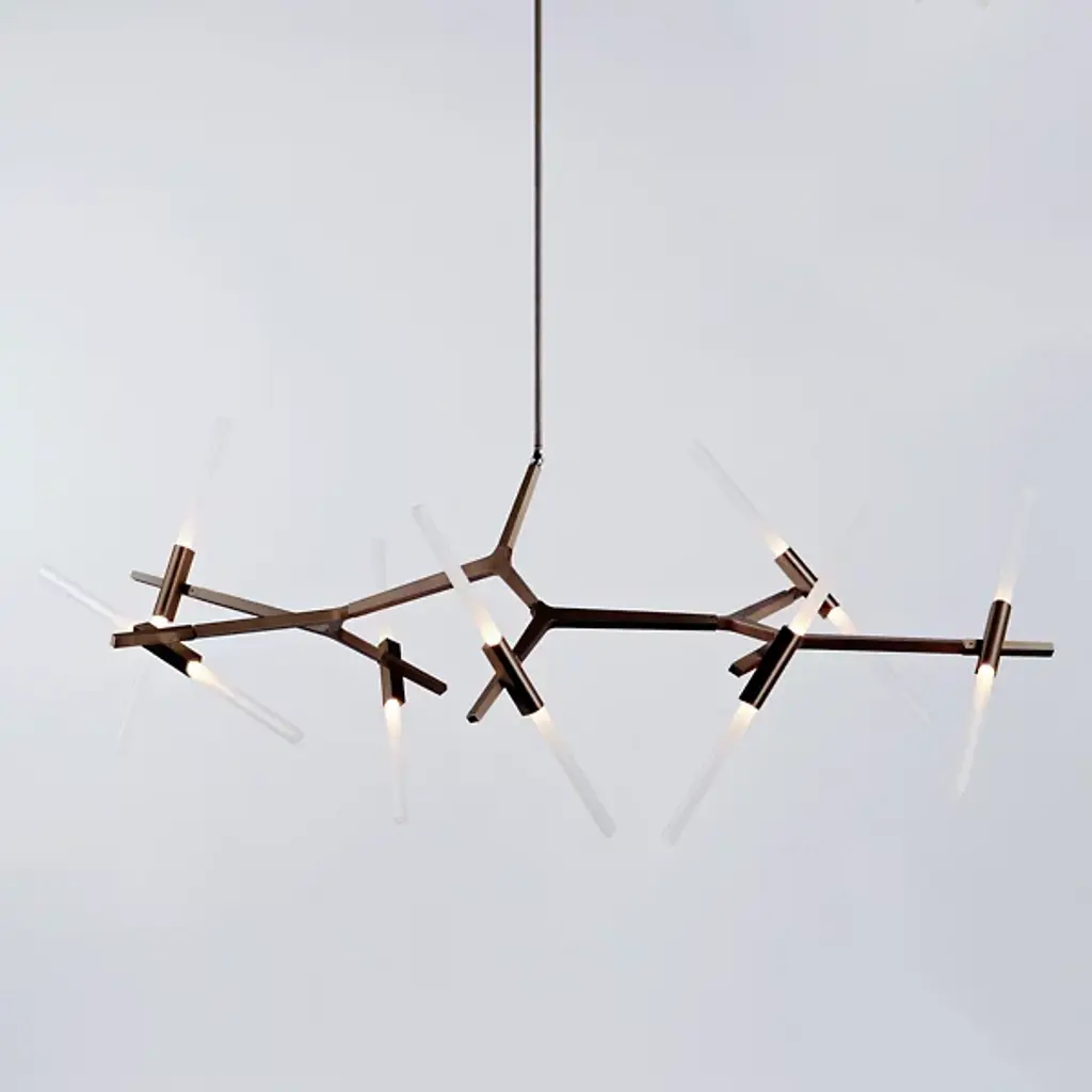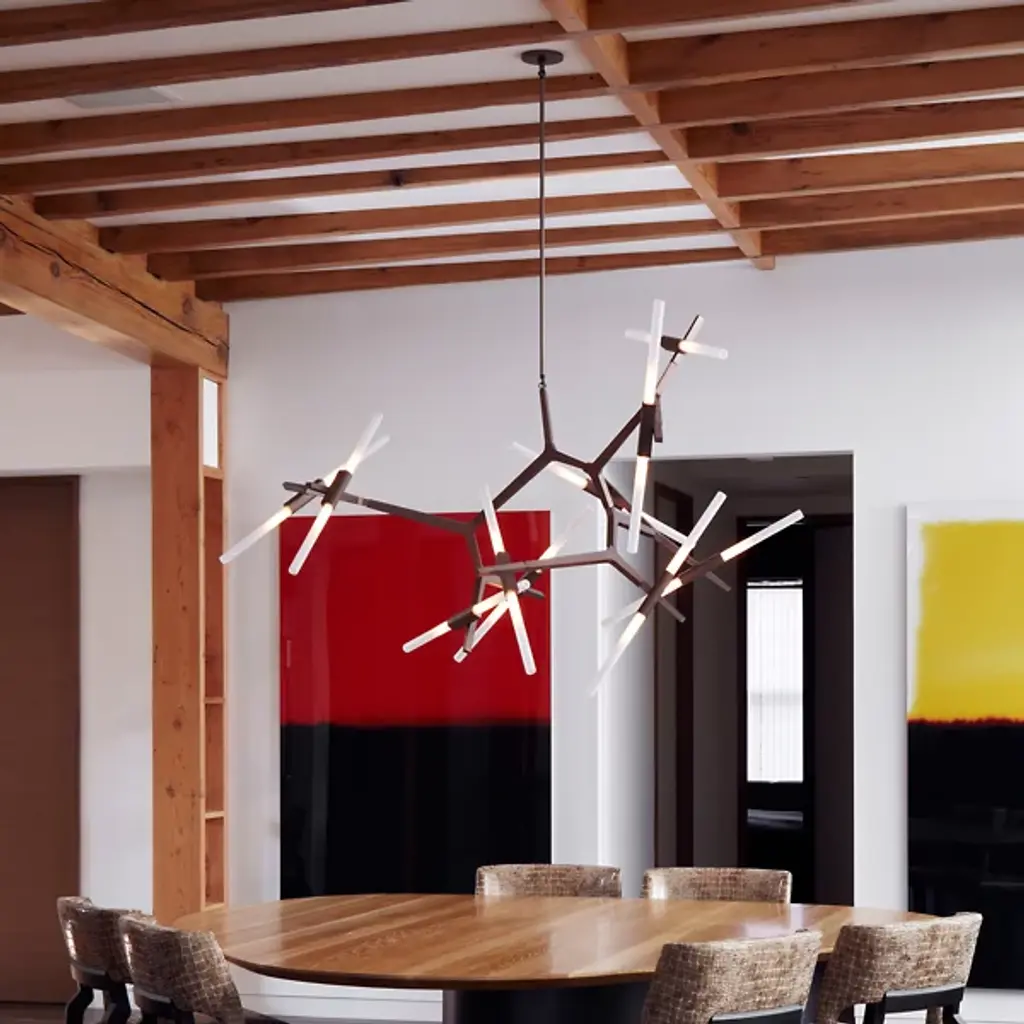 Inspired by the fictional character named Agnes, who worked during the Gold Rush in California in 1849, the Agnes 14-Light Chandelier by Roll & Hill is a rustic piece that uses long branch-like pieces of aluminum to piece together sharp shards of glass. The chandelier combines beautiful metallic finishes with different shapes of glass that bring together a uniform look. In memory of candles hanging around Agnes’ space, the glass shades create indirect ambient lighting perfect for dining rooms and living rooms.