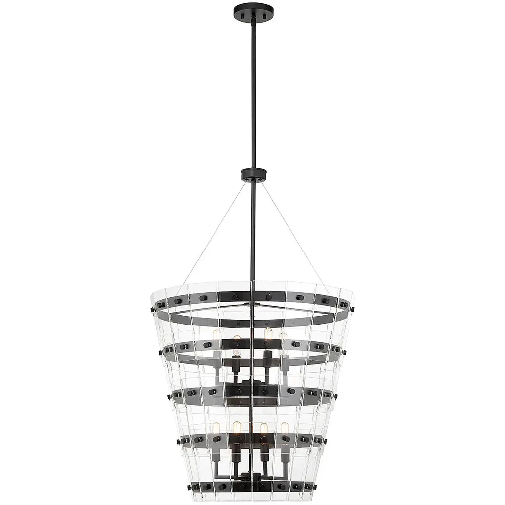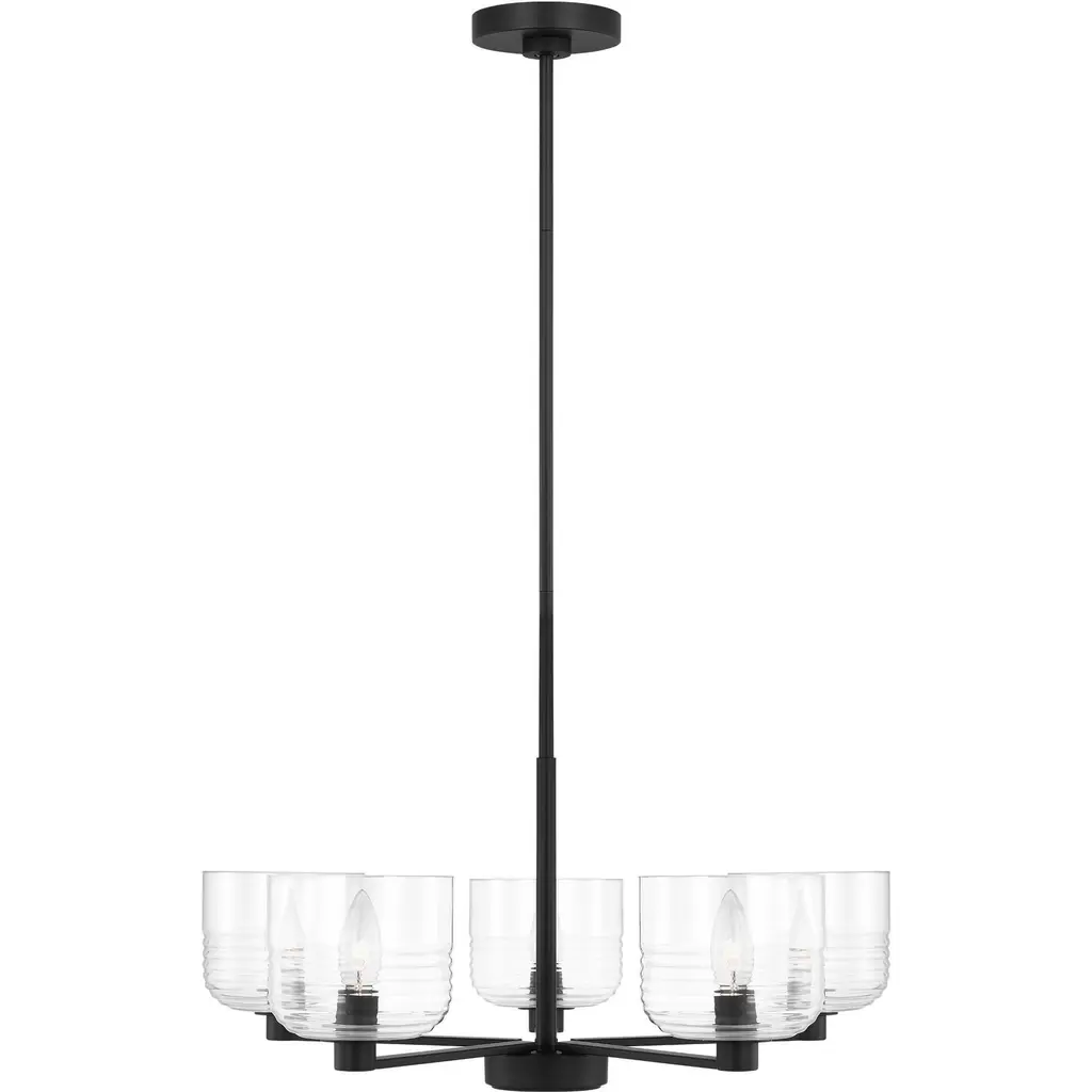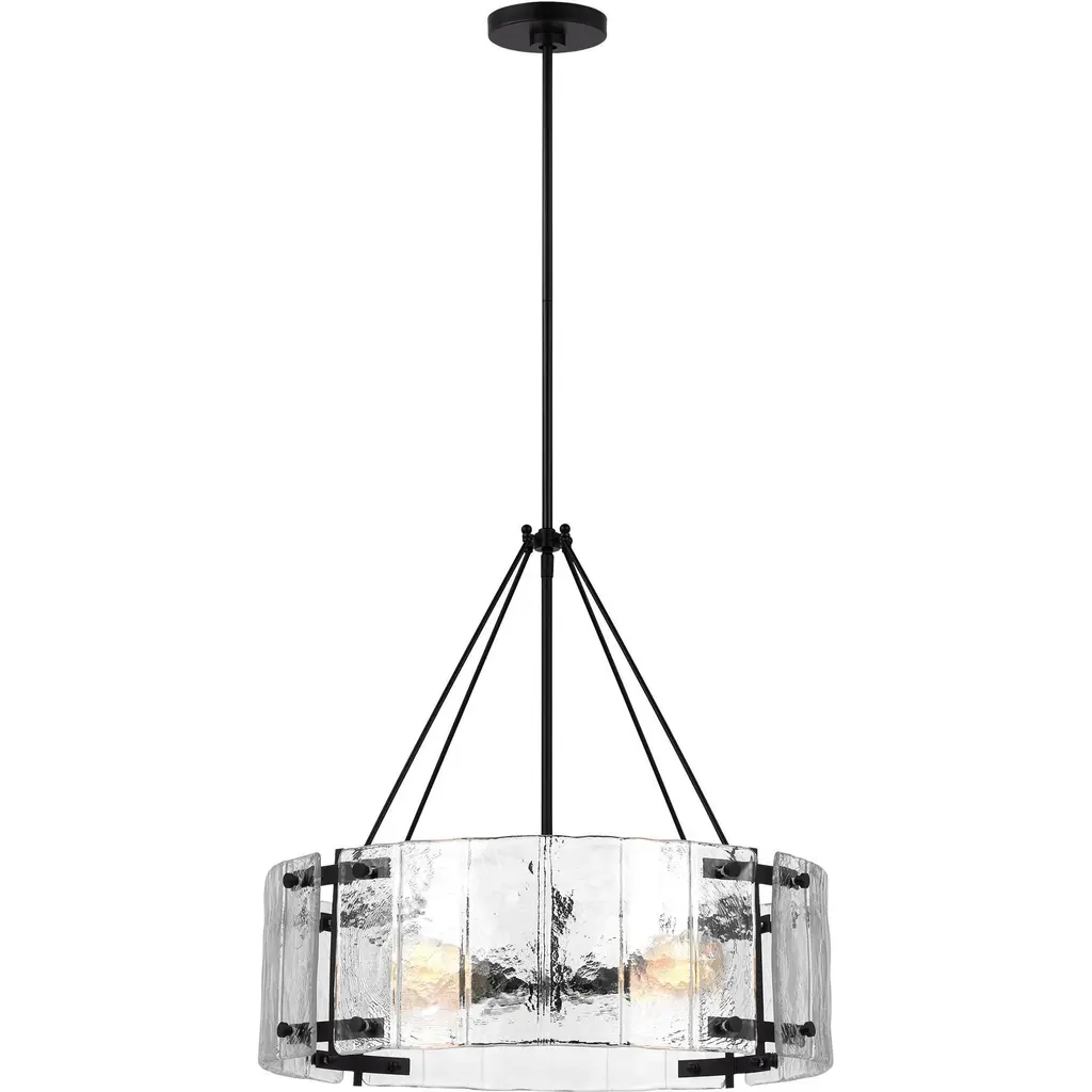 Clean and crisp, The Calvert series by Alexa Hampton is the perfect blend of function and beauty. Light flows freely through the Clear Textured glass shade while the rounded corners bring out the softness. Available as a medium chandelier with Aged Iron, Burnished Brass, or Polished Nickel finishes.