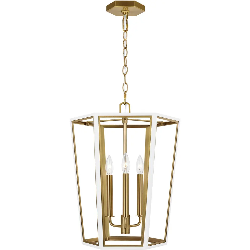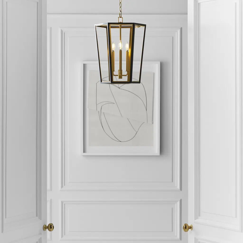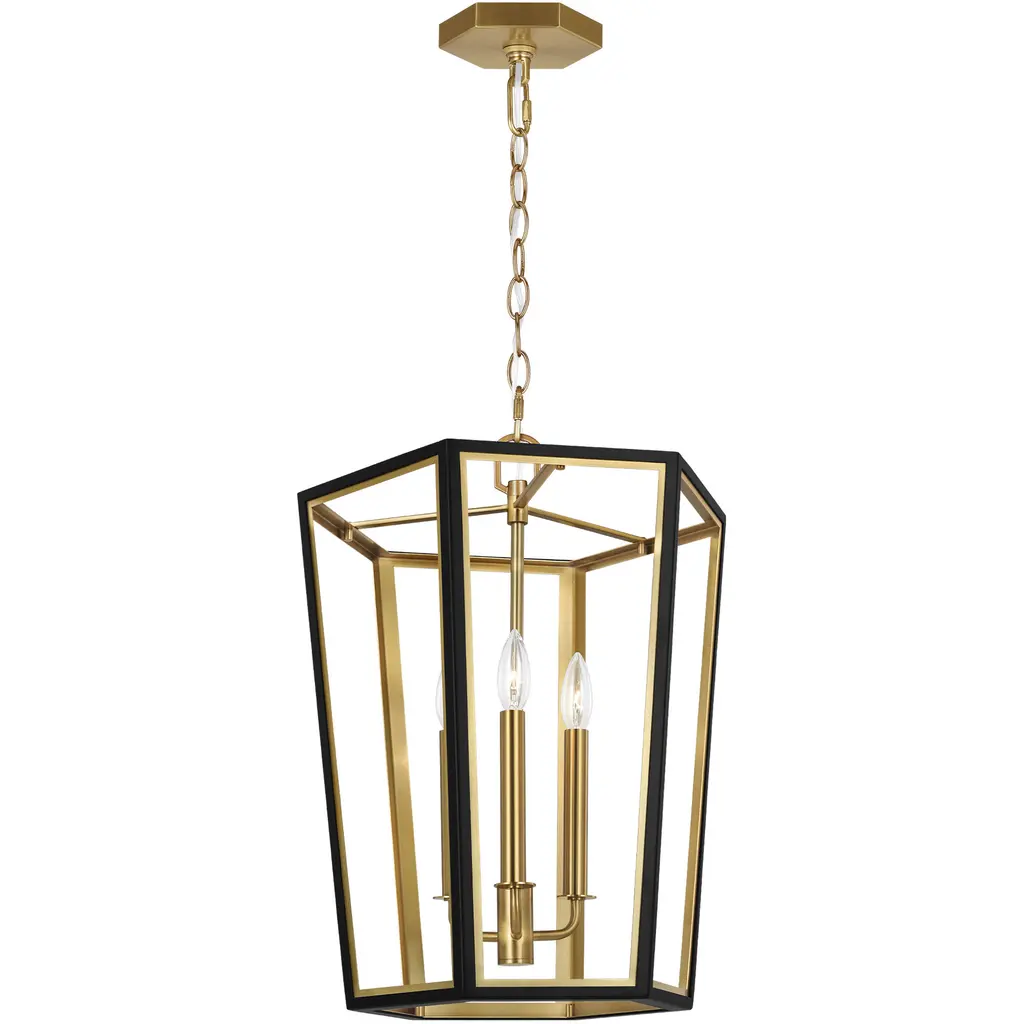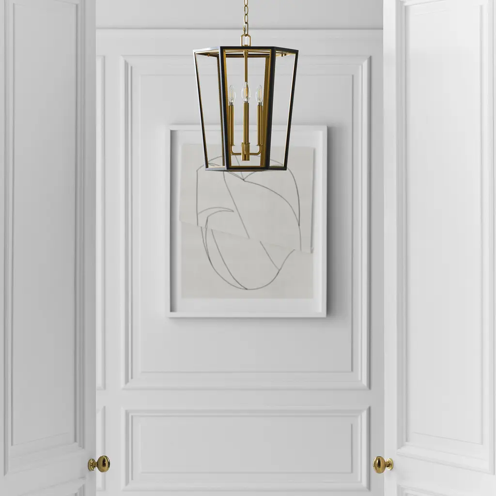 The Curt Three Light Lantern by Alexa Hampton is a modern take on an antique lantern. Elegantly crafted of steel with a Matte White or Midnight Black finish and accented with golden details. A stunning Hexagon shaped hub adds drama to the design.