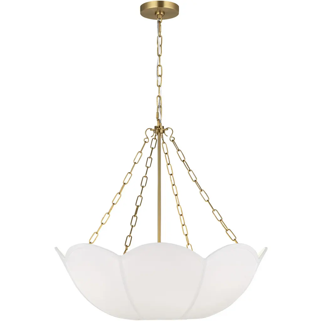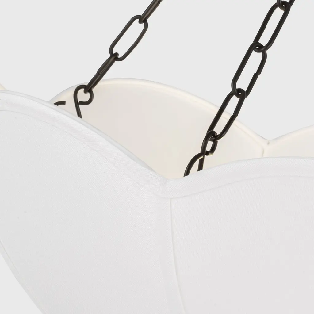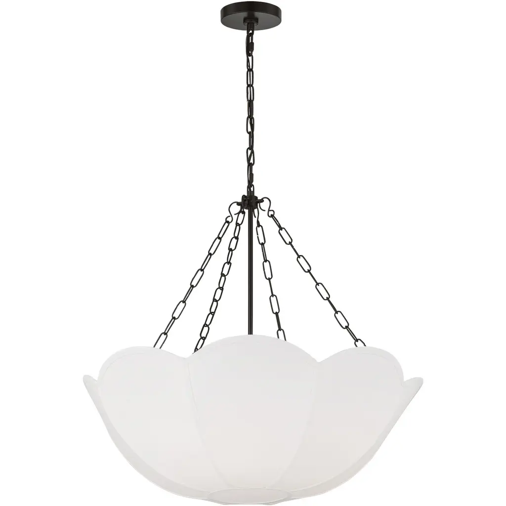 Reminiscent of a spring tulip, the Stassi series by Alexa Hampton updates Art Nouveau inspiration with a modern aesthetic. The scalloped basket silhouette is completed by the contrast of metal chain and white linen. The chandelier will create a harmonious statement hanging in a living room, dining room or bedroom.