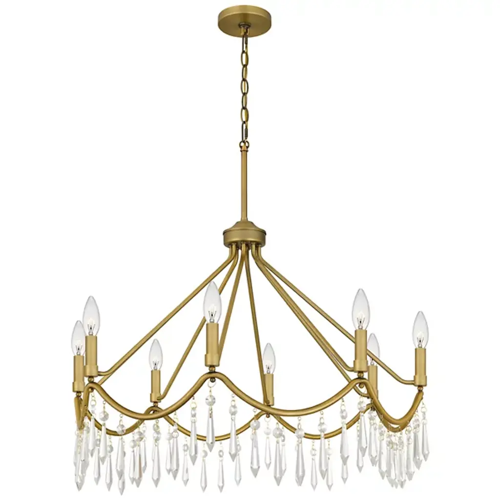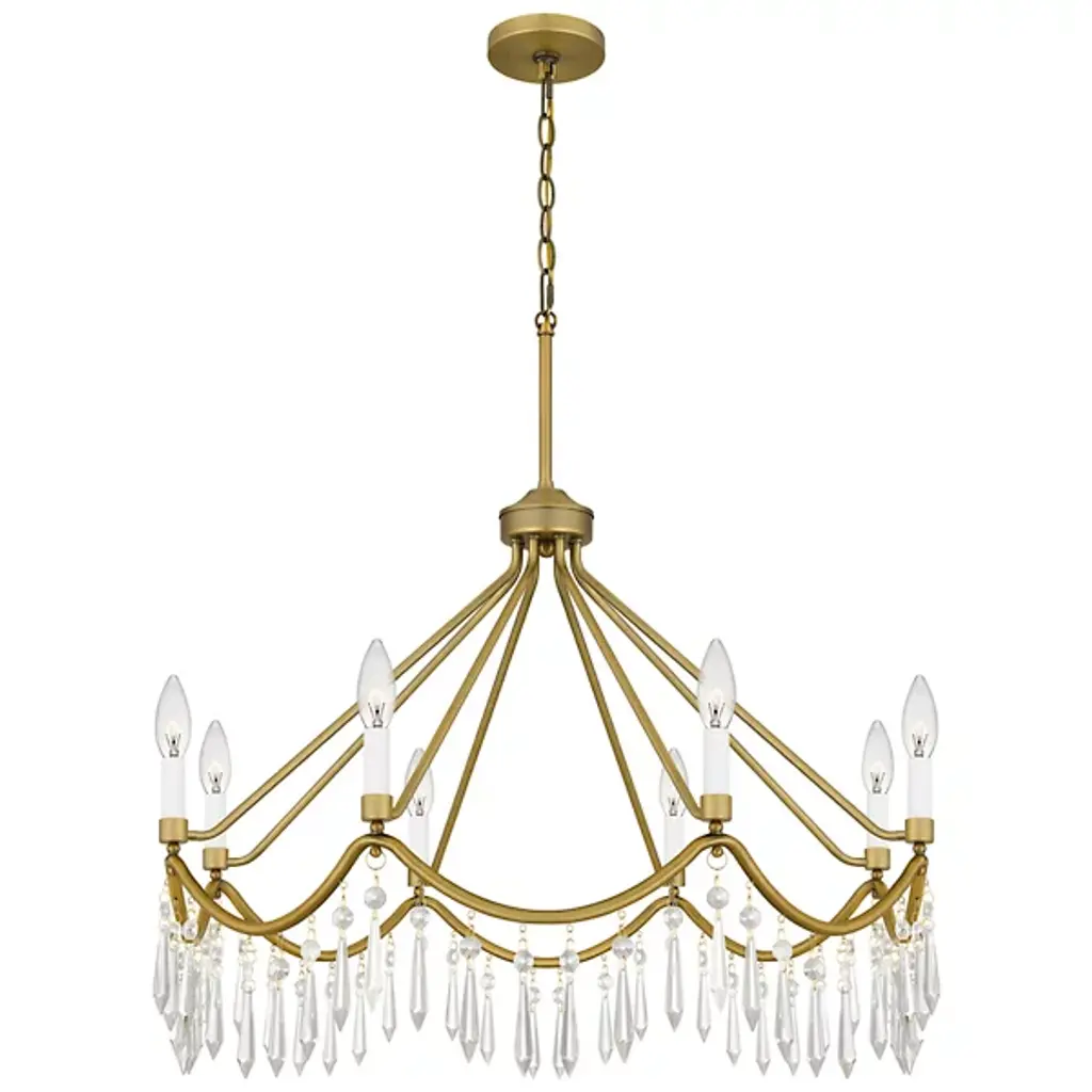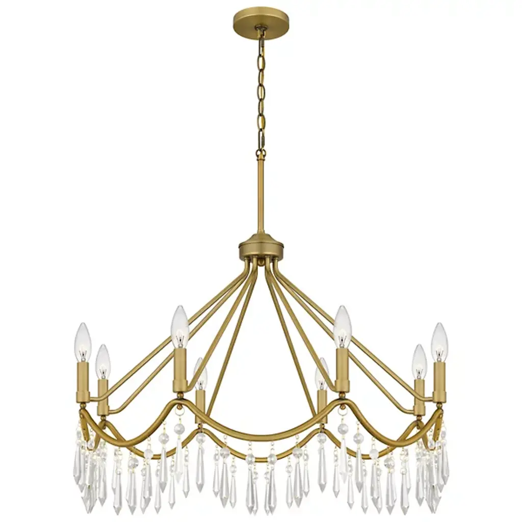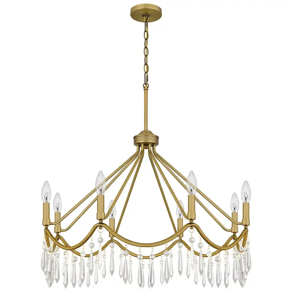 Experience the captivating allure of the Airedale Chandelier from Quoizel, elevating your space with luxurious charm. Its aged brass finish and clear crystal drops exude opulence and sparkle, perfect for any room. Whether in living rooms, bedrooms, home offices, or dining areas, its elegant design offers versatile styling options. Plus, with included candle covers, customization to match your desired aesthetic is effortless. Illuminate your home with timeless elegance and sophistication.