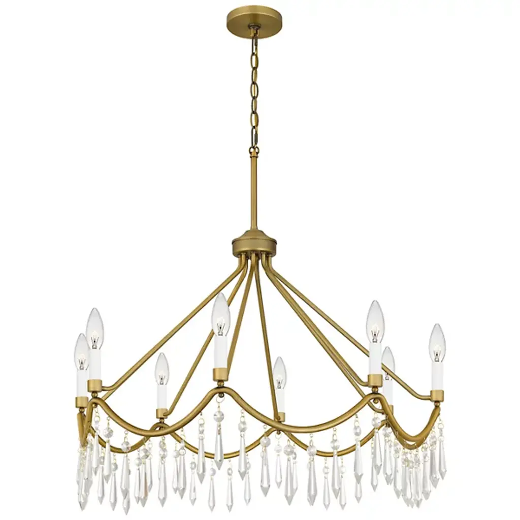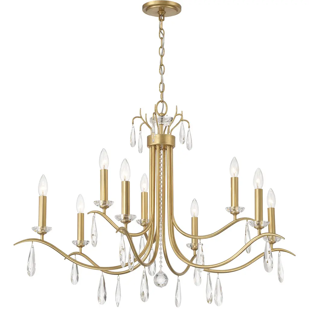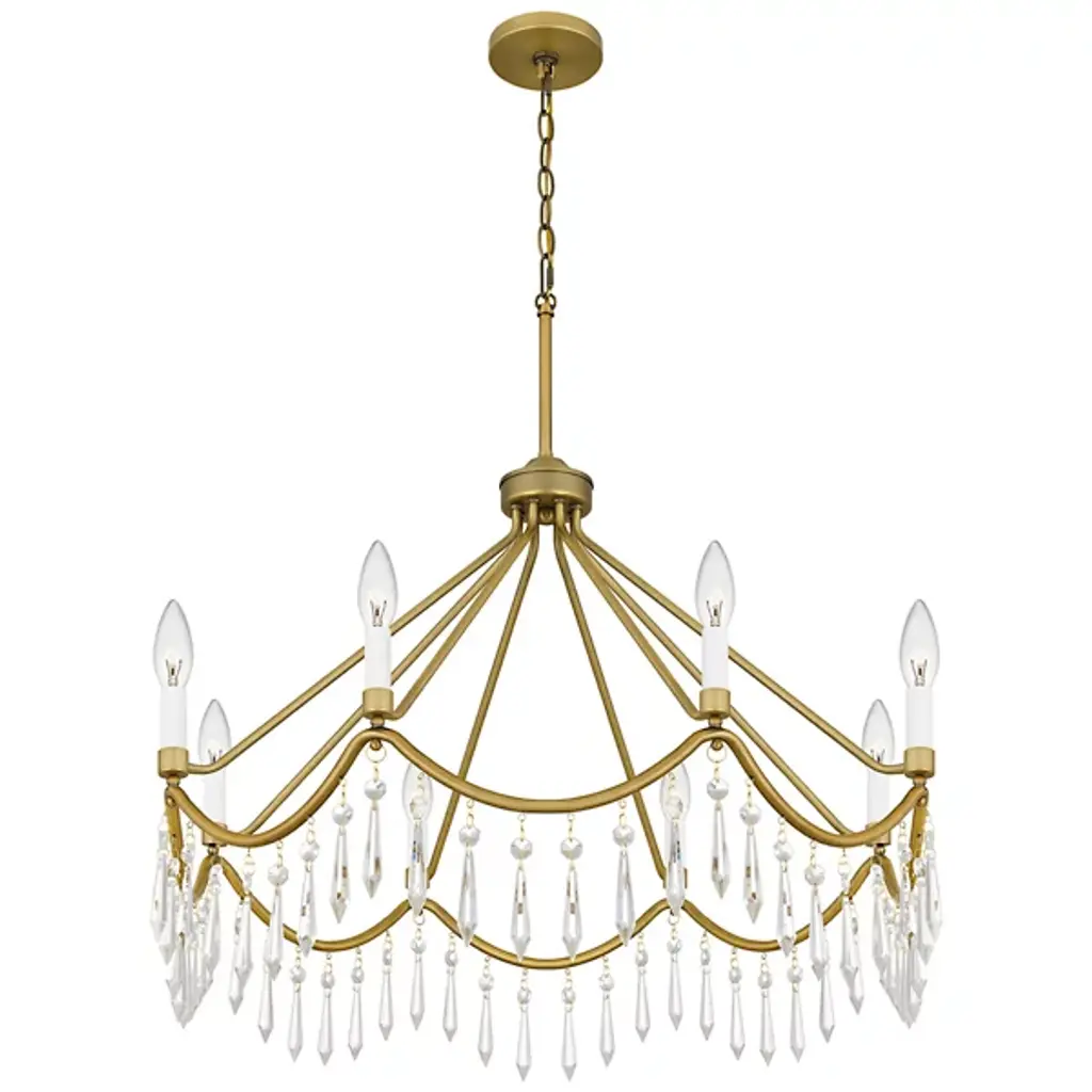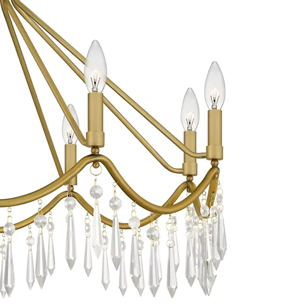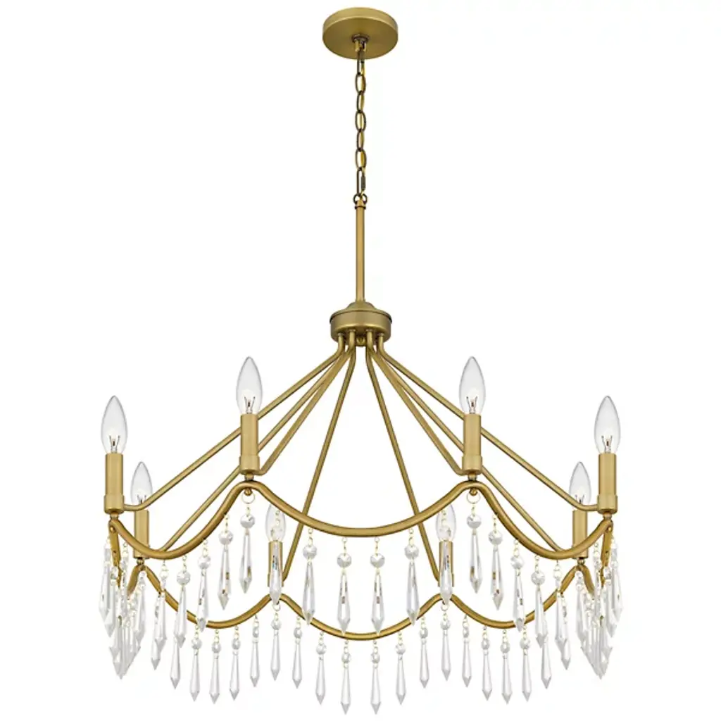 Experience the captivating allure of the Airedale Chandelier from Quoizel, elevating your space with luxurious charm. Its aged brass finish and clear crystal drops exude opulence and sparkle, perfect for any room. Whether in living rooms, bedrooms, home offices, or dining areas, its elegant design offers versatile styling options. Plus, with included candle covers, customization to match your desired aesthetic is effortless. Illuminate your home with timeless elegance and sophistication.