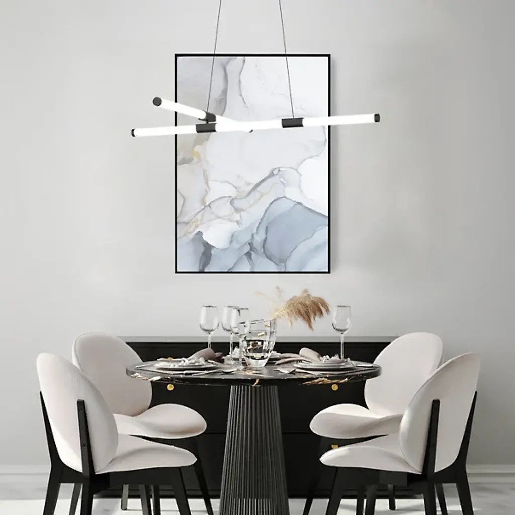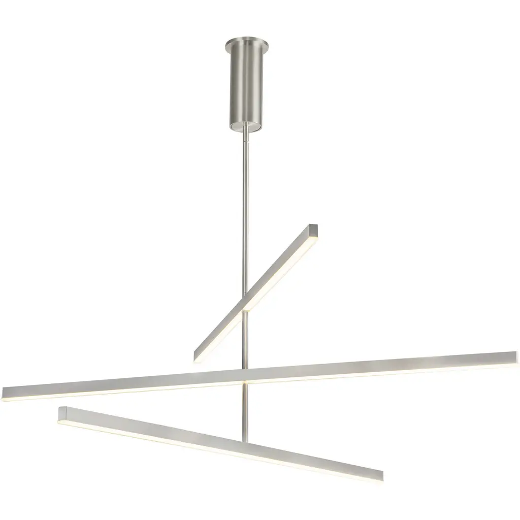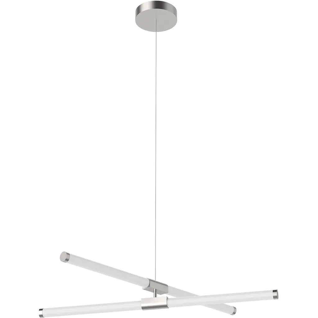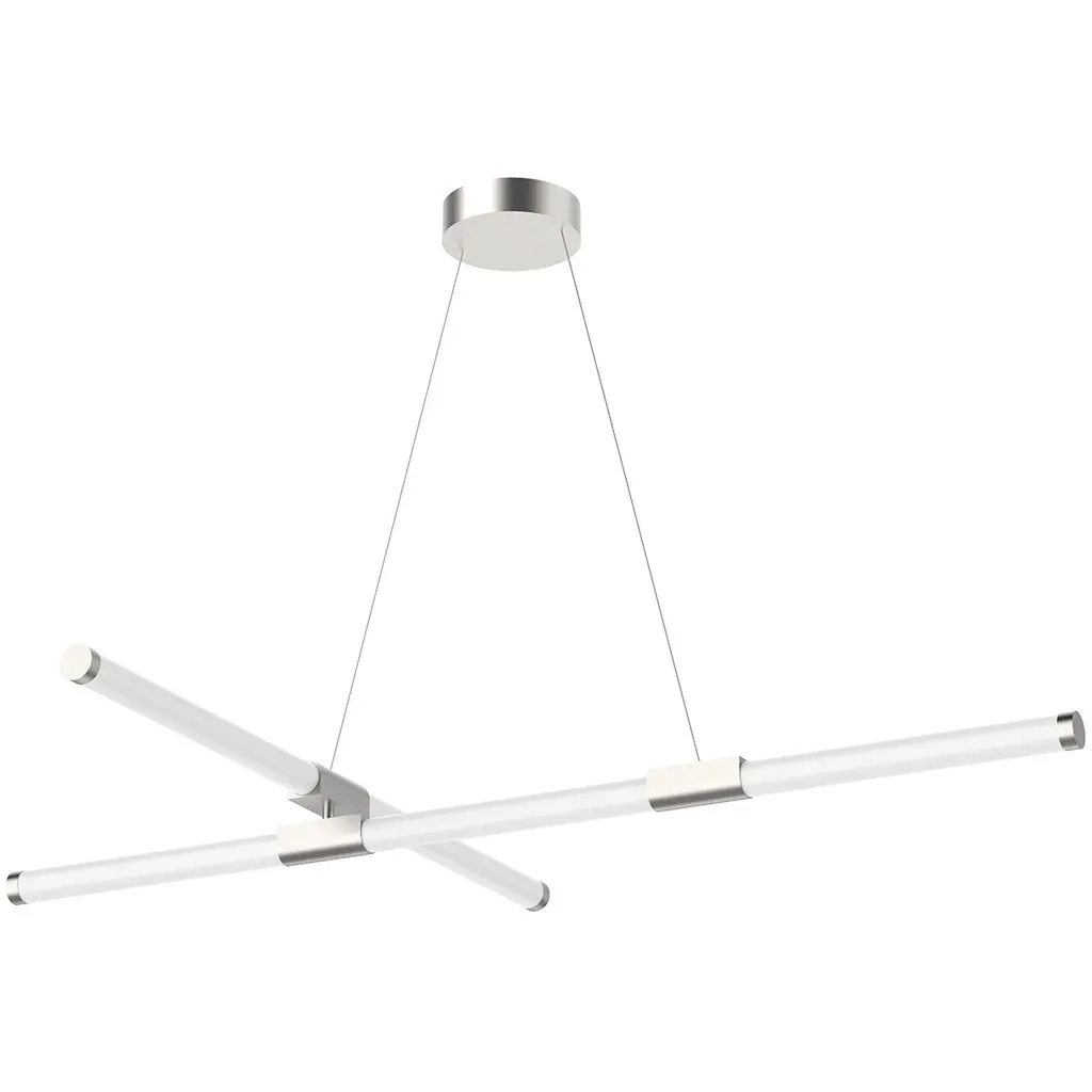 Tubes of entrancing light. Complement the refined modern personality of your rooms with the attractive Akari LED Chandelier from Kuzco Lighting. It makes itself at home with a height-adjustable suspension highlighted by an ultra-sleek cord and a compact circular canopy. With an artful quality, frosted acrylic tubes arrange themselves in an asymmetric composition. The opaque tubes bring a visual lightness that elevates intimate or open seating arrangements. Metal hardware elements fitted to the tubes give them a low-key touch of contrast. A flip of the switch brings to life an attractive silhouette. Clean LED light filters out to surround the round with a pleasant ambiance.
