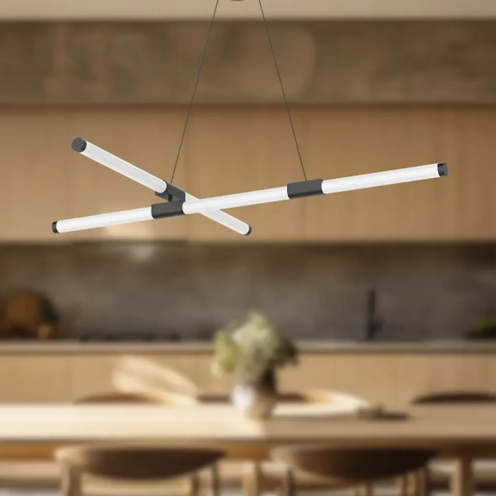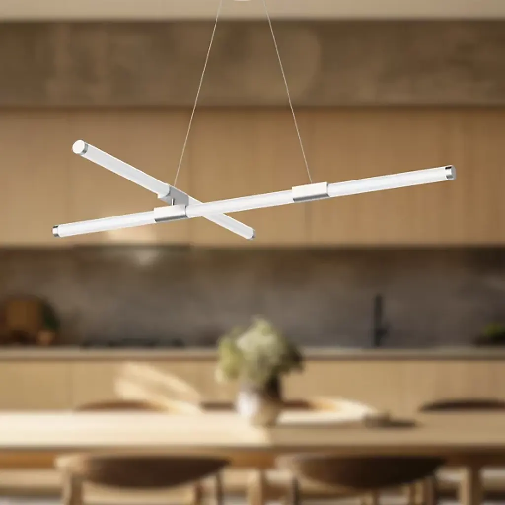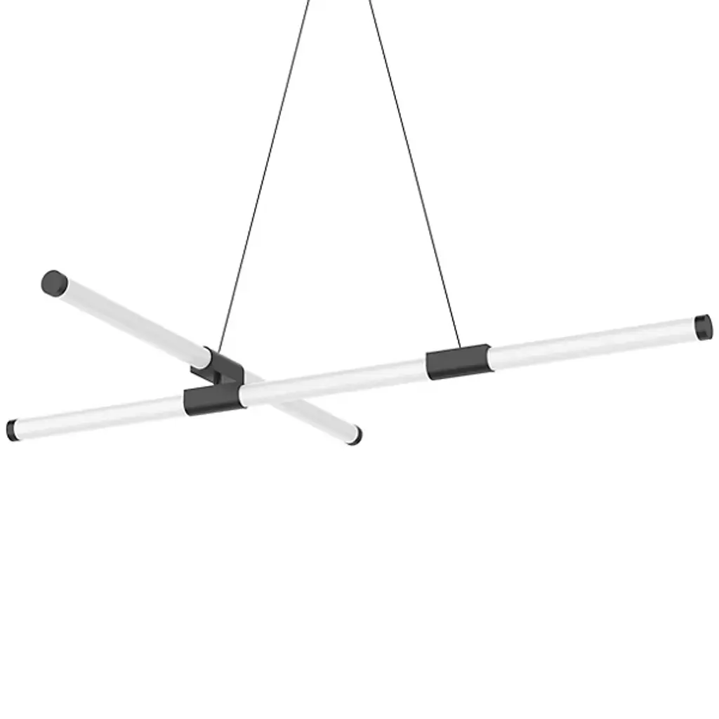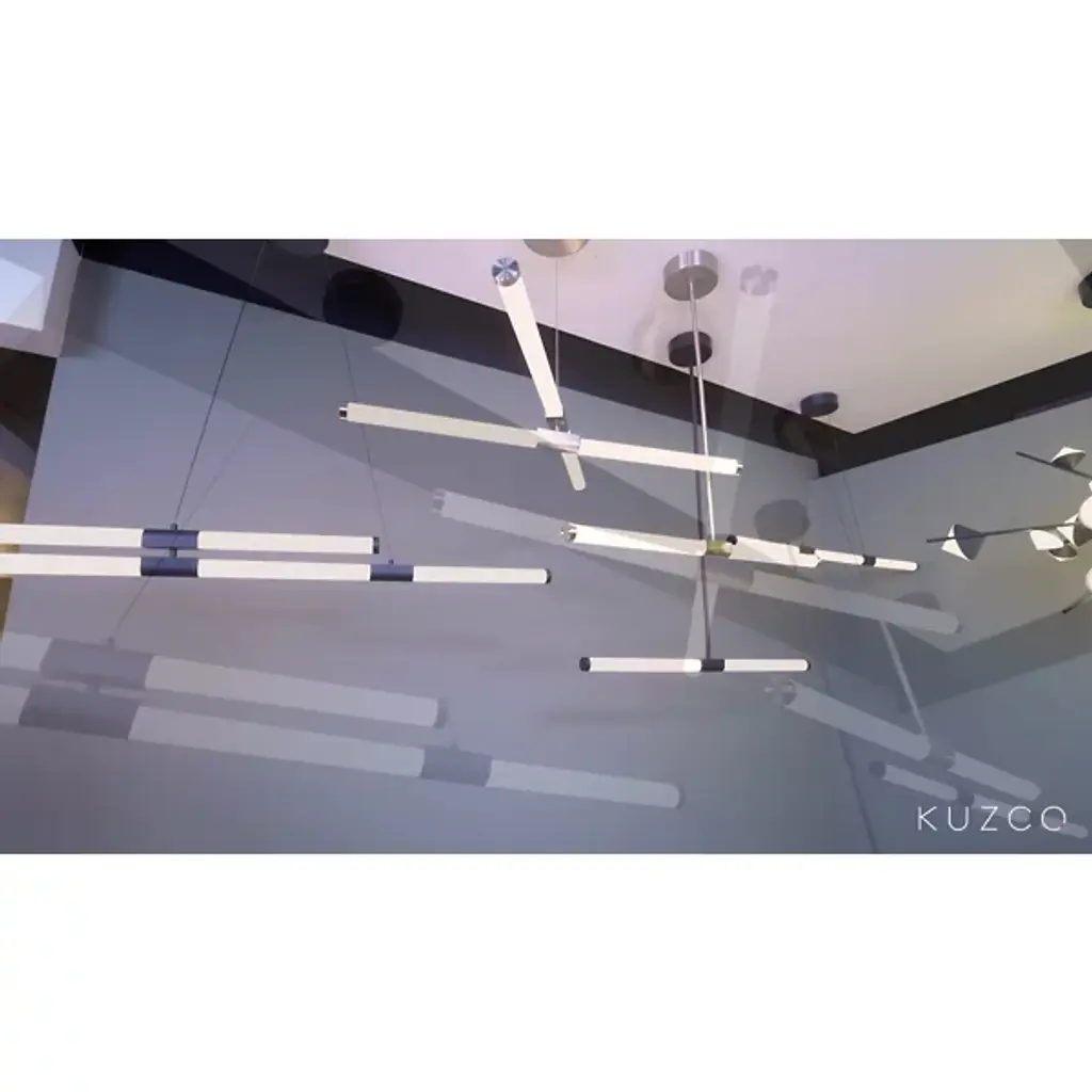 Tubes of entrancing light. Complement the refined modern personality of your rooms with the attractive Akari LED Chandelier from Kuzco Lighting. It makes itself at home with a height-adjustable suspension highlighted by an ultra-sleek cord and a compact circular canopy. With an artful quality, frosted acrylic tubes arrange themselves in an asymmetric composition. The opaque tubes bring a visual lightness that elevates intimate or open seating arrangements. Metal hardware elements fitted to the tubes give them a low-key touch of contrast. A flip of the switch brings to life an attractive silhouette. Clean LED light filters out to surround the round with a pleasant ambiance.
