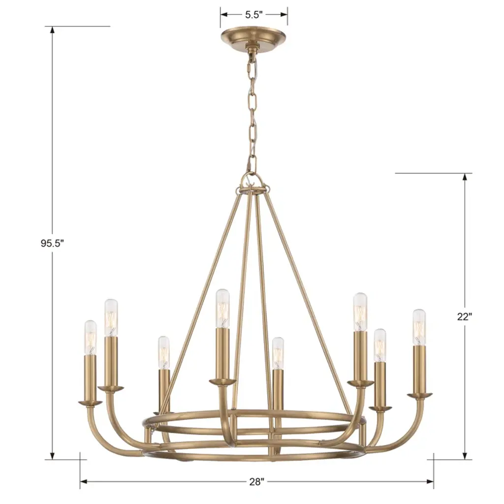 This 8-light chandelier illuminates your space with a modern take on a wagon wheel style. It's crafted from metal with a chain height-adjustable downrod and a circular, sloped-ceiling adaptable canopy. The design features a two-ring base with minimalist scooping arms that each end in a sleek sconce fixture. This chandelier is a little over 2' in diameter, so its standard size is just right for a large foyer or medium-sized dining room/living room/bedroom. Bulbs are sold separately.