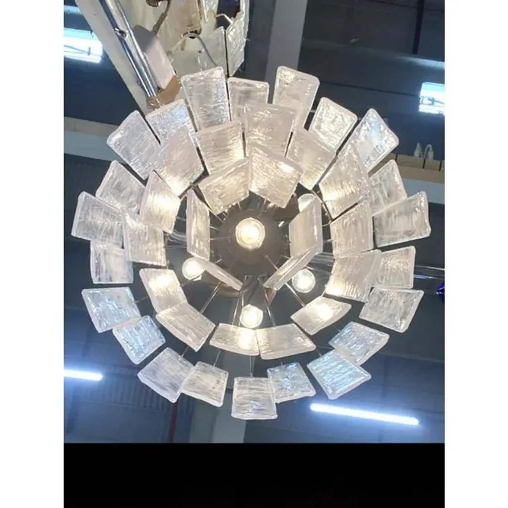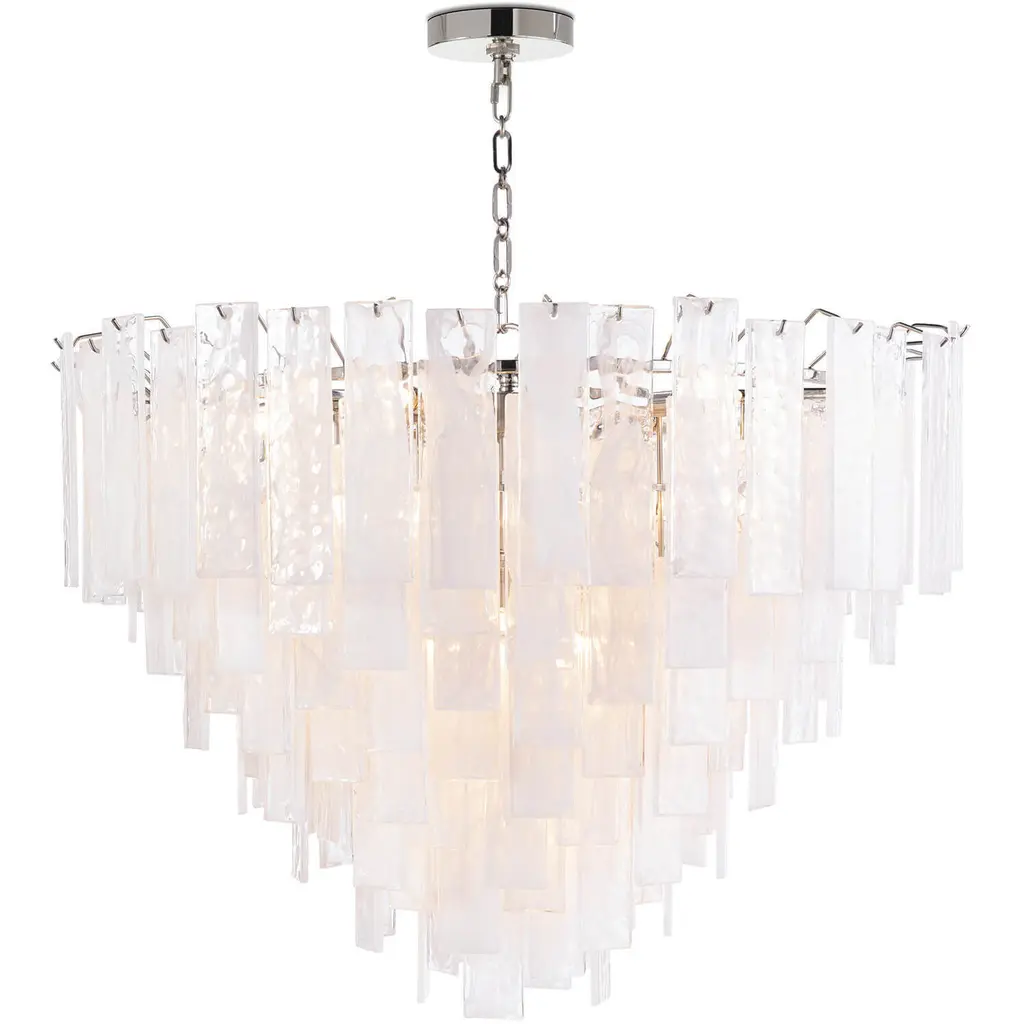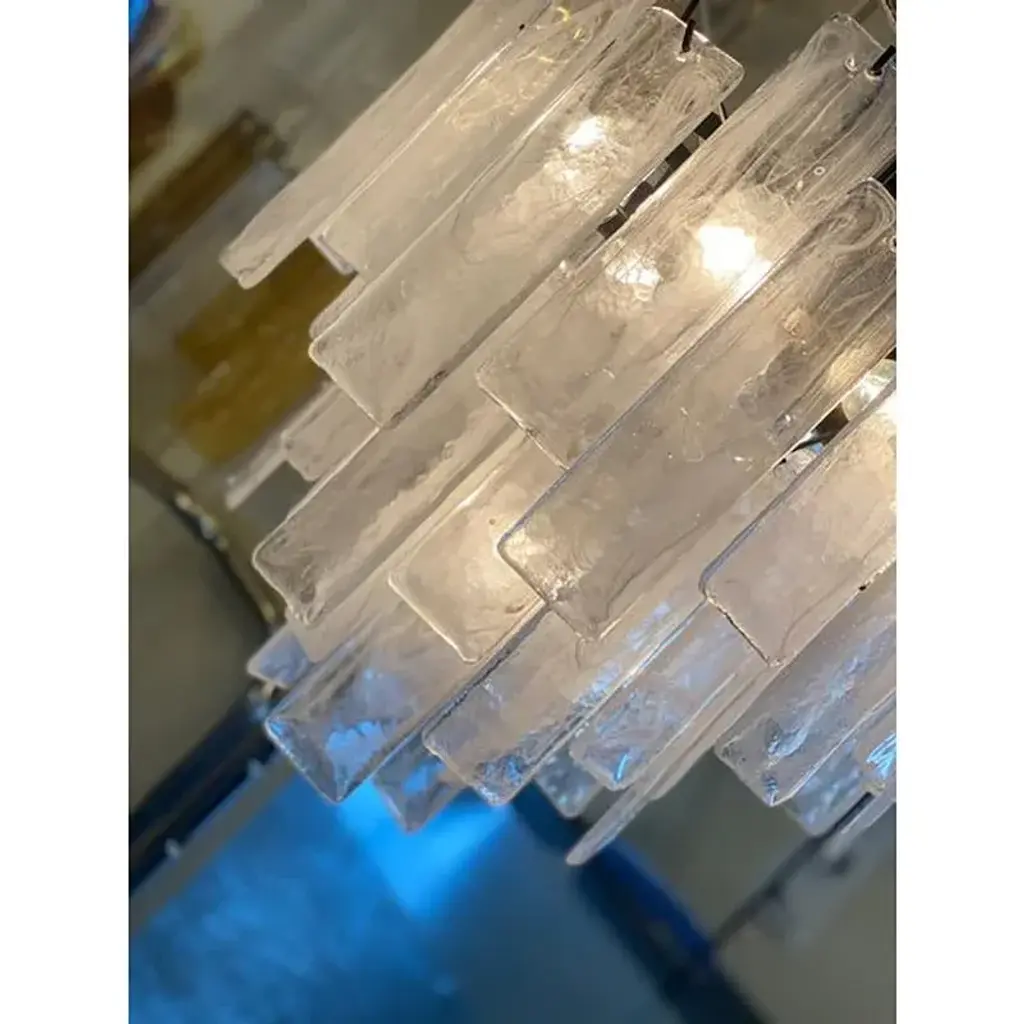 Contemporary alabastro “listelli ” murano glass chandelier. three levels of transparent and rectangular venied white strips “listelli ” elements of murano glass. entirely made in italy, fruit of murano glass of high italian know-how. Exclusive design by simoeng. dimensions (cm/in):d 60 cm h 50cm/ d 23.6″ h 19.7″ finiture: brunish metal frame spare parts are included. us plug (up to 110v).