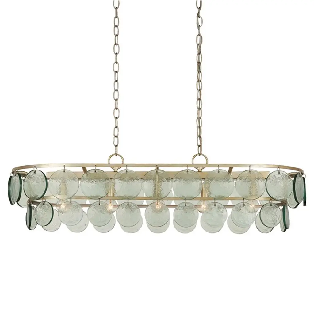 Designed in an oval shape with a clever mix of materials, the Alana chandelier makes a statement in any space. Its two-tiered, wrought-iron design is finished in silver leaf. Clear recycled glass discs dangle from each tier, offering beautiful reflectivity when the fixture is lit.