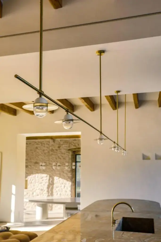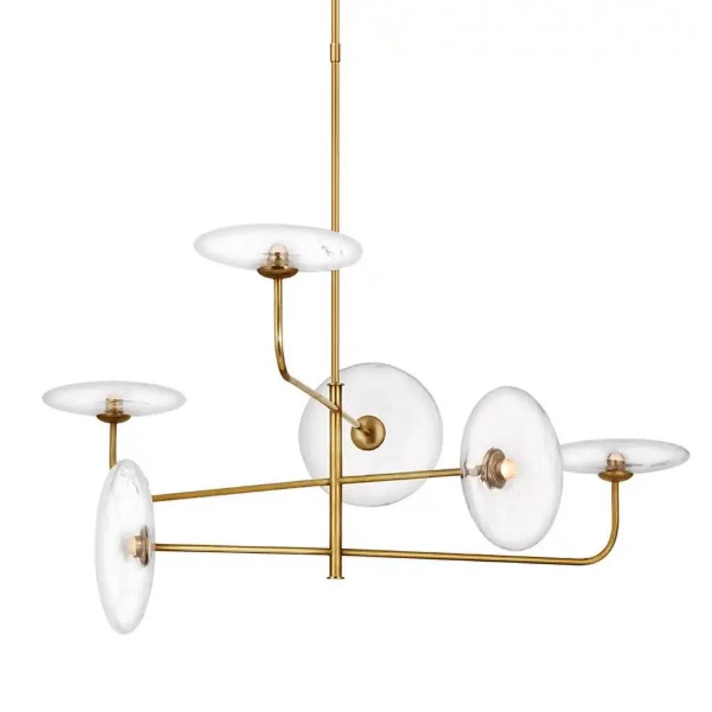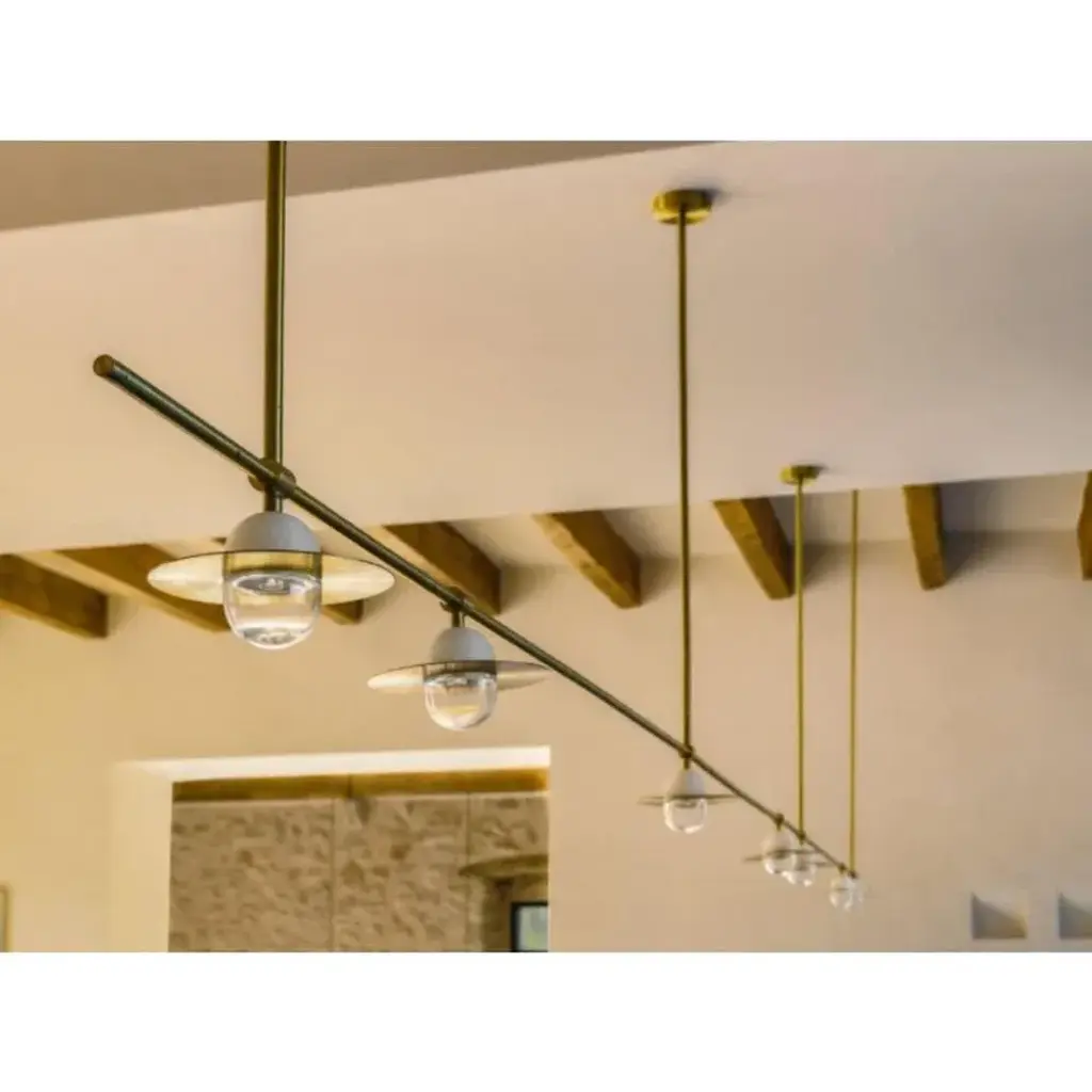 Alba chandelier by contain dimensions: d 300 x w 15 x h 100 cm (custom leght) materials: brass, 3d printed pla structure and optical lens. May be available separately in different finishes. All our lamps can be wired according to each country. If sold to the usa it will be wired for the usa for instance. up to 250v (europe/uk standard).