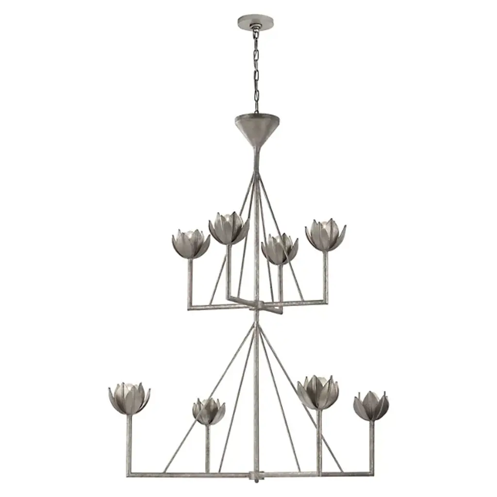 Naturally bold, inherently stylish. With its dual ranks of luminaires, the Alberto 2-Tier Chandelier by Visual Comfort Signature, formerly known as Visual Comfort, offers ample lighting performance and visual appeal to equip a large room or open-concept living space. Each of this chandelier's lights is held in an elegant cup, evoking the aesthetic of leaves or flower petals for a handsome organic look.