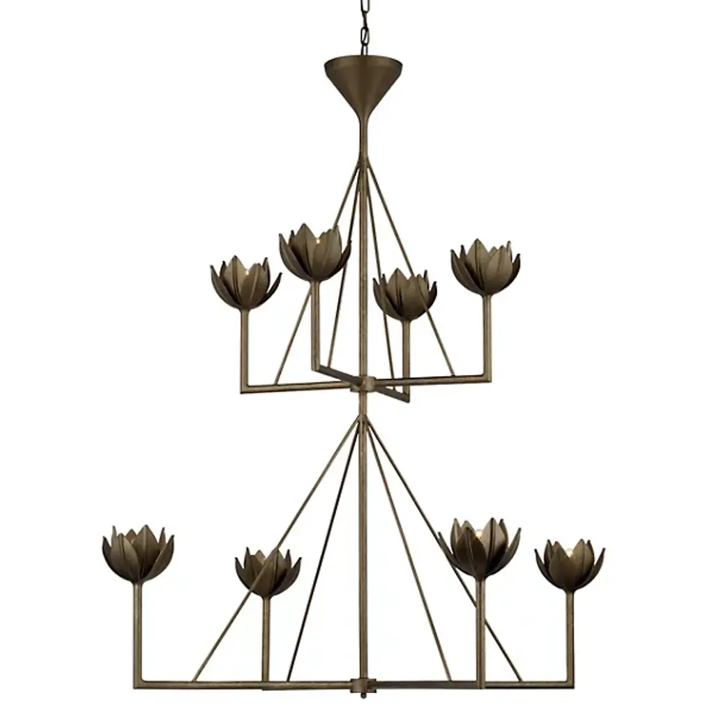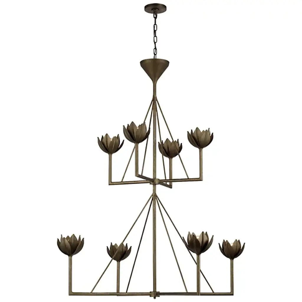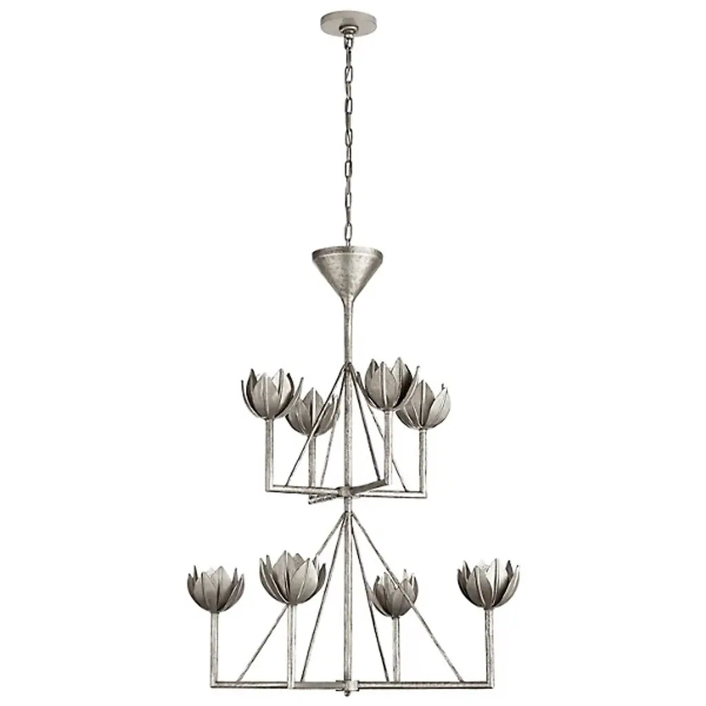 Naturally bold, inherently stylish. With its dual ranks of luminaires, the Alberto 2-Tier Chandelier by Visual Comfort Signature, formerly known as Visual Comfort, offers ample lighting performance and visual appeal to equip a large room or open-concept living space. Each of this chandelier's lights is held in an elegant cup, evoking the aesthetic of leaves or flower petals for a handsome organic look.