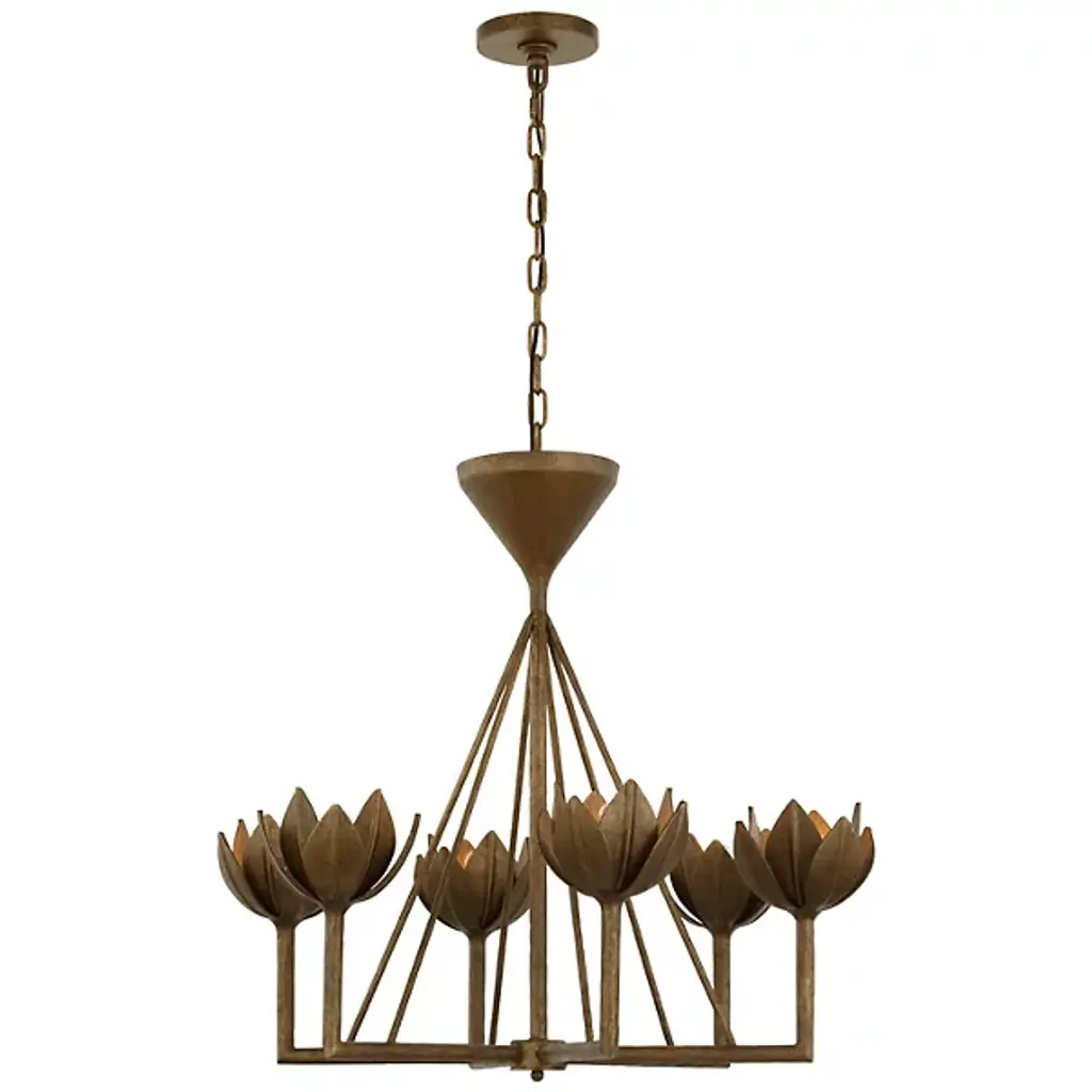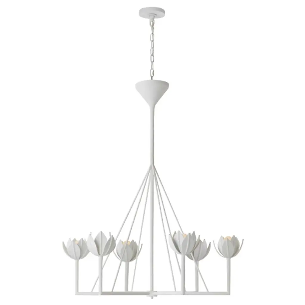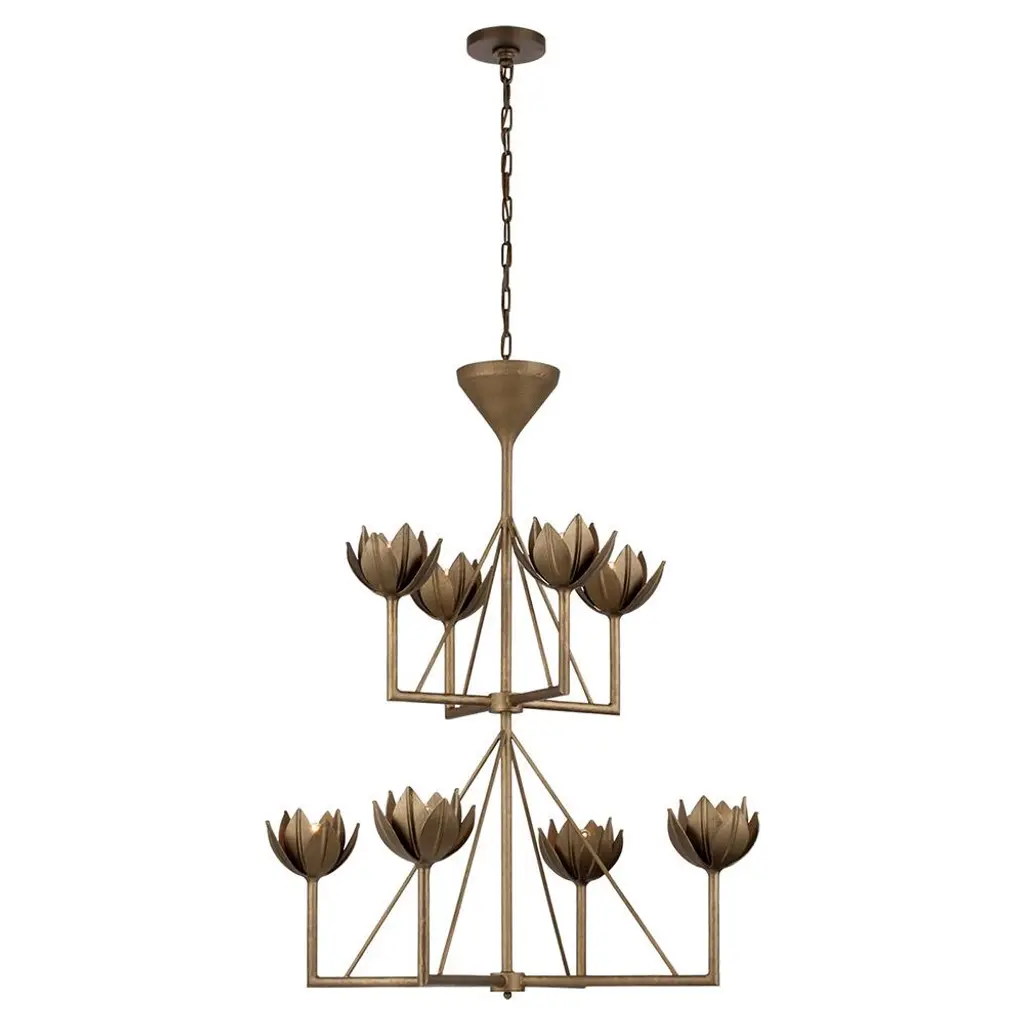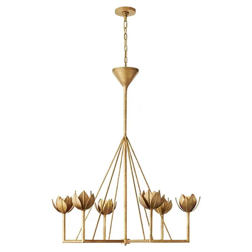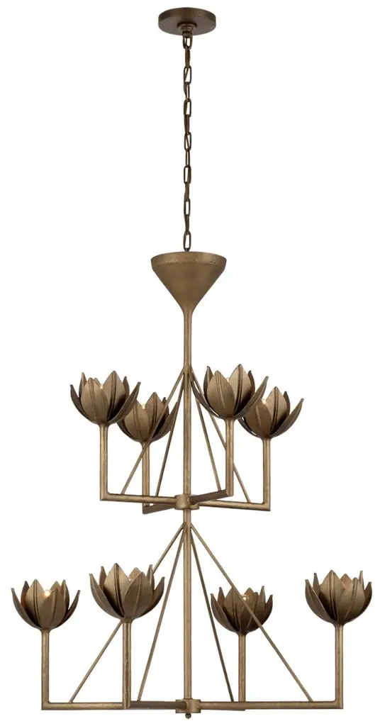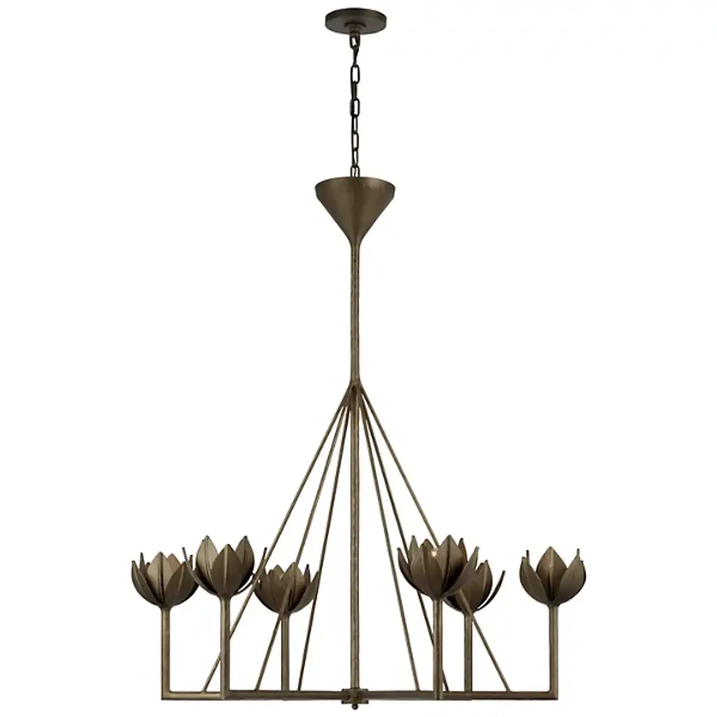 Growing strong, with a stark, stylish spirit. The Alberto Chandelier from Visual Comfort Signature, formerly known as Visual Comfort, offers an artistic enhancement to high-ceilinged spaces, starting with a sleek disc canopy and medium weight chain that support a conical metal hub below. This hub acts as the anchor for a sweeping, impactful structure, extending a series of slender, elegant braces below to support a series of upright stems. Each stem is then accentuated by stylized metal petals that bloom around candelabra lamps, obscuring glare and adding a vibrant natural element to an already sculptural fixture.