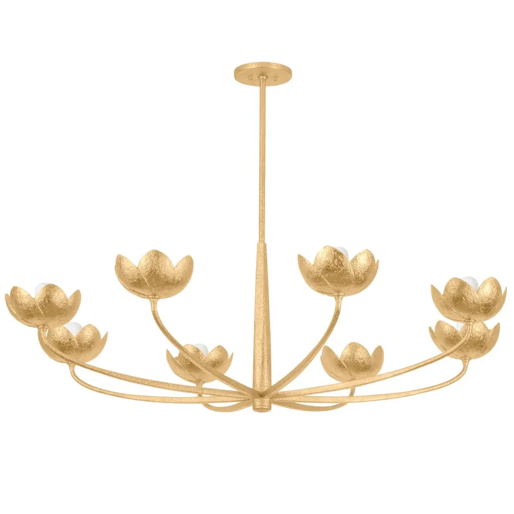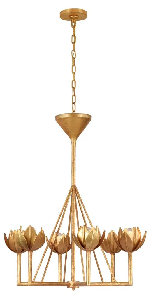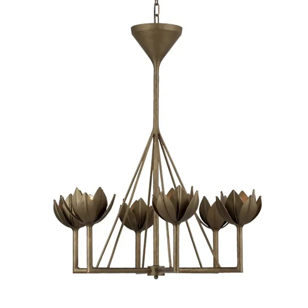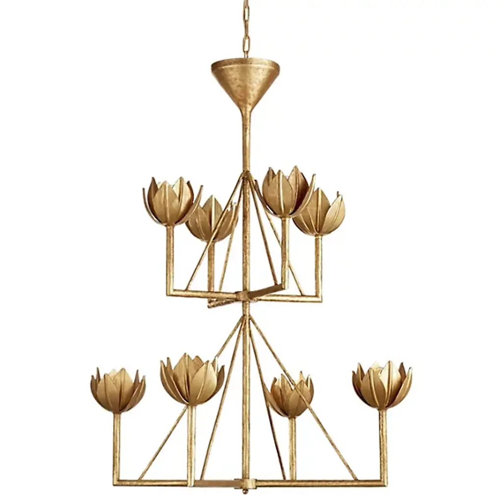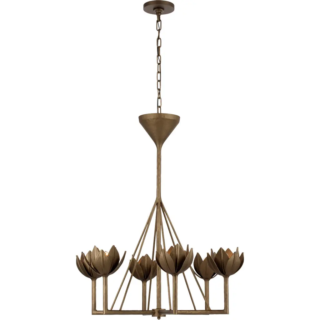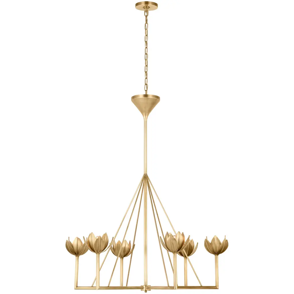 Growing strong, with a stark, stylish spirit. The Alberto Chandelier from Visual Comfort Signature, formerly known as Visual Comfort, offers an artistic enhancement to high-ceilinged spaces, starting with a sleek disc canopy and medium weight chain that support a conical metal hub below. This hub acts as the anchor for a sweeping, impactful structure, extending a series of slender, elegant braces below to support a series of upright stems. Each stem is then accentuated by stylized metal petals that bloom around candelabra lamps, obscuring glare and adding a vibrant natural element to an already sculptural fixture.