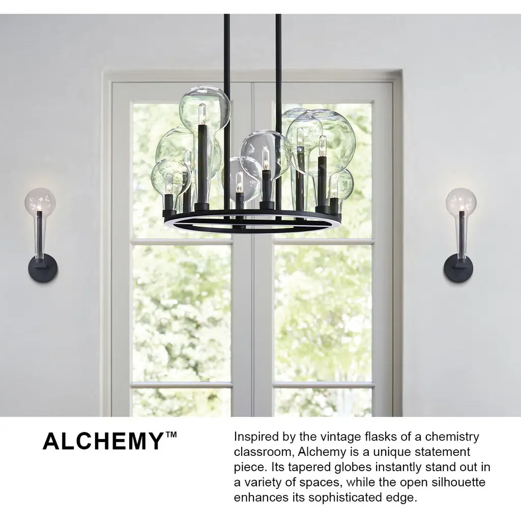 Inspired by the vintage flasks of a chemistry classroom, Alchemy is a unique statement piece. Its tapered globes instantly stand out in a variety of spaces, while the open silhouette enhances its sophisticated edge.