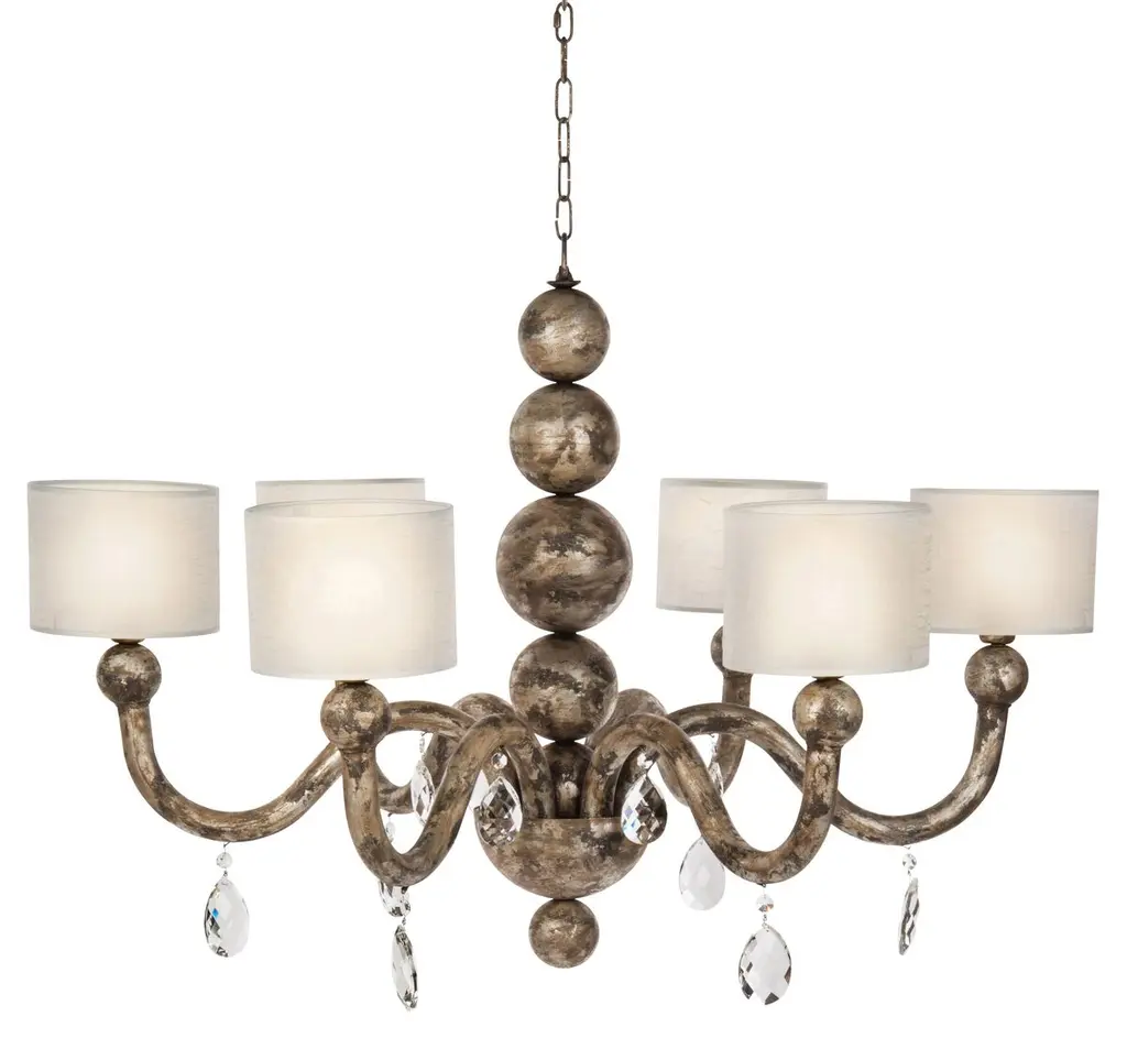 Burnished gold metal with golden teak crystal leaves and a silken champagne sheer fabric shade.