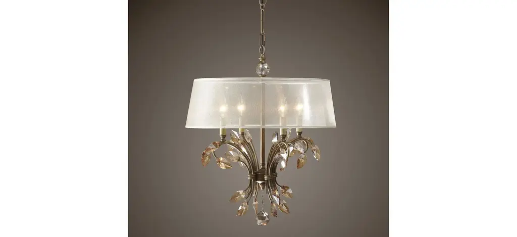 Burnished gold metal with golden teak crystal leaves and a silken champagne sheer fabric shade.