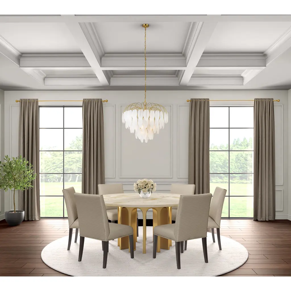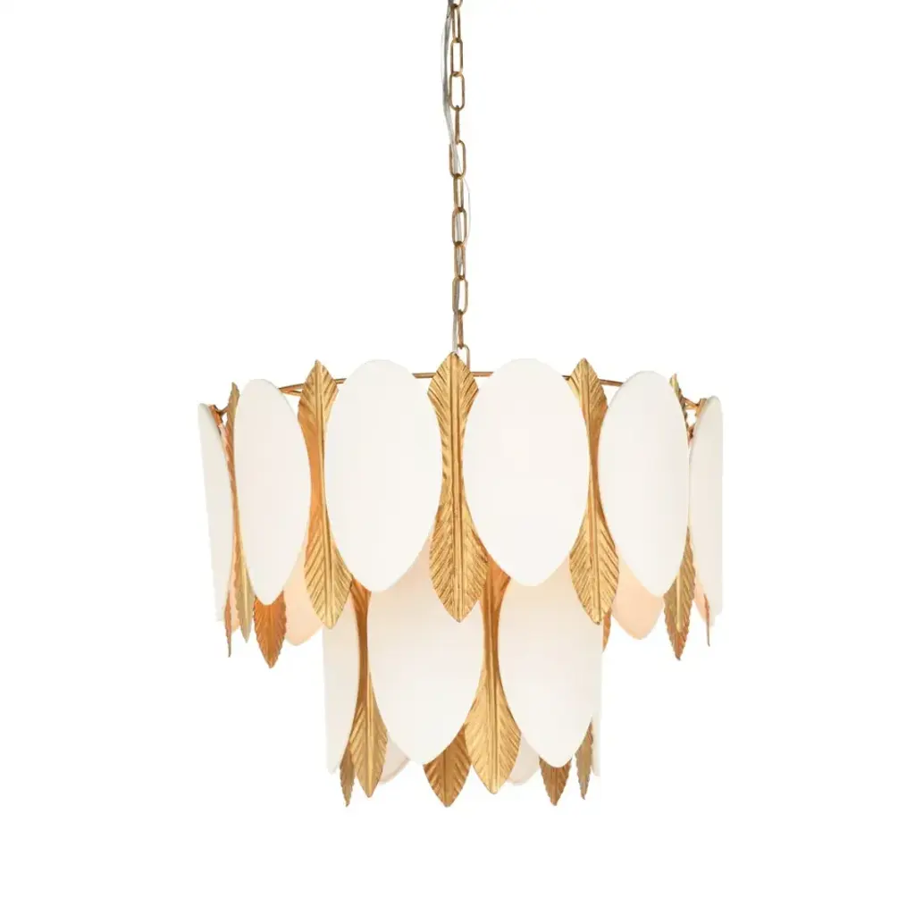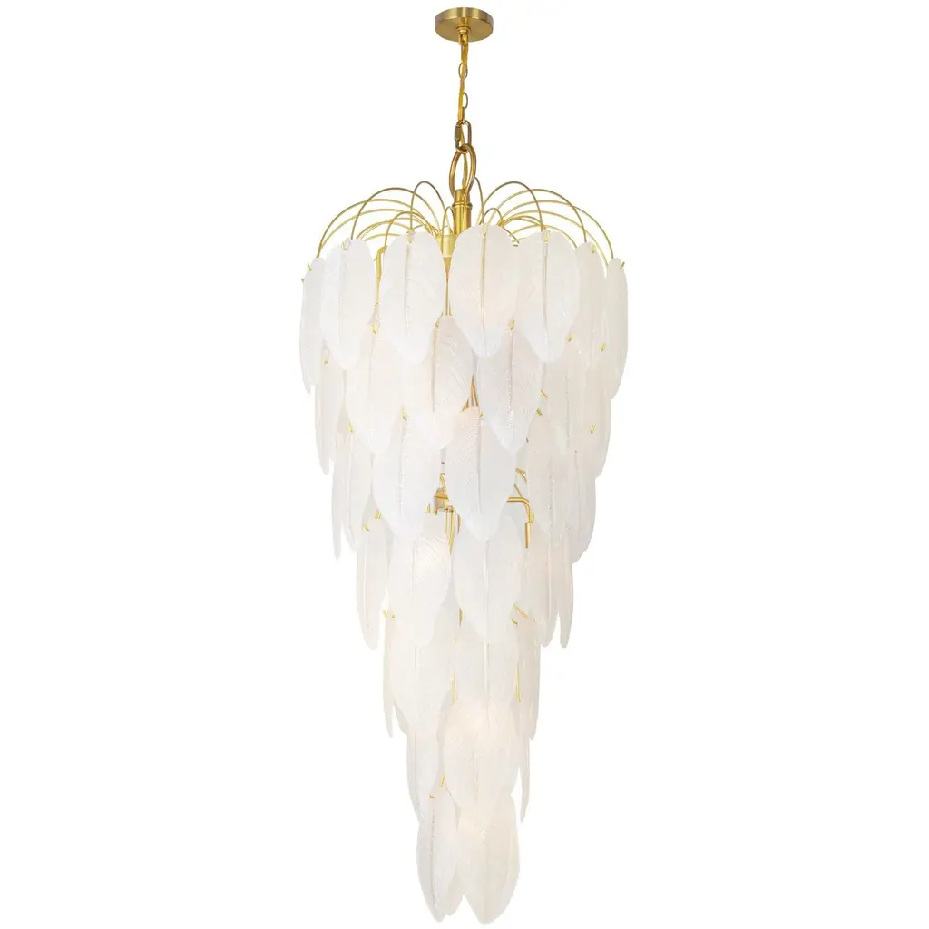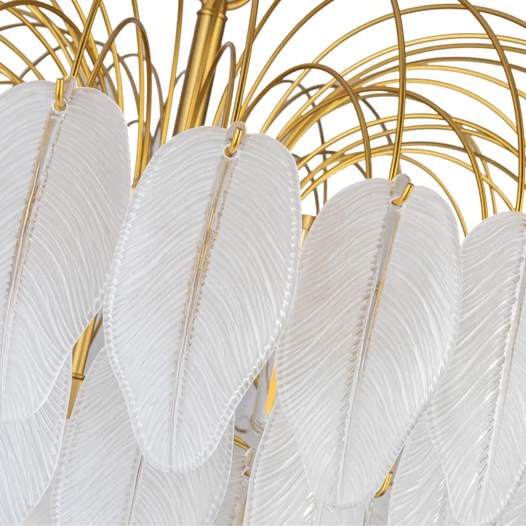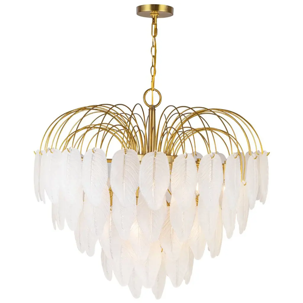 The Alessia collection boasts a captivating design featuring delicate glass leaves suspended from a brilliant airy brass frame. The unique glassware diffuses light casting a mesmerizing and enchanting ambiance in any space. With its harmonious blend of timeless brass elegance and nature-inspired elements, this collection seamlessly combines sophistication and organic beauty, making it a striking centerpiece for any room.
