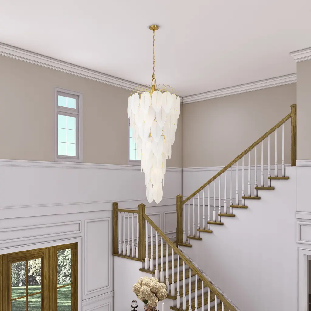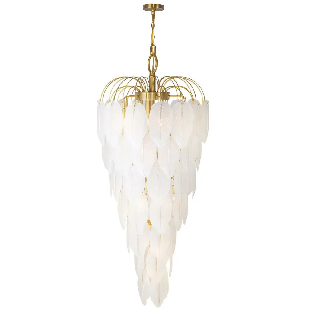 The Alessia collection boasts a captivating design featuring delicate glass leaves suspended from a brilliant airy brass frame. The unique glassware diffuses light casting a mesmerizing and enchanting ambiance in any space. With its harmonious blend of timeless brass elegance and nature-inspired elements, this collection seamlessly combines sophistication and organic beauty, making it a striking centerpiece for any room.