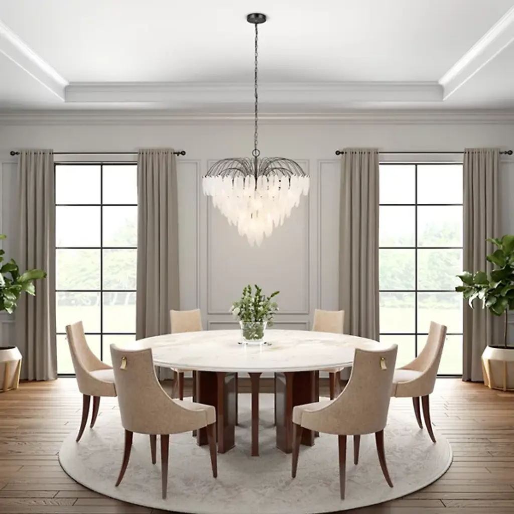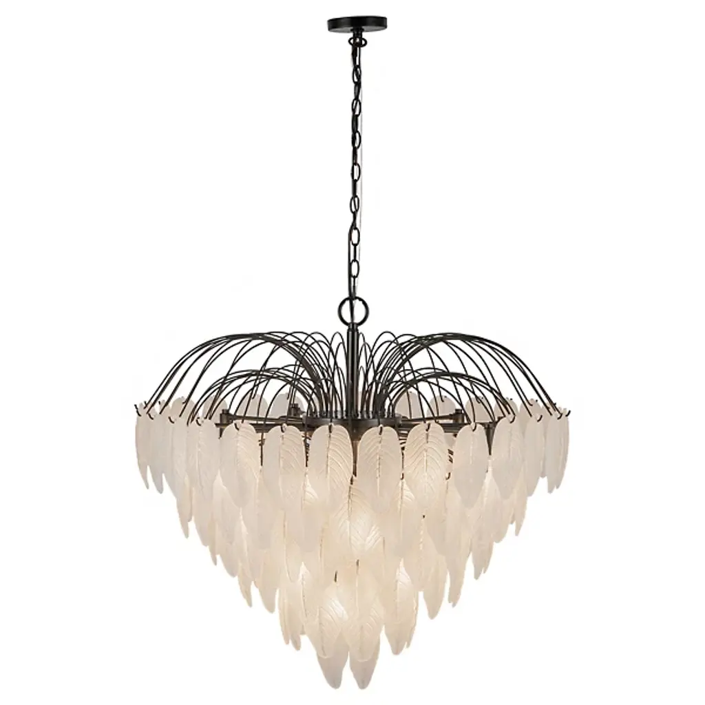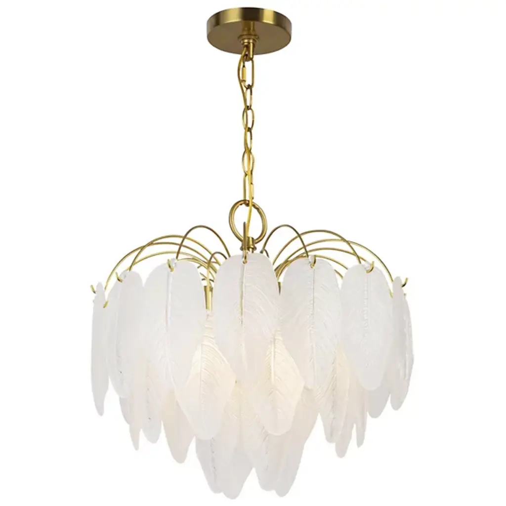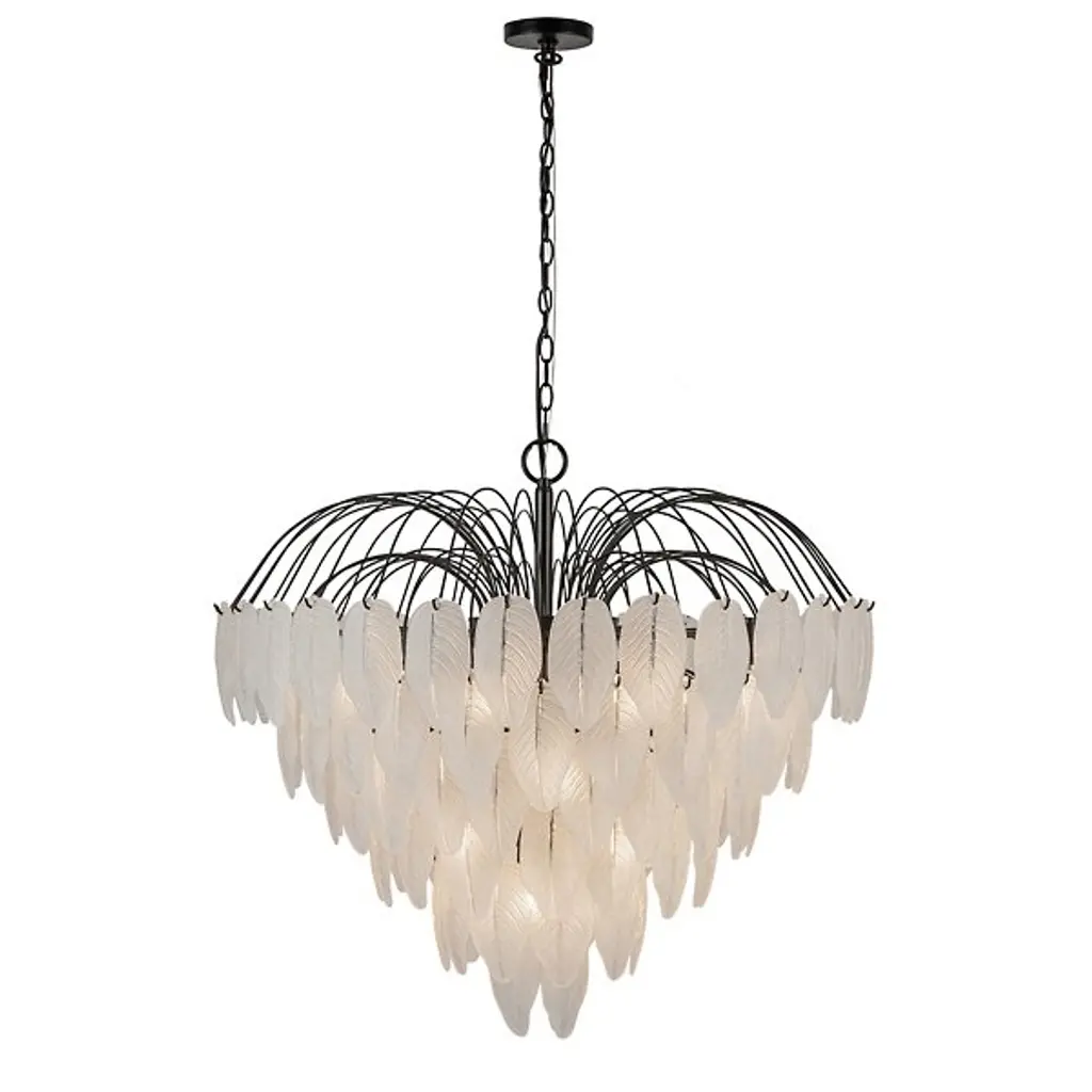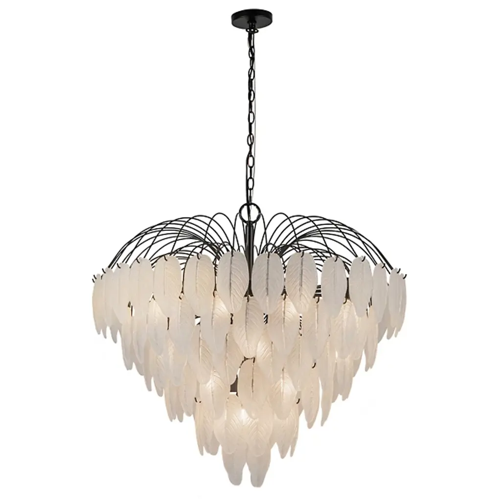 The Alessia Chandelier by Artcraft showcases a unique and contemporary design that brings an elegantly refined touch to any home. With two tiers and leaf-shaped glass shades, this striking fixture complements dining rooms and other spaces with a bold yet sophisticated style. Perfect for adding a touch of modern elegance, this Chandelier is crafted with high-quality metal and glass for durability and timeless appeal, making it a captivating centerpiece in any setting.