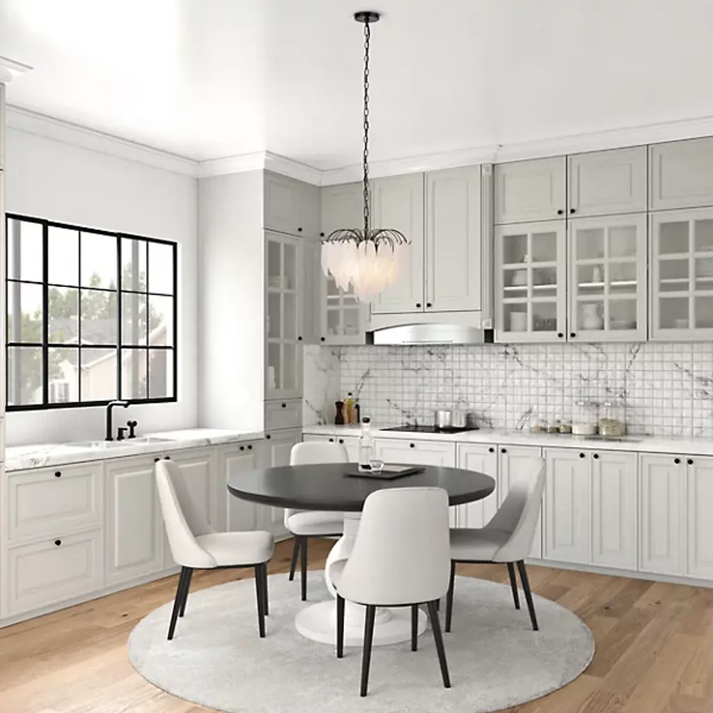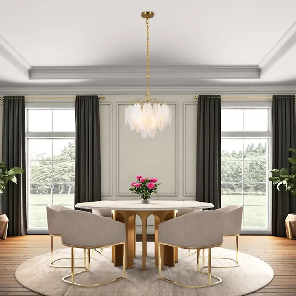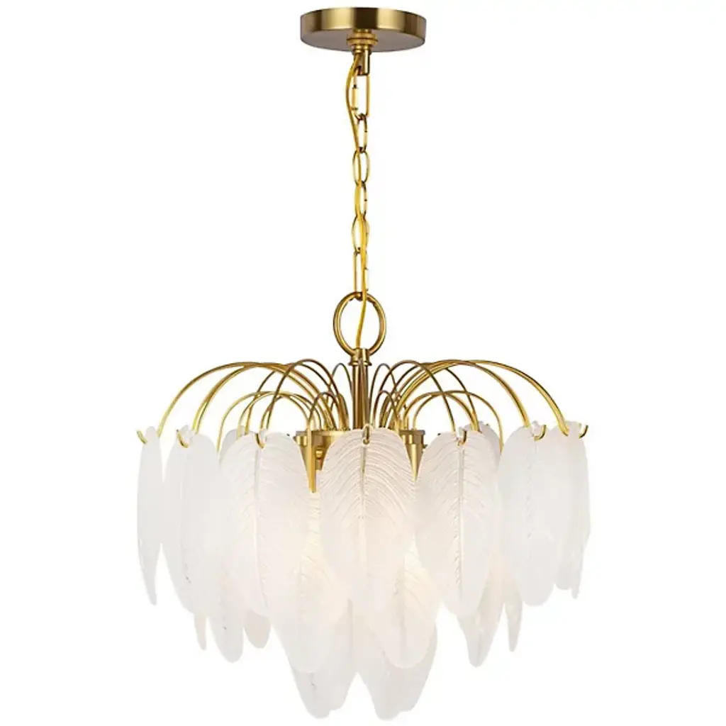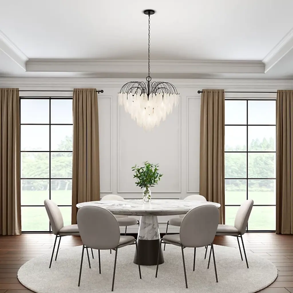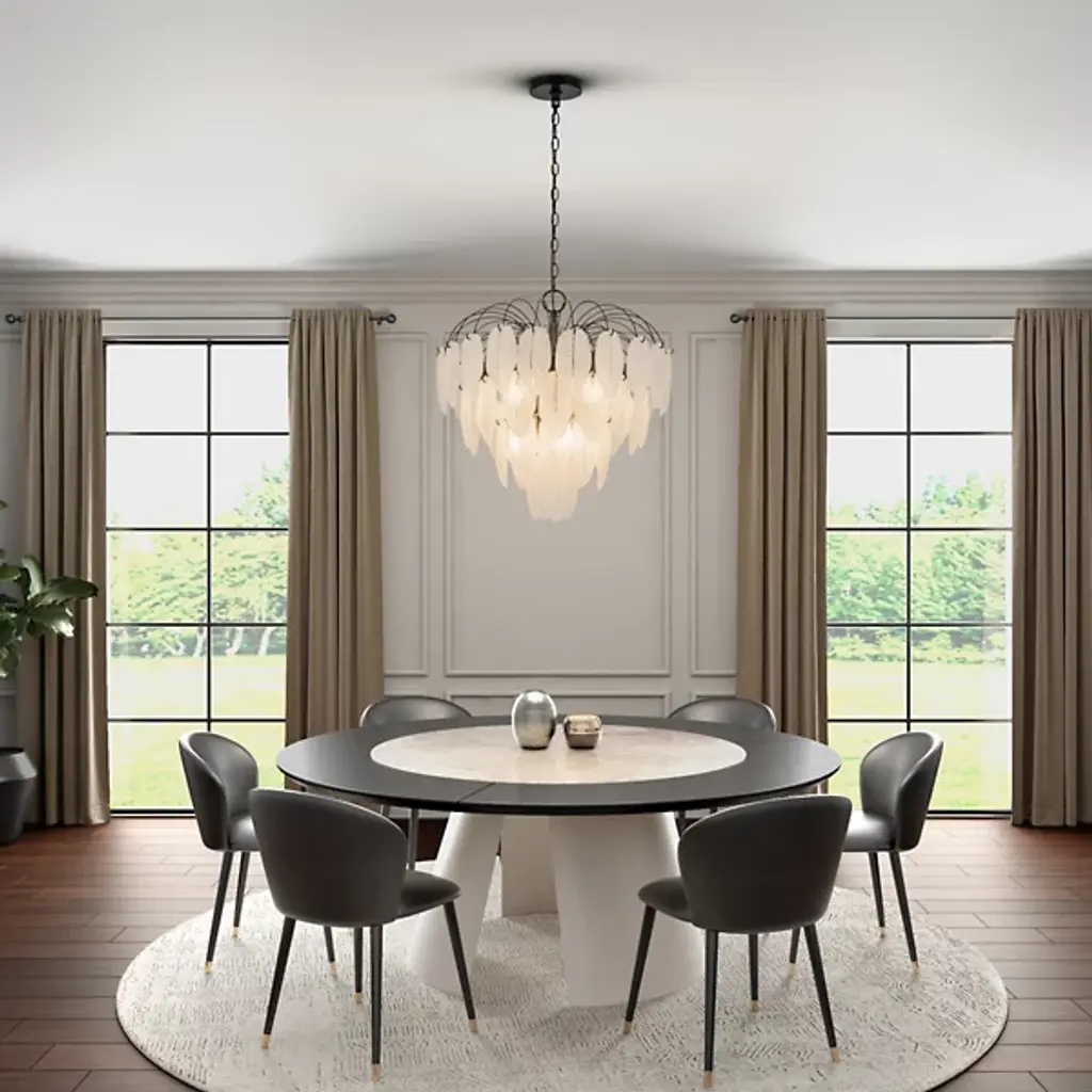 The Alessia Chandelier by Artcraft showcases a unique and contemporary design that brings an elegantly refined touch to any home. With two tiers and leaf-shaped glass shades, this striking fixture complements dining rooms and other spaces with a bold yet sophisticated style. Perfect for adding a touch of modern elegance, this Chandelier is crafted with high-quality metal and glass for durability and timeless appeal, making it a captivating centerpiece in any setting.