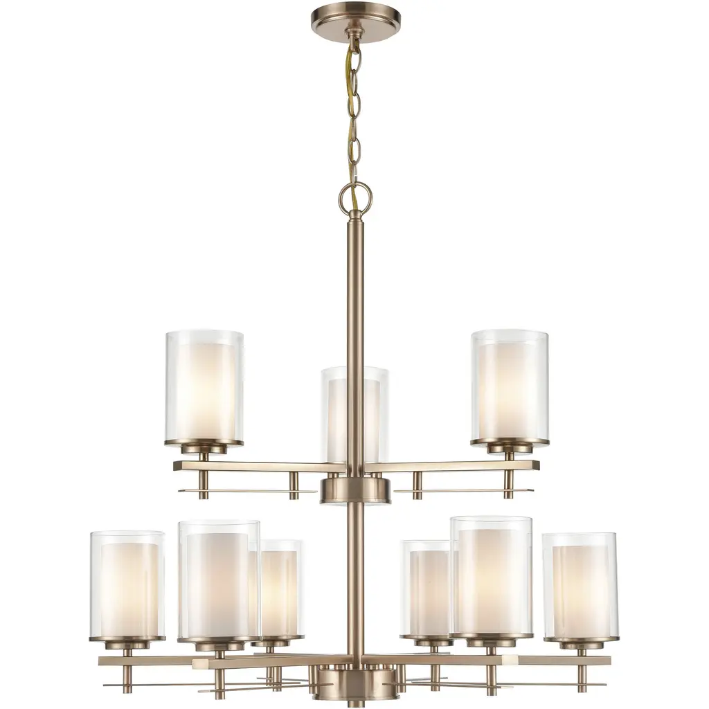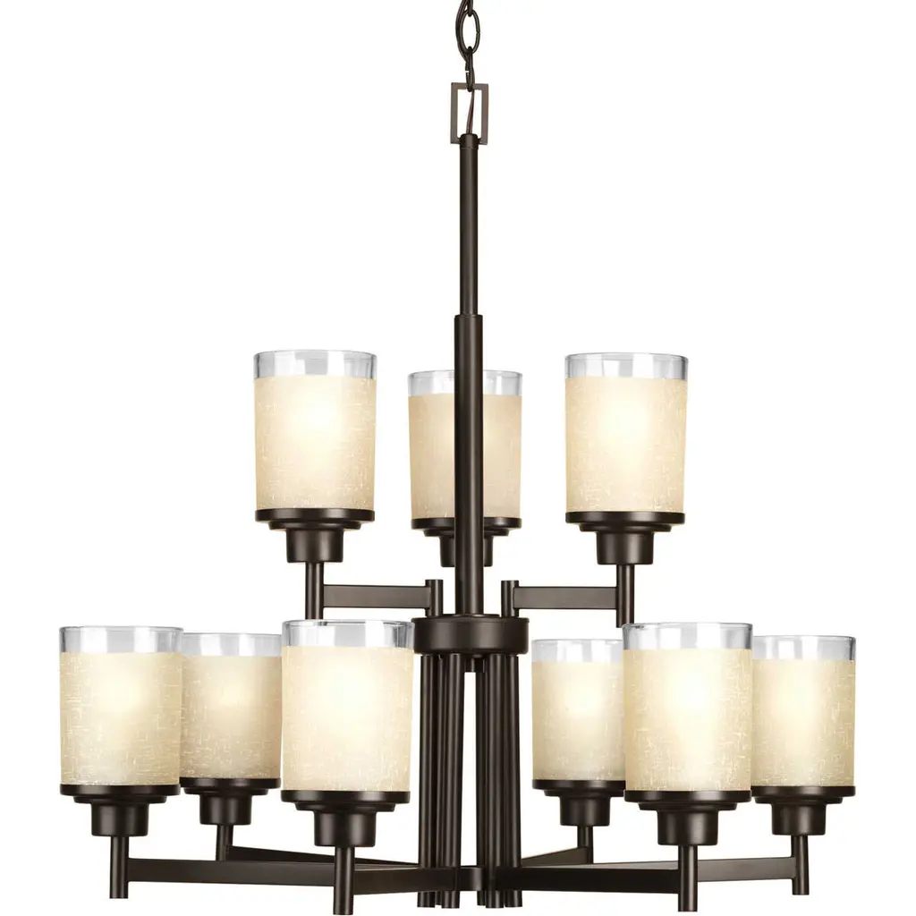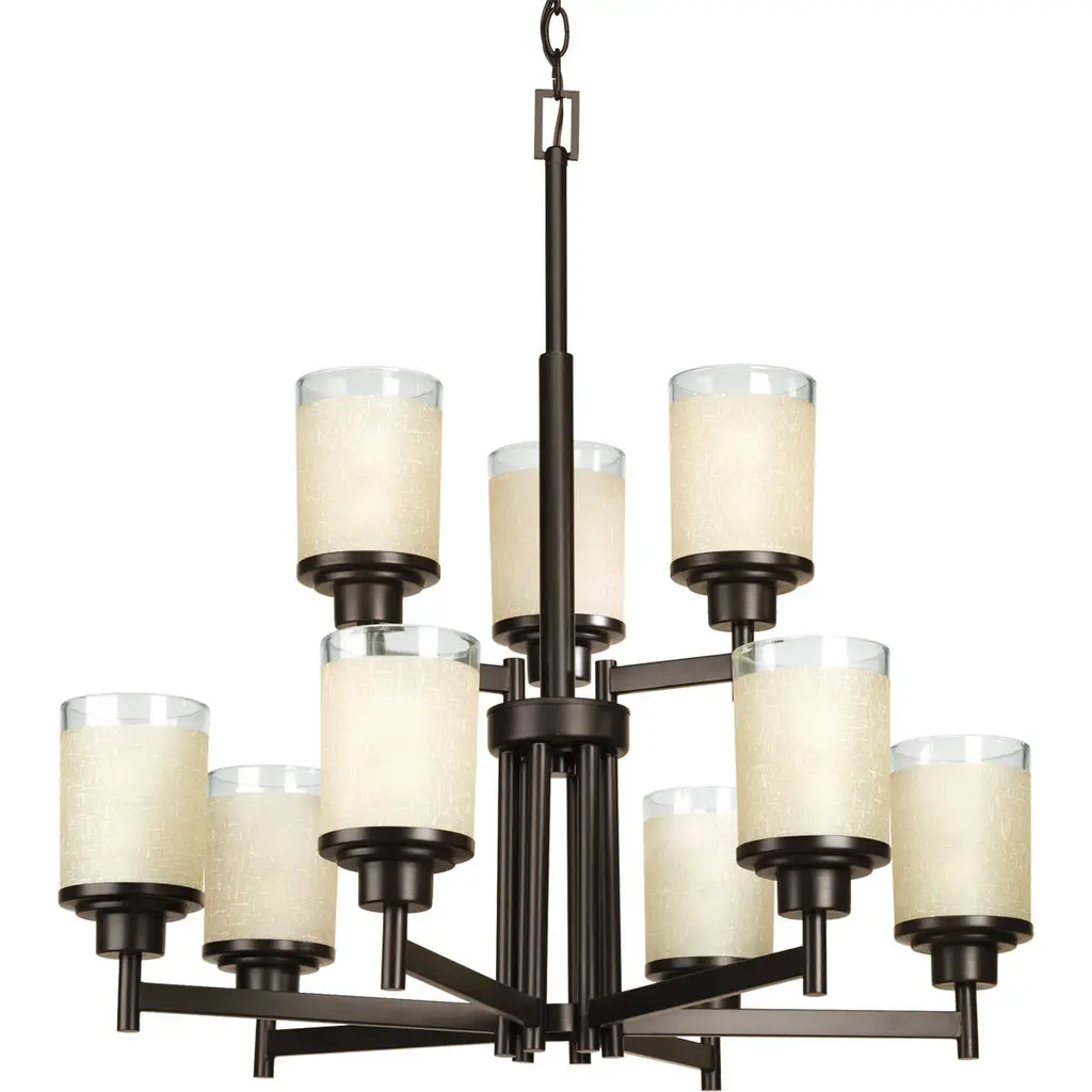 Nine-light, 2-tier chandelier features a pleasingly simple Antique Bronze frame while visually interesting textured etched umber linen glass are complemented by a crisp, clear edge accent. Create the sophisticated feel of modern, urban living in your home - no matter where you live.