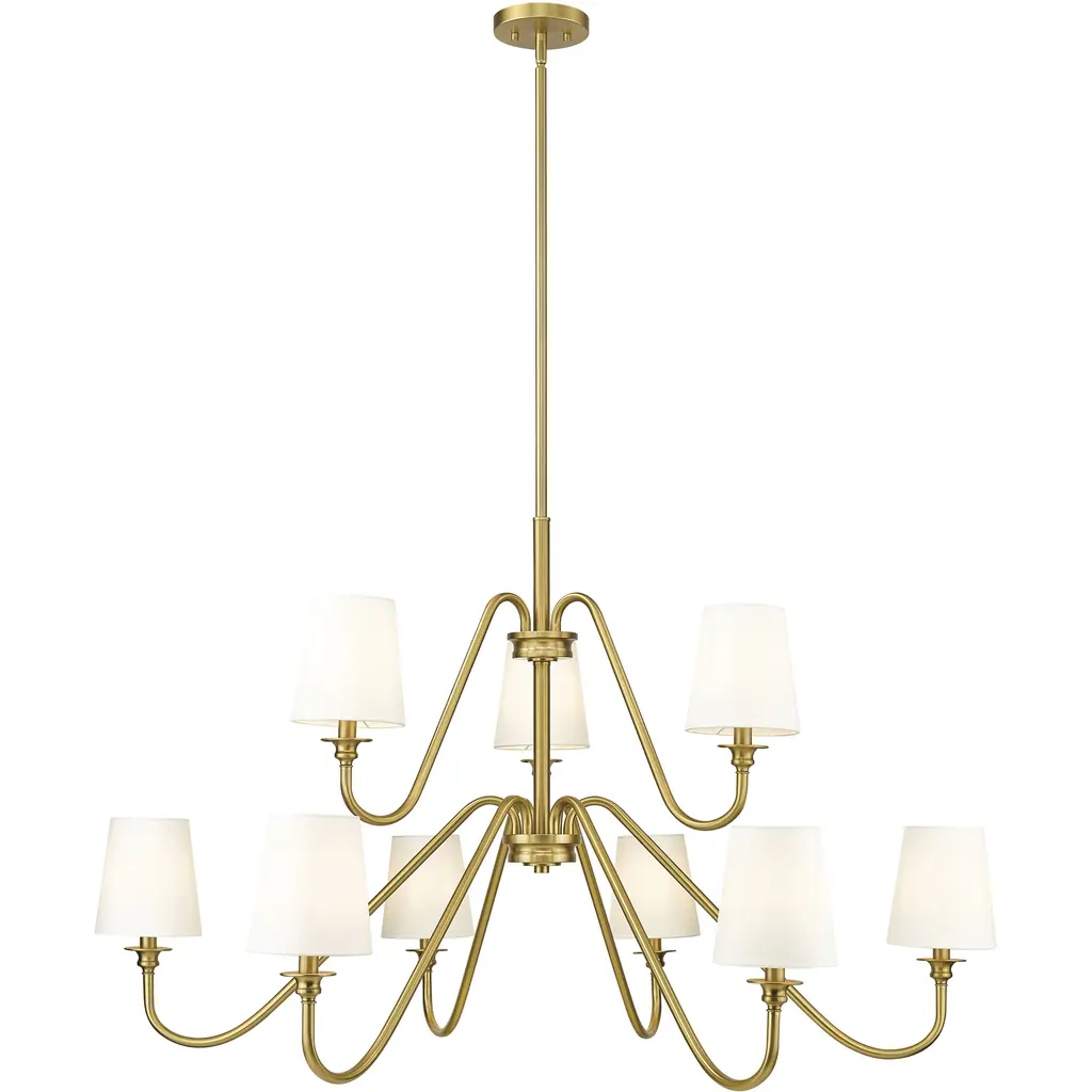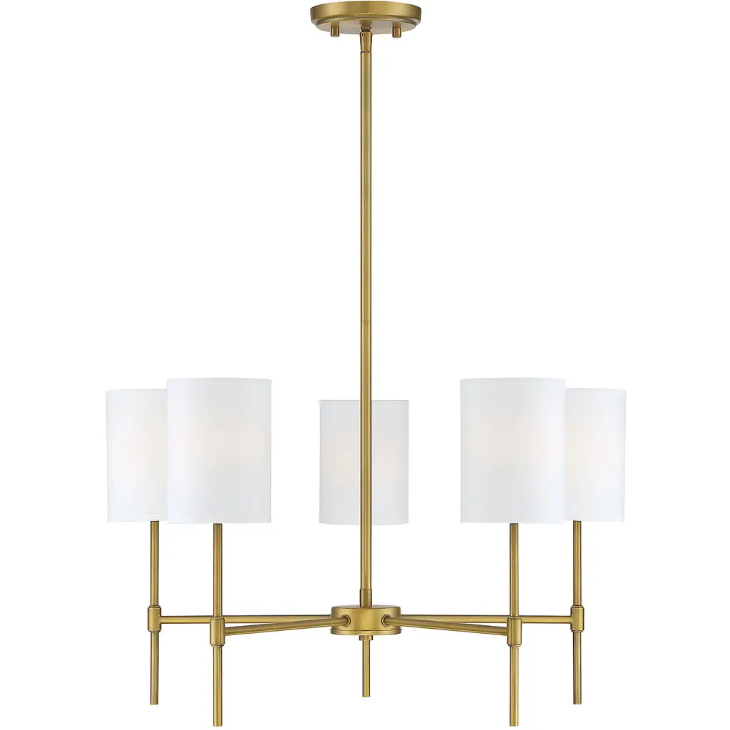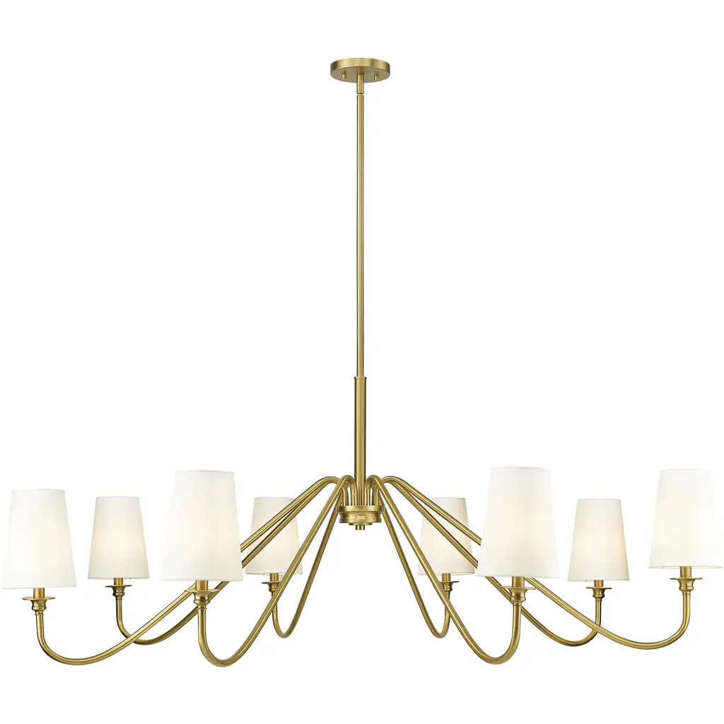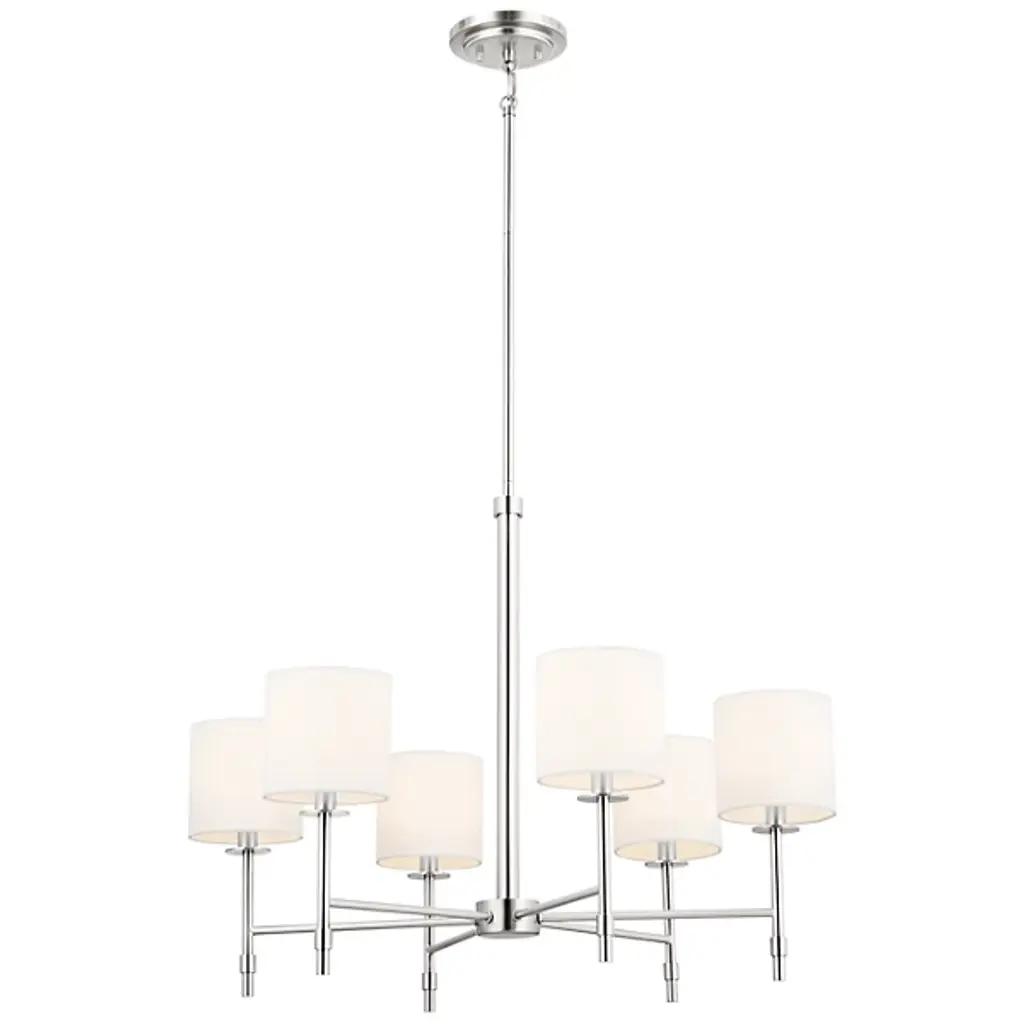 The Ali Chandelier by Kichler gives your living space a transitional aesthetic. A downrod extends from a canopy at your ceiling and gradually stems into a collection of slender arms. These arms bolster linear rods, which are crowned by cylindrical shades of fabric. Inside of these shades rest incandescent bulbs which project radiant light throughout your decorative arrangement with ease. This chandelier is suited for a variety of indoor settings so that you can place this multi-light fixture in living rooms and dining rooms alike.