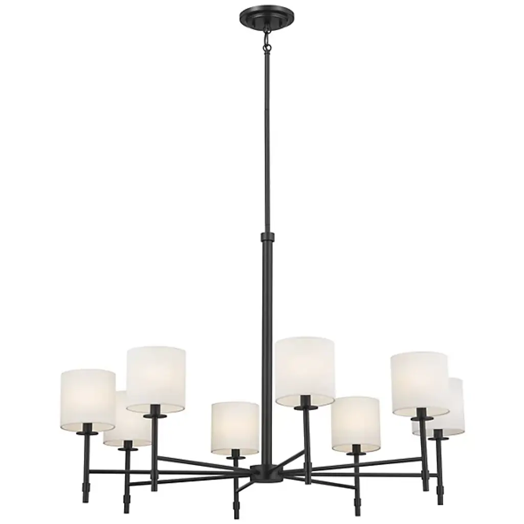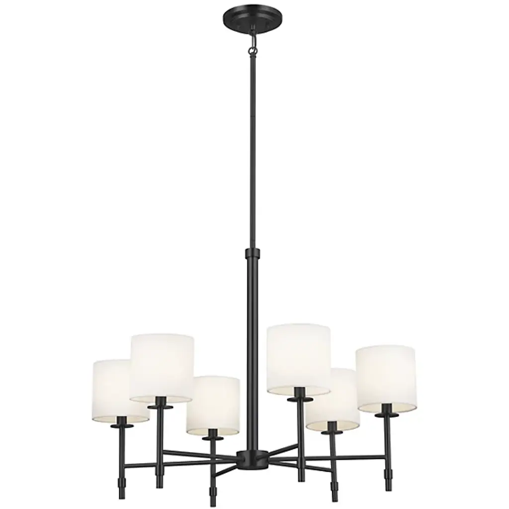 The Ali Chandelier by Kichler gives your living space a transitional aesthetic. A downrod extends from a canopy at your ceiling and gradually stems into a collection of slender arms. These arms bolster linear rods, which are crowned by cylindrical shades of fabric. Inside of these shades rest incandescent bulbs which project radiant light throughout your decorative arrangement with ease. This chandelier is suited for a variety of indoor settings so that you can place this multi-light fixture in living rooms and dining rooms alike.