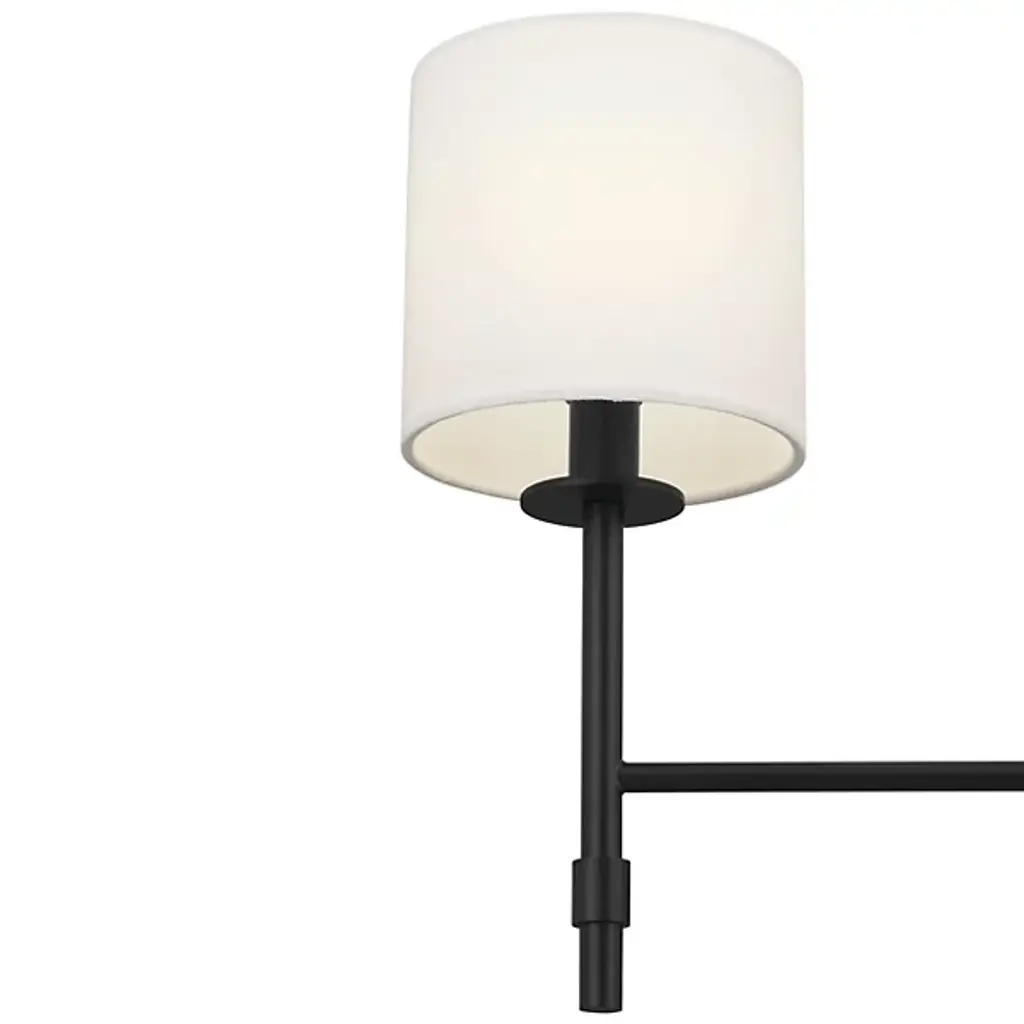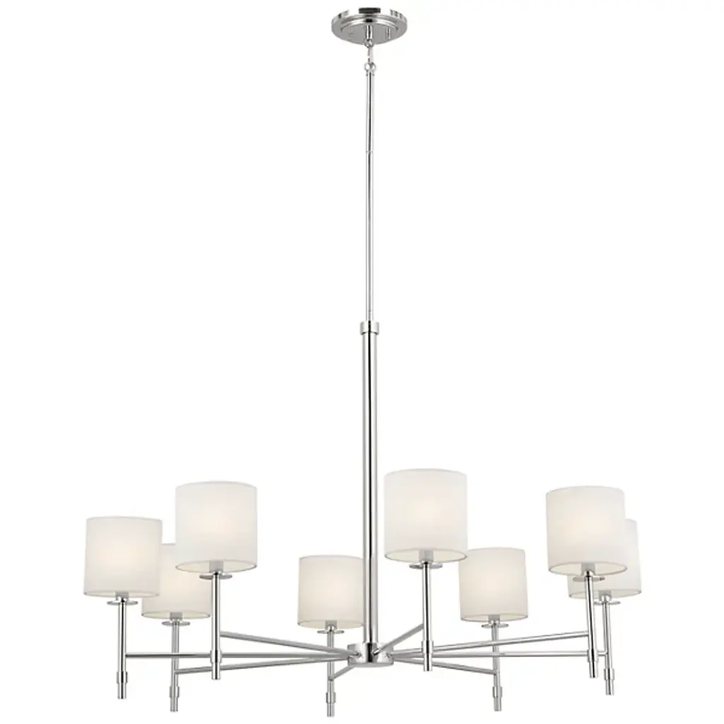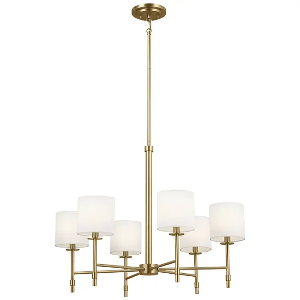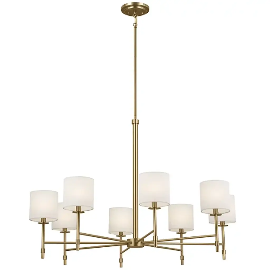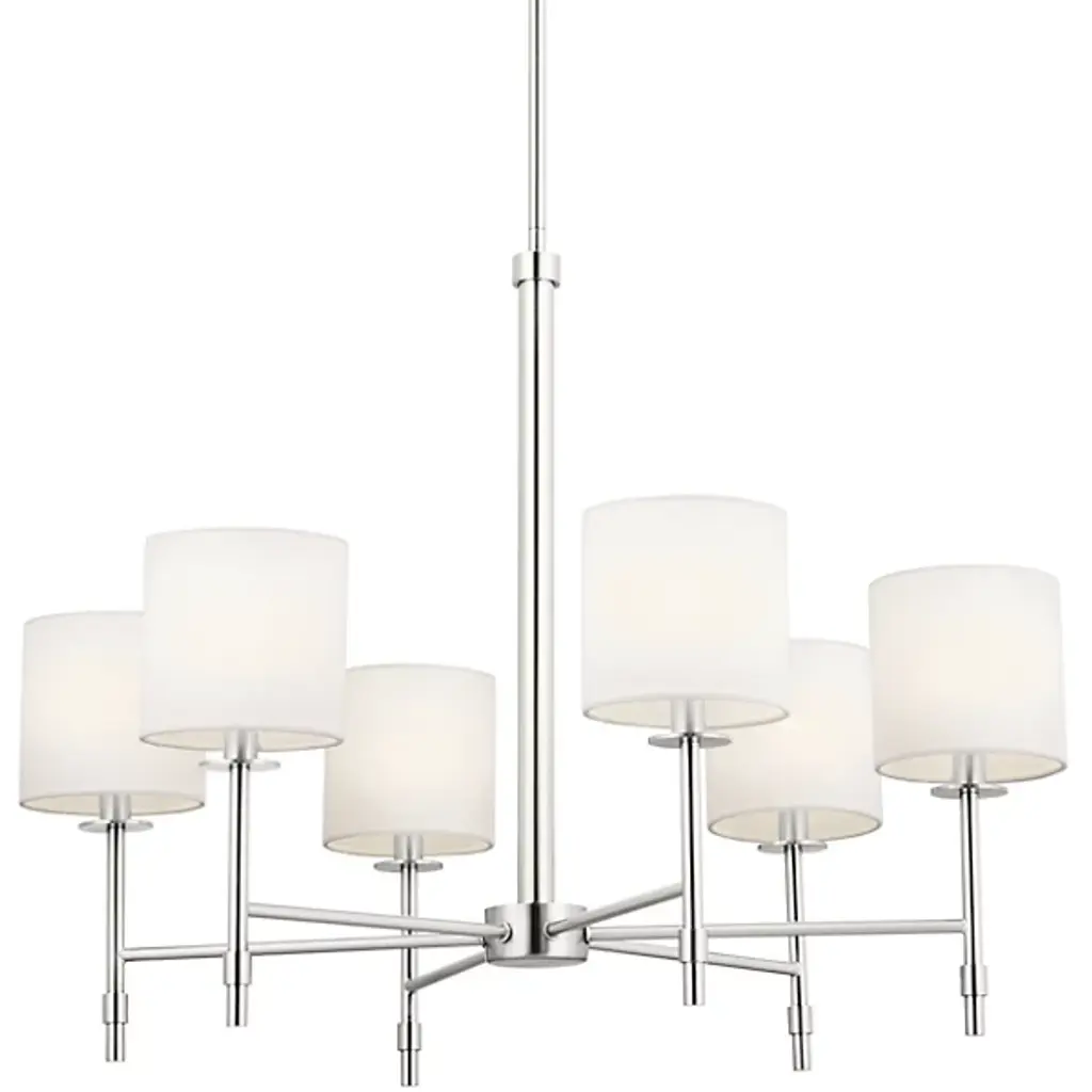 The Ali Chandelier by Kichler gives your living space a transitional aesthetic. A downrod extends from a canopy at your ceiling and gradually stems into a collection of slender arms. These arms bolster linear rods, which are crowned by cylindrical shades of fabric. Inside of these shades rest incandescent bulbs which project radiant light throughout your decorative arrangement with ease. This chandelier is suited for a variety of indoor settings so that you can place this multi-light fixture in living rooms and dining rooms alike.