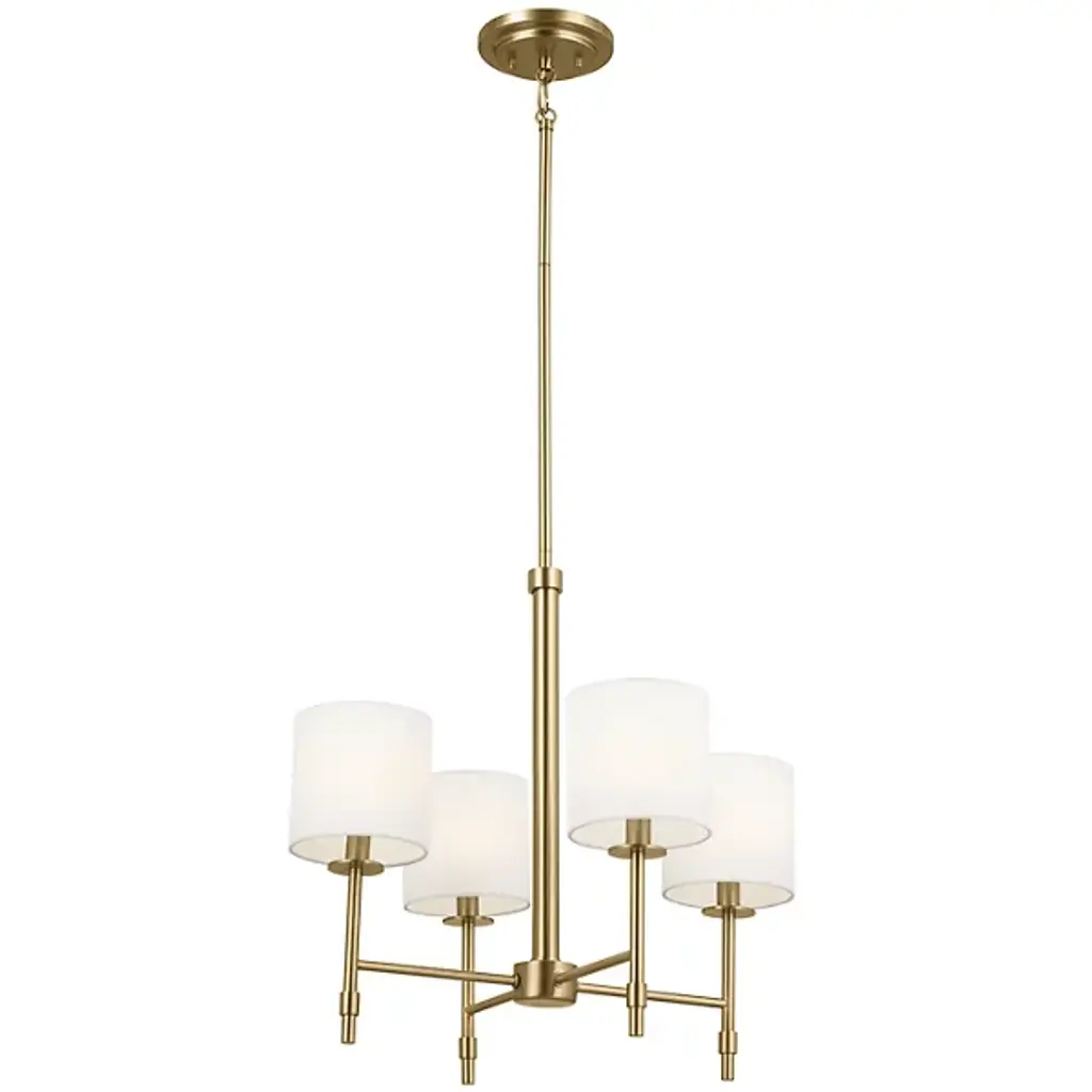 Light up your home with the Ali Mini Chandelier by Kichler. The minimalist design of your chandelier boasts a collection of metallic rods that support individual shades spaced evenly in the air. The chandelier is secured by a downrod attached to a canopy at your ceiling. Each light rests on either side of 2 supporting addendums that perpendicularly intersect at the pendant’s center. This chandelier showcases a transitional style that complements any 21st-century indoor living space.