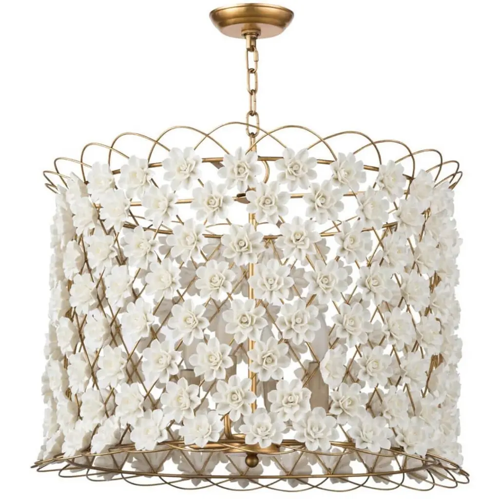 The Alice illuminates Regina Andrew's feminine side with whimsical, non-glazed porcelain flowers emanating sophistication and grace. Balancing yin with yang, the matte-white flowers adhere to a gold leaf-finished frame that completes the design. Hardwired.