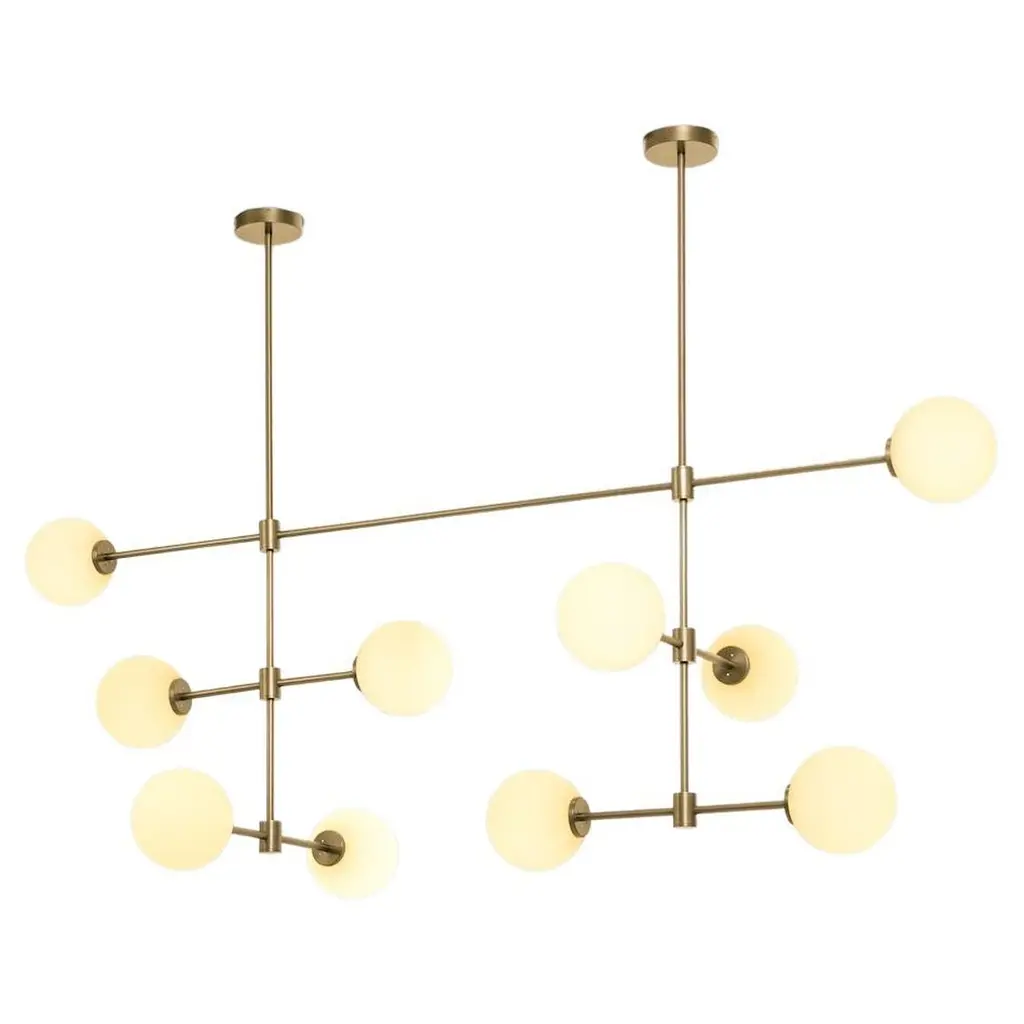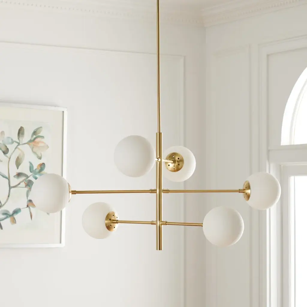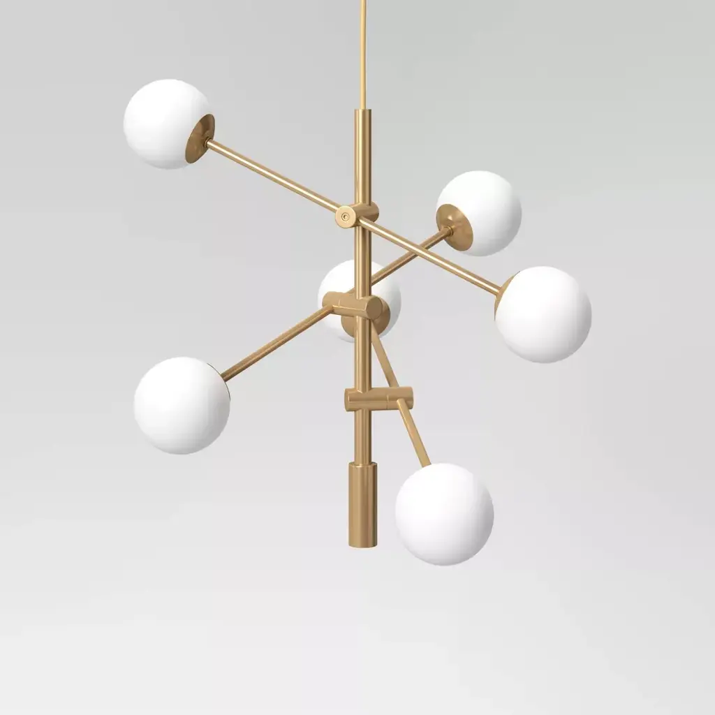 Give your décor an unapologetically fashion-forward gleam with this beautiful Alison chandelier. Styled after retro space age designs, Alison’s white glass spheres appear like glowing moons, gently orbiting around a gold steel frame for a dramatic sense of depth and motion.