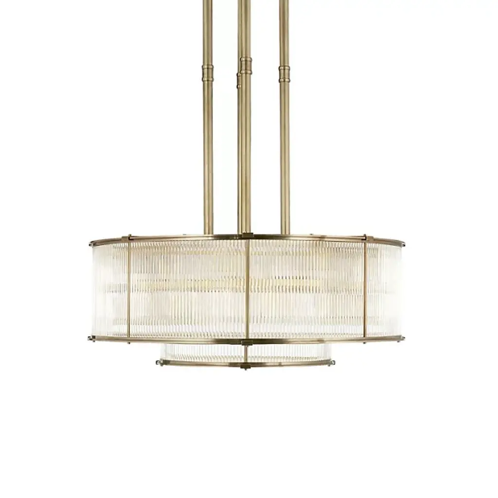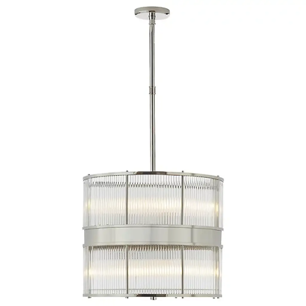 A modern luminaire with a regal air. The Allen Drum Chandelier by Visual Comfort Signature, formerly known as Visual Comfort, makes a stunning focal point in a foyer or any space in the home. Designed by Ralph Lauren, this fixture presents a gleaming array of clear glass rods set together to form a drum-shaped shade. Two tiers of glass are supported by a slender steel framework that is dropped from a stepped canopy and three sleek downrods, shining beautifully with light from its inner lamping.