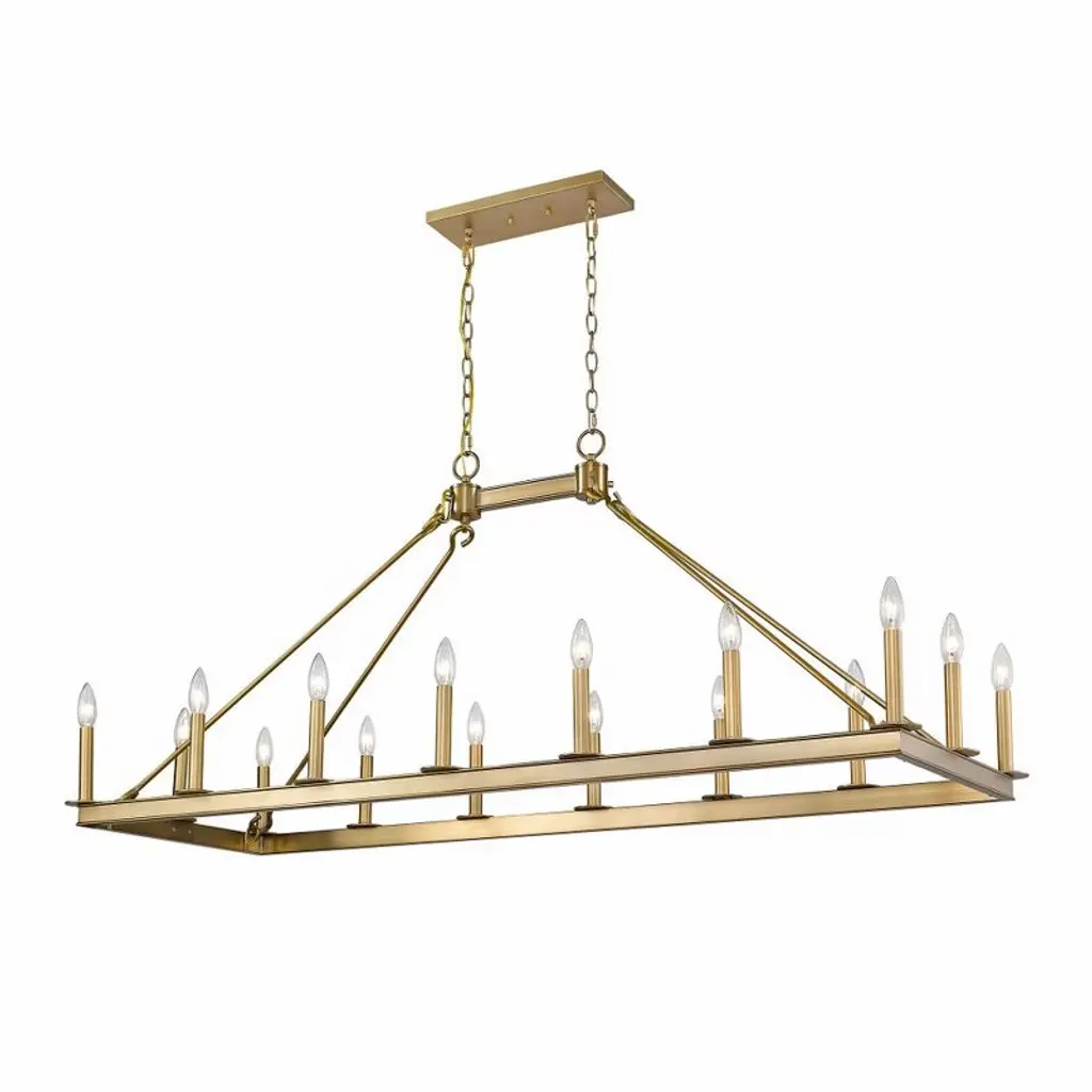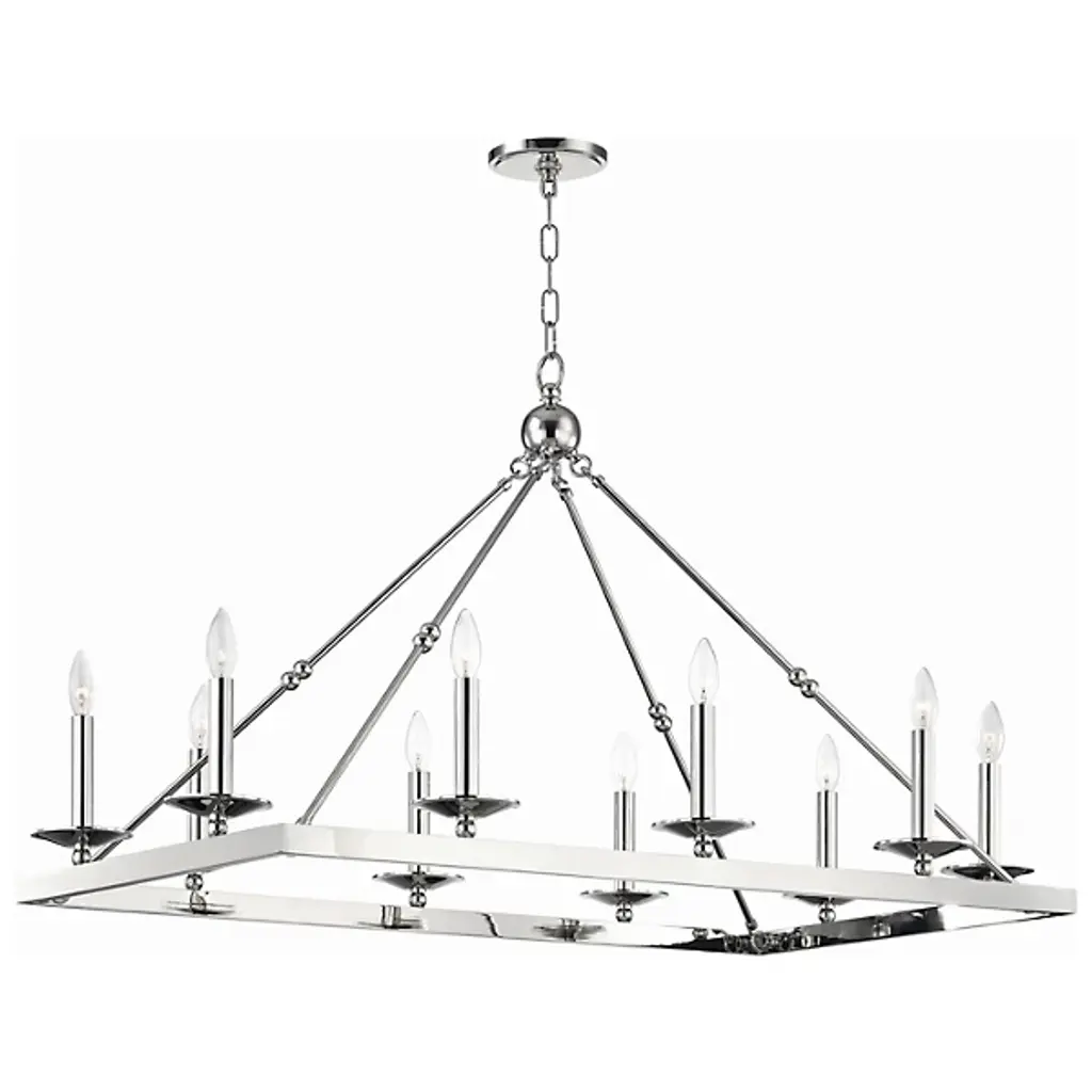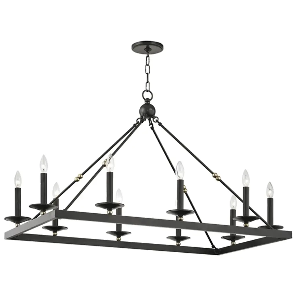 The Allendale 10-Light Chandelier features candelabra lighting, a look that is both on-trend and classic. Starting with a center sphere finial, the Hudson Valley chandelier showcases decorative spheres along the hanging rods as well as under each candelabra bobeche. The rectangular Steel frame adds to the versatility of this fixture, eye-catching above a large harvest table, over a kitchen island or as a welcoming centerpiece in a lofty foyer.