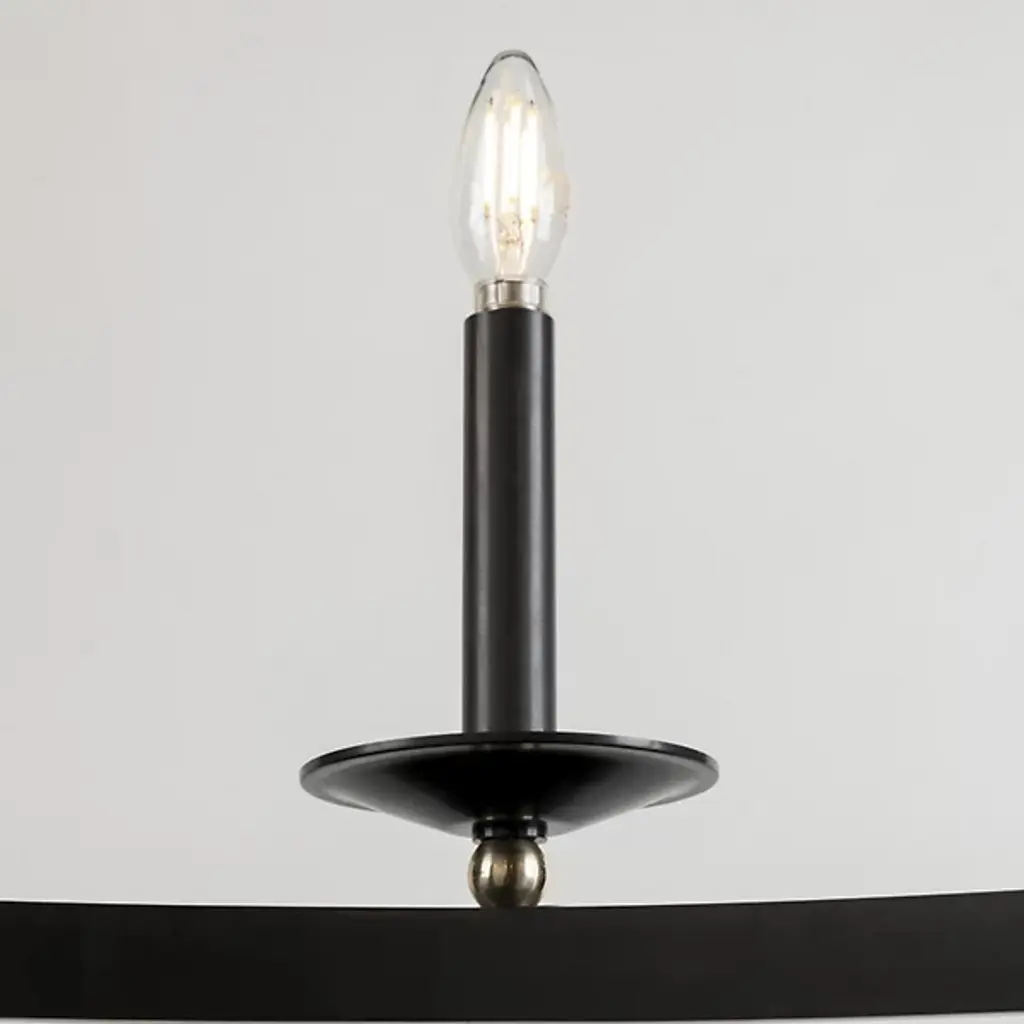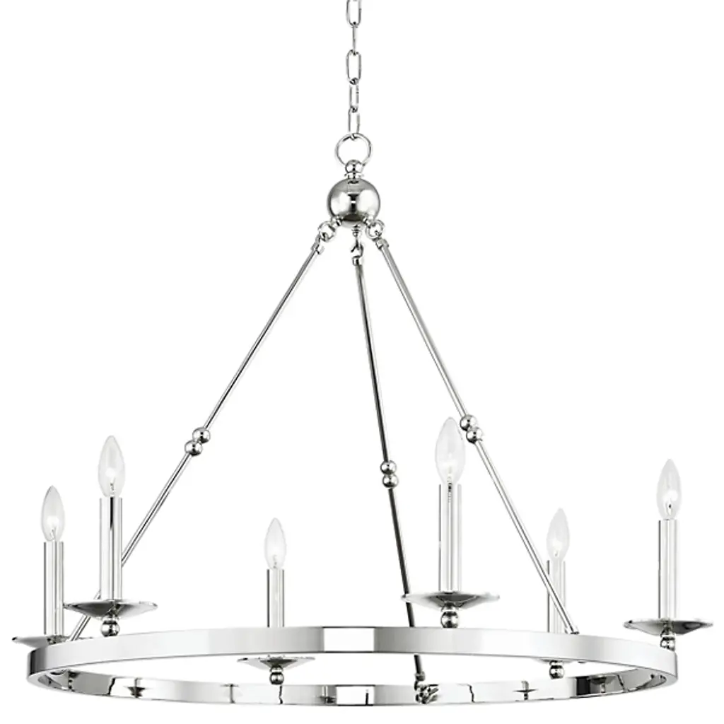 The Hudson Valley Lighting Allendale Chandelier has a classic design that complements any space. It features a simple hoop frame with individual candelabra lights. Lofted by a chain and central sphere finial, the use of spheres echoes along the trio of hanging rods and beneath each candelabra bobeche. A welcoming centerpiece to a modern farmhouse dining room, this fixture makes a statement in a lofty foyer or living room.