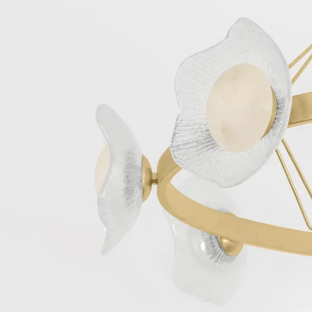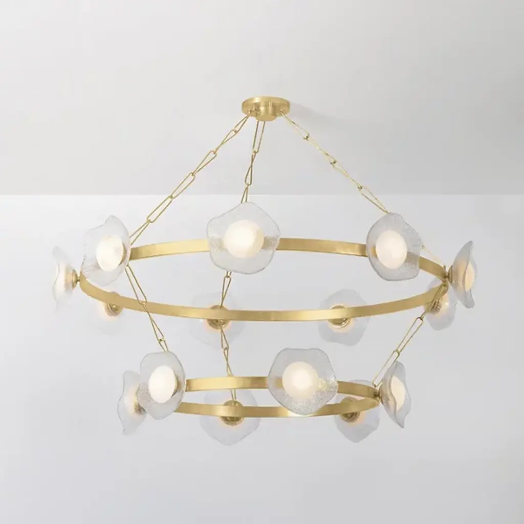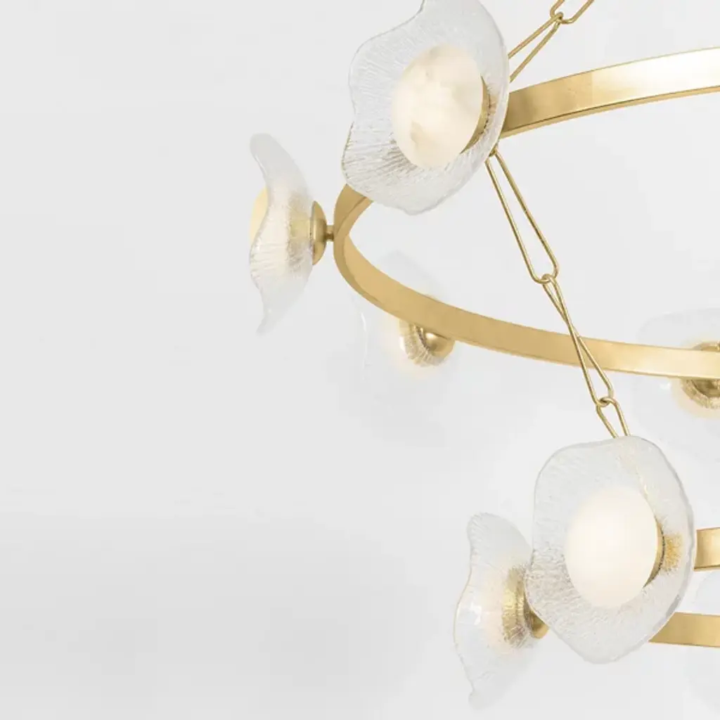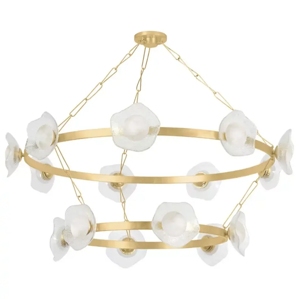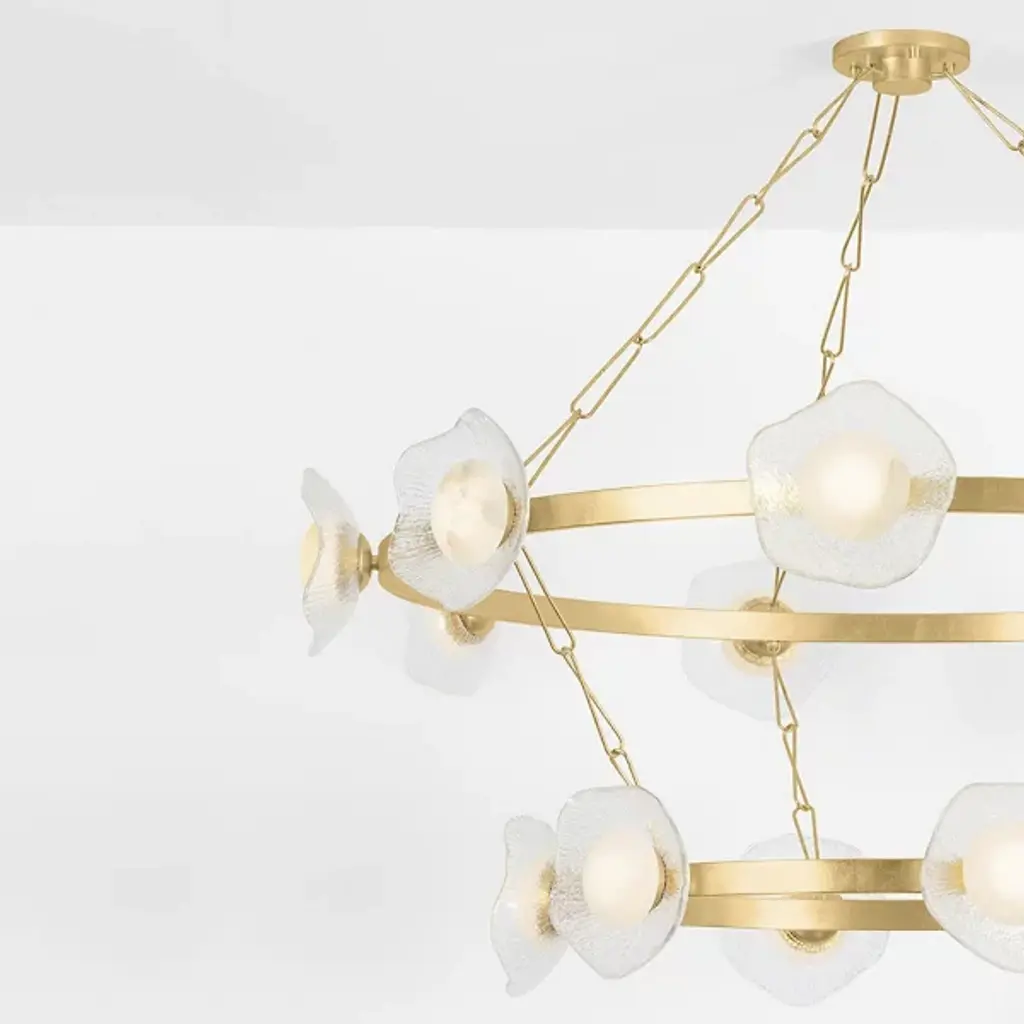 The Almandine LED 2-Tier Chandelier from Corbett Lighting draws inspiration from blooming flowers, with handcrafted glass petals adorning each light point. Its dual-ring design presents an artistic interpretation of a garden in full bloom. The delicate fluted piastre glass shades are individually shaped to capture the organic movement of unfurling petals. Chain-link adds an architectural element while maintaining the chandelier's airy presence. The minimalist metalwork provides a structured foundation that lets the illuminated glass florals become the central focus of this nature-inspired lighting piece.