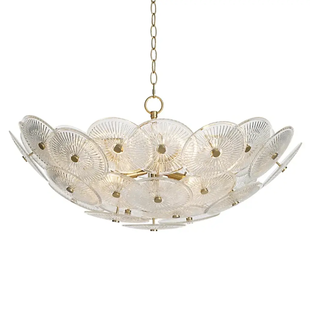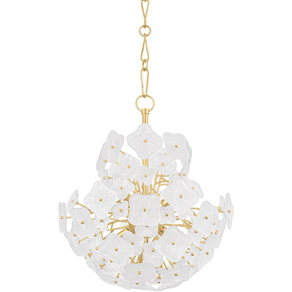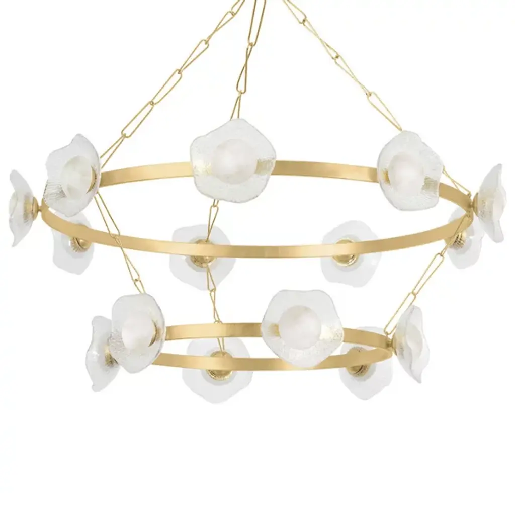 Combining organic and modern elements, Almandine is an elevated take on a traditional ring chandelier. The minimalist frame is accented with floral-shaped shades hand-cut from fluted piastre glass. Finished in Vintage Gold Leaf, the restrained metalwork allows the beauty of the blooms to shine. Almandine is available as a single-tier chandelier with 6 or 9 lights, a double-tier chandelier with 15 lights, and a single-light wall sconce.