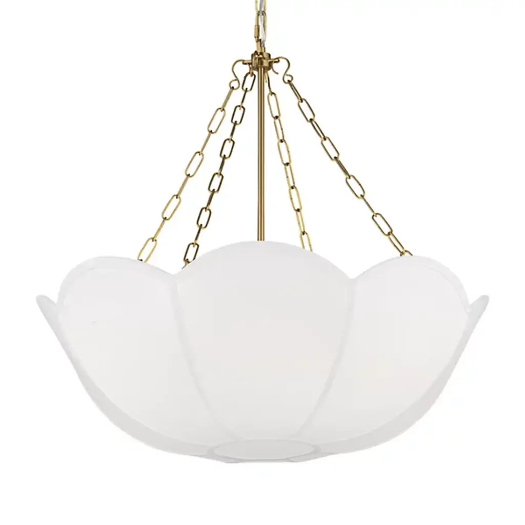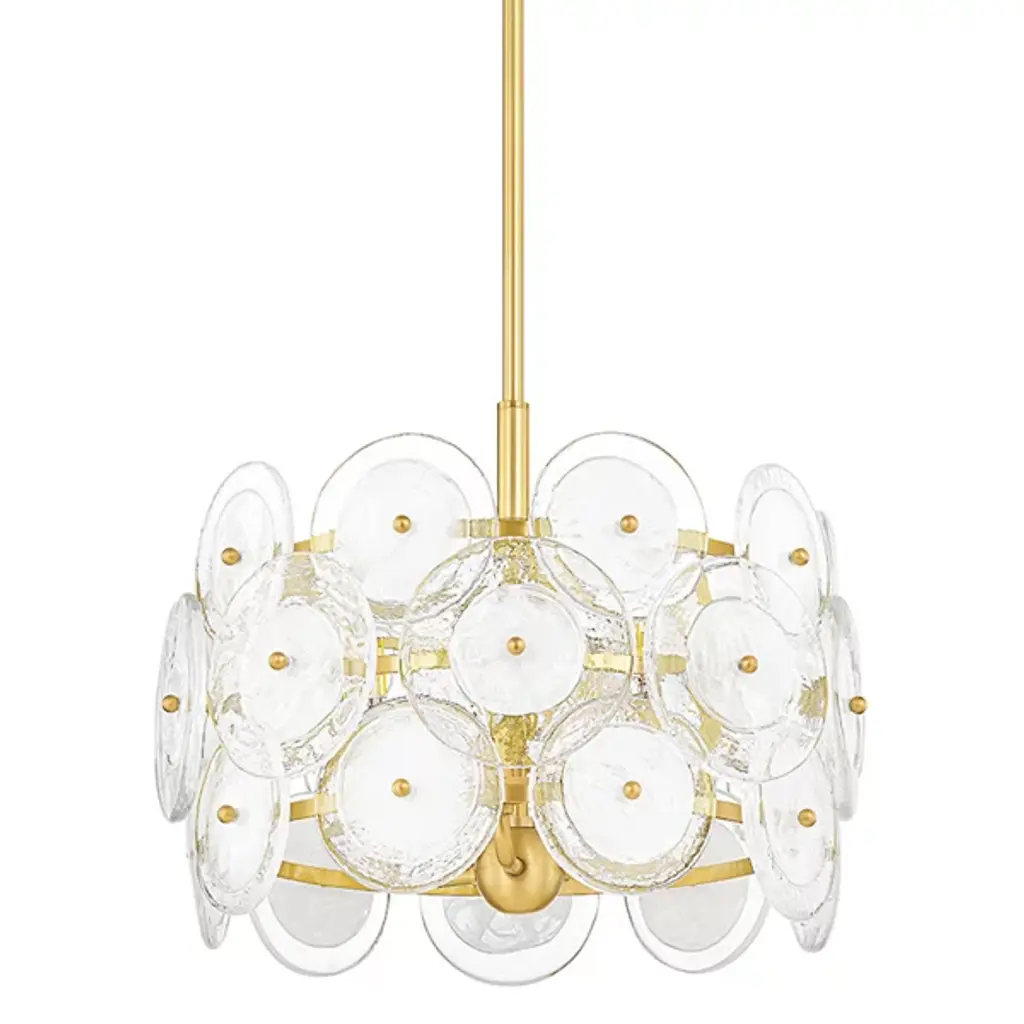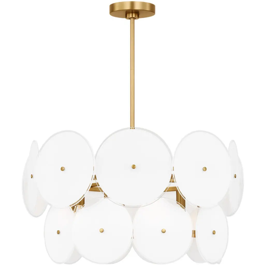 Combining organic and modern elements, Almandine is an elevated take on a traditional ring chandelier. The minimalist frame is accented with floral-shaped shades hand-cut from fluted piastre glass. Finished in Vintage Gold Leaf, the restrained metalwork allows the beauty of the blooms to shine. Almandine is available as a single-tier chandelier with 6 or 9 lights, a double-tier chandelier with 15 lights, and a single-light wall sconce.
