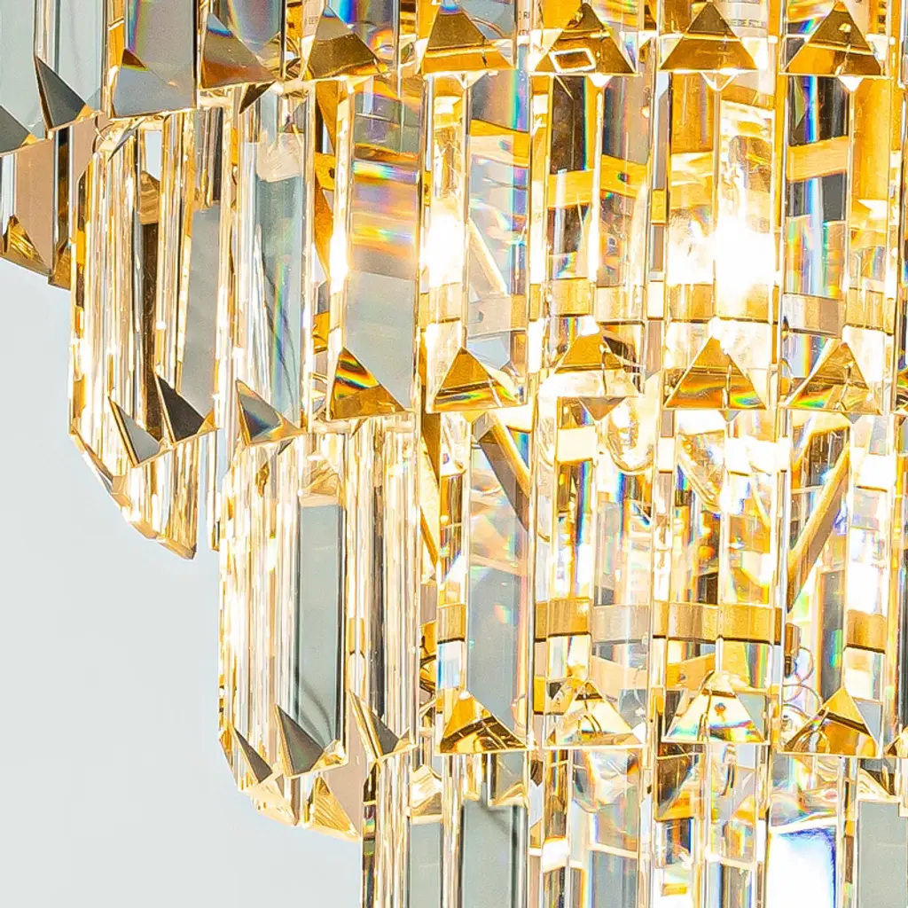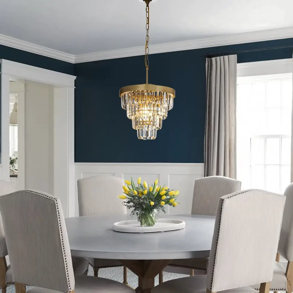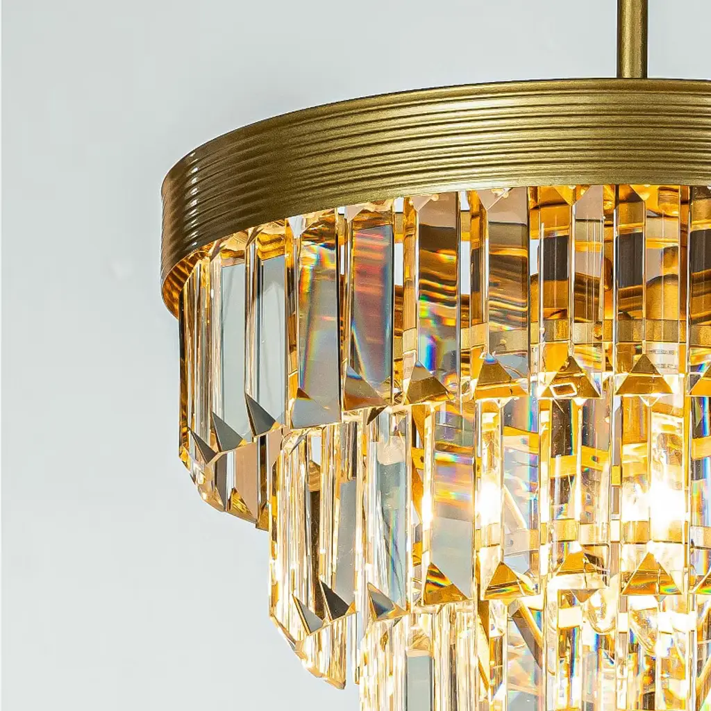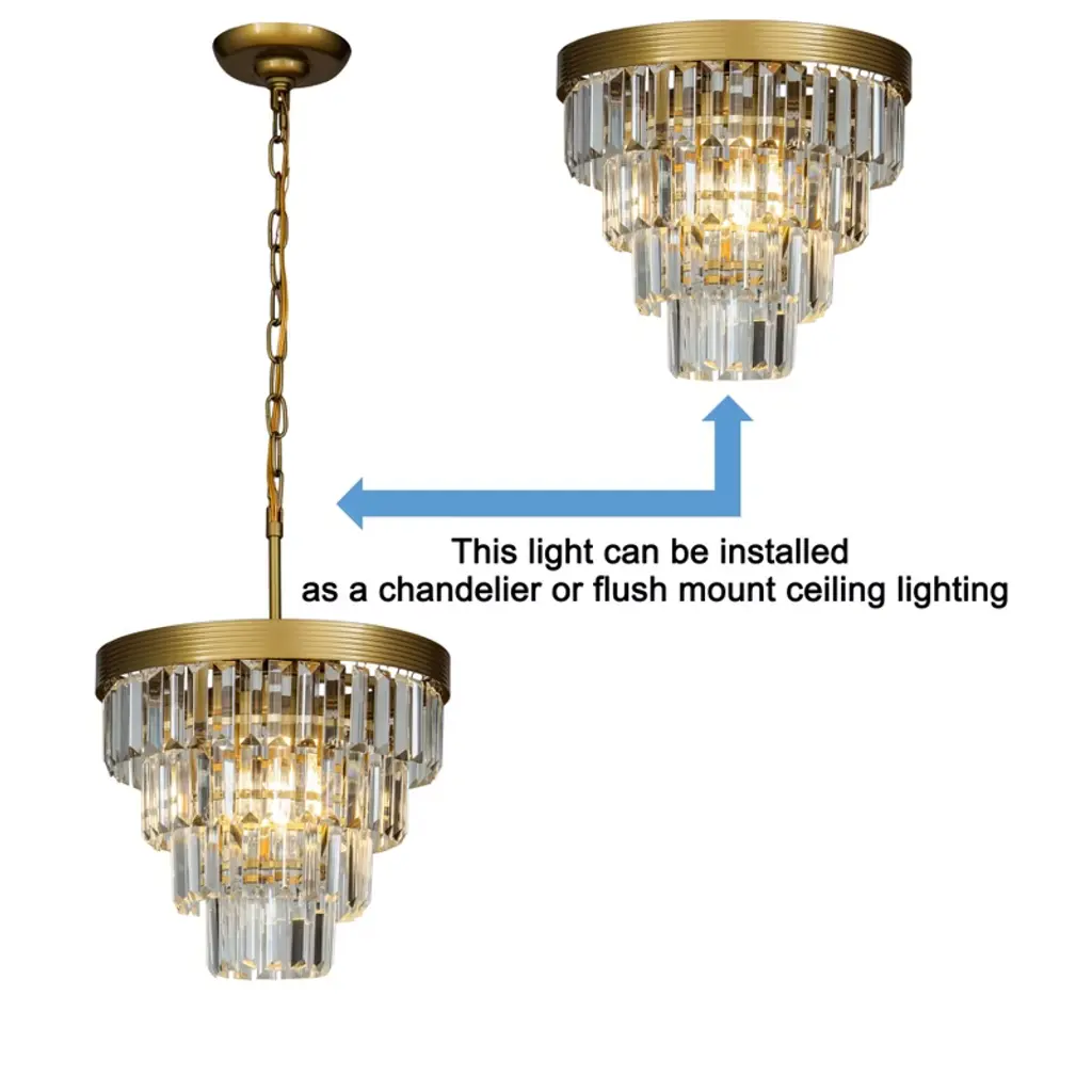 Adalric 13" antique gold Tier Crystal Chandelier Pendant Lamp has a frame that is finished in antique gold with substantial clear rectangular crystal that cascade to create a stunning effect.It creates a modern twist on an Art Deco theme and would look perfect in living room ,lounges, dining rooms and hallways.