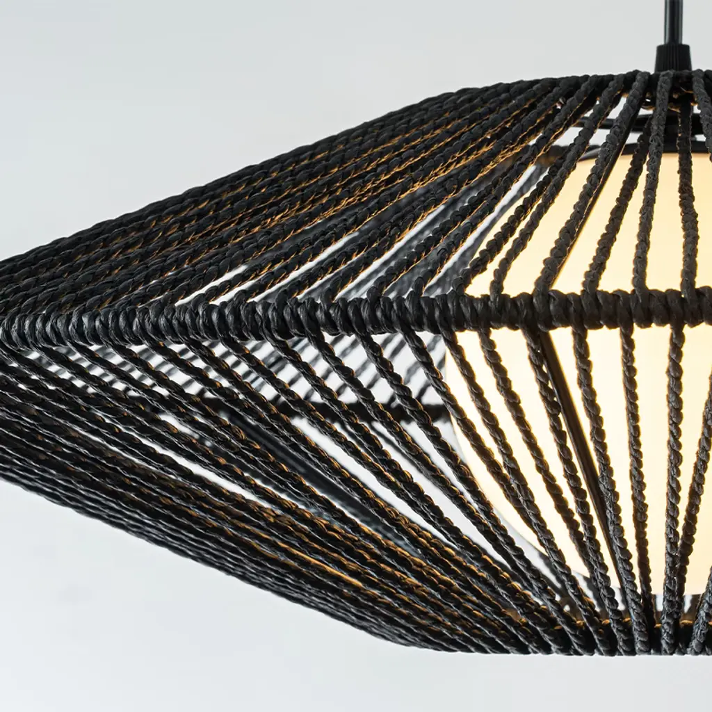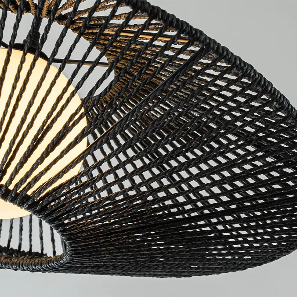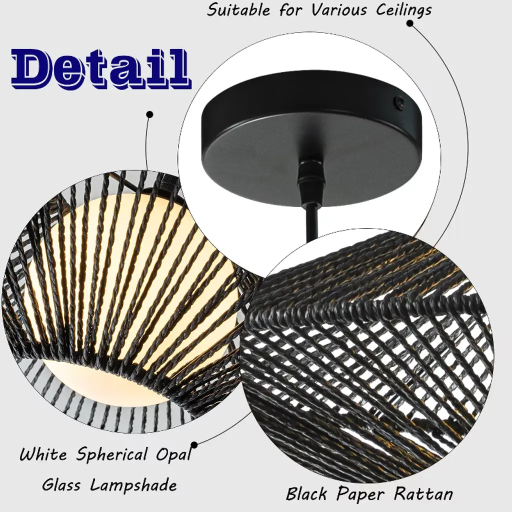 Illuminate your space with this Modern Black Hand-Woven Rattan Chandelier Pendant Light, a stunning combination of contemporary design and artisanal craftsmanship. Featuring a black hand-woven rattan shade and a soft white bubble glass, this chandelier is both elegant and versatile, making it a perfect addition to any room. The warm light from the white bubble glass casts beautiful and interesting shadow patterns through the black rattan shade, creating an inviting and stylish ambiance. This chandelier complements a variety of styles, including Modern, Boho, Nautical, Mid-Century Modern, and Farmhouse interiors, making it perfect for living rooms, foyers, and more. This hand-woven rattan chandelier is ideal for both residential and commercial spaces. Its versatile design and adjustable height make it perfect for high-ceiling areas, while its soft glow and unique look enhance any modern or transitional decor.