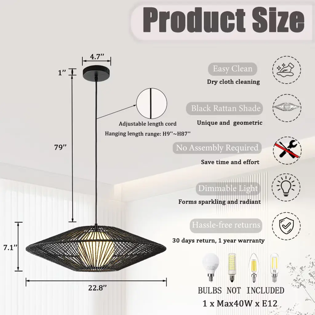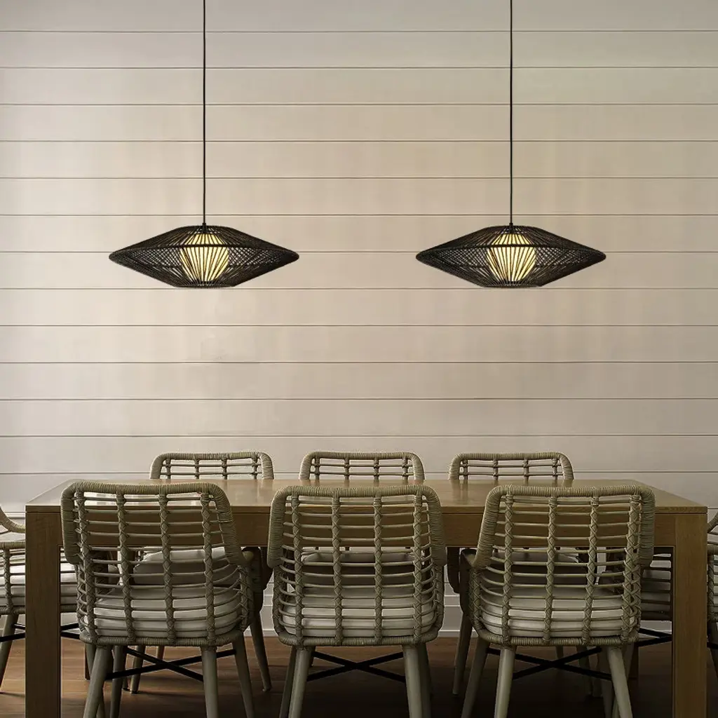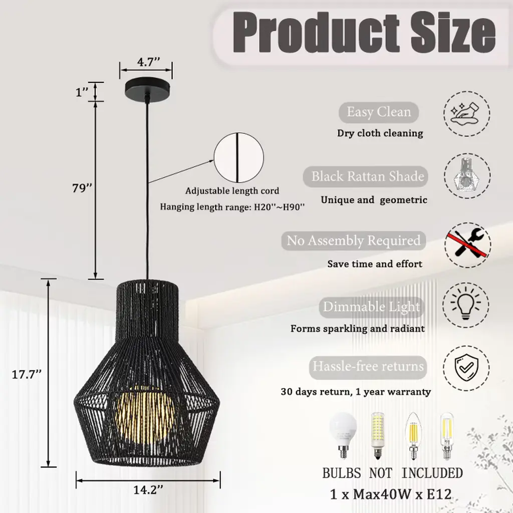 Illuminate your space with this Modern Black Hand-Woven Rattan Chandelier Pendant Light, a stunning combination of contemporary design and artisanal craftsmanship. Featuring a black hand-woven rattan shade and a soft white bubble glass, this chandelier is both elegant and versatile, making it a perfect addition to any room. The warm light from the white bubble glass casts beautiful and interesting shadow patterns through the black rattan shade, creating an inviting and stylish ambiance. This chandelier complements a variety of styles, including Modern, Boho, Nautical, Mid-Century Modern, and Farmhouse interiors, making it perfect for living rooms, foyers, and more. This hand-woven rattan chandelier is ideal for both residential and commercial spaces. Its versatile design and adjustable height make it perfect for high-ceiling areas, while its soft glow and unique look enhance any modern or transitional decor.