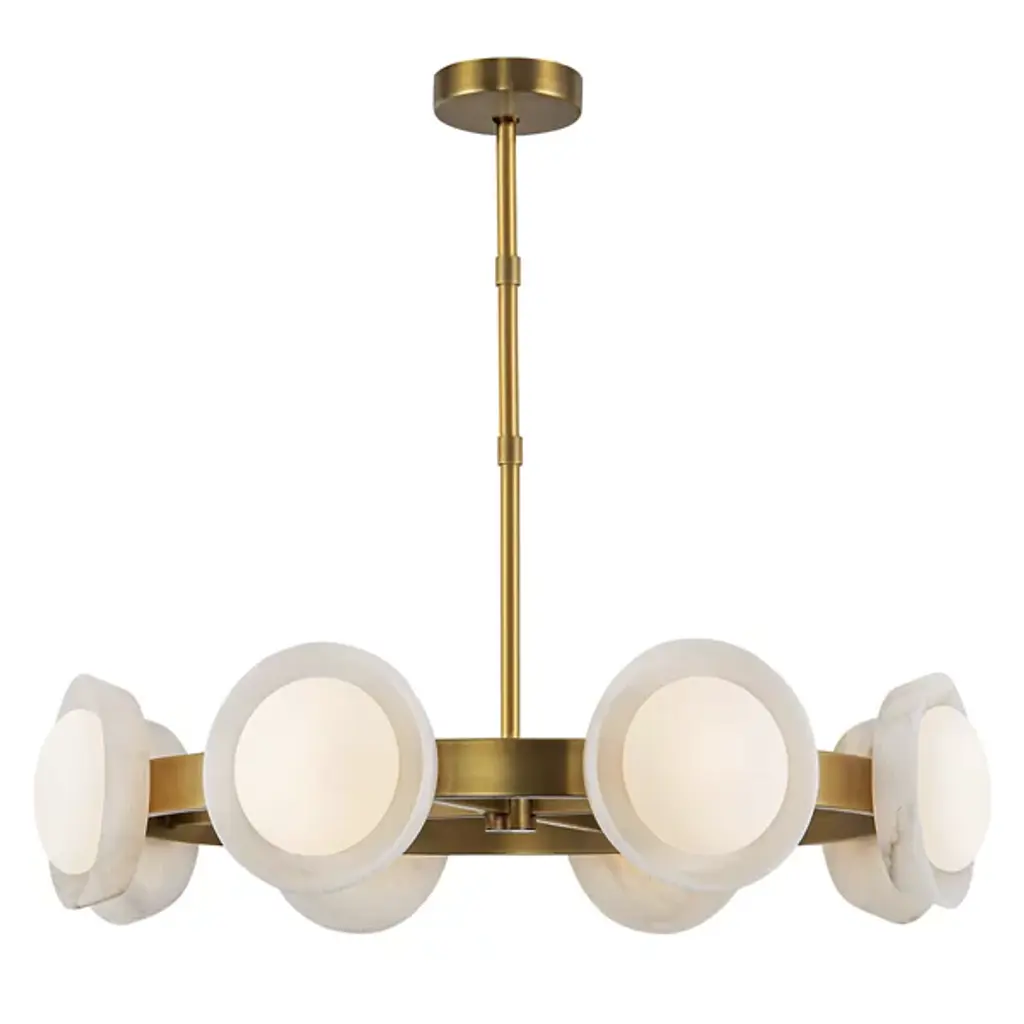 The Alonso LED Chandelier from Alora Lighting masterfully blends soft and robust forms through its captivating combination of materials. Employing alabaster in innovative ways, both as decorative backplate elements and intricately carved shades, Alonso strikes a balance between tradition and modernity. The substantial forged metal frame provides the perfect backdrop for showcasing the exquisite alabaster details. This collection seamlessly marries classic and contemporary design elements, creating a striking visual statement in any space.