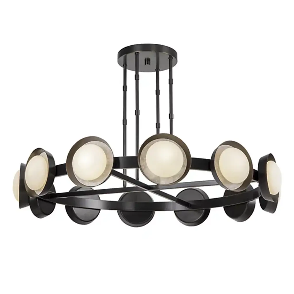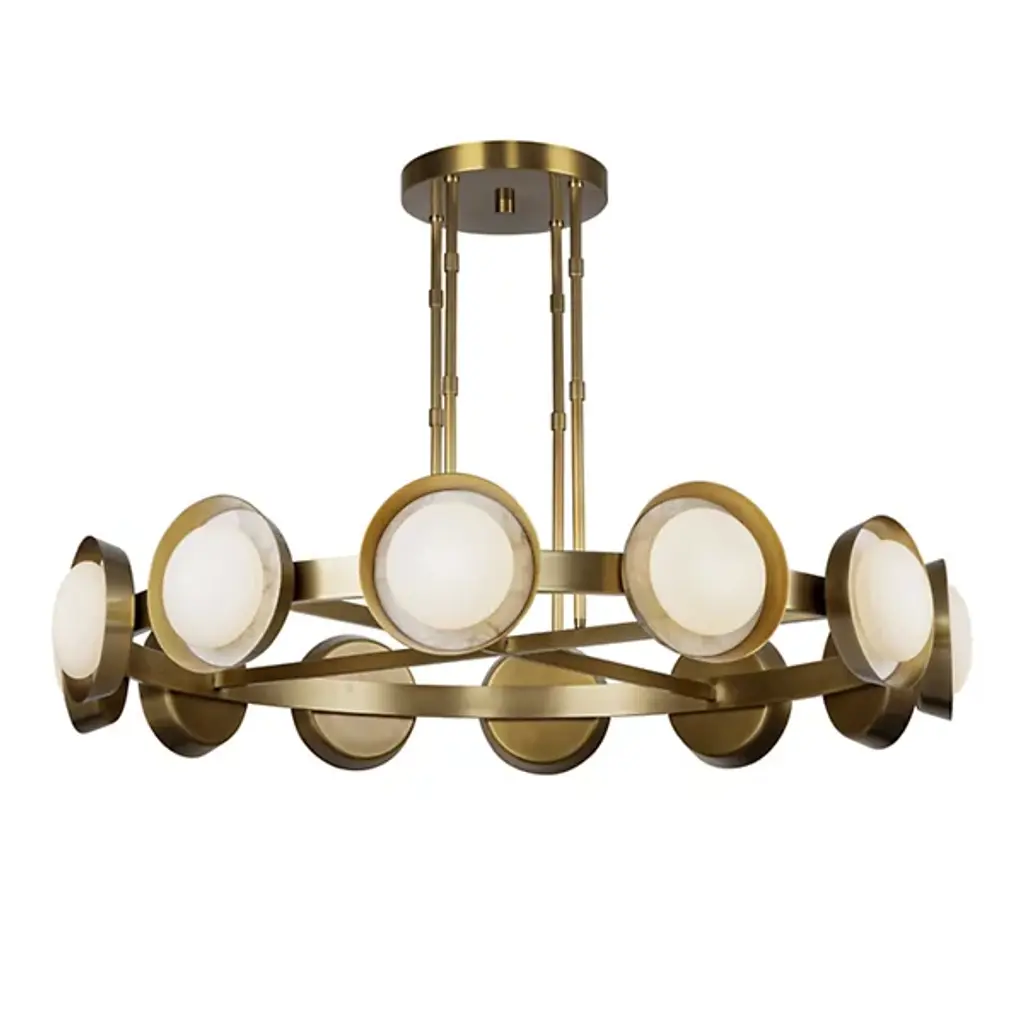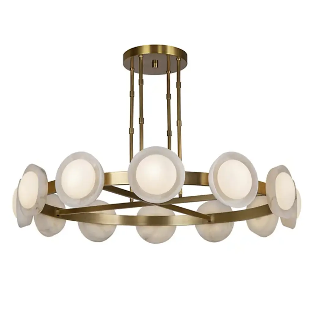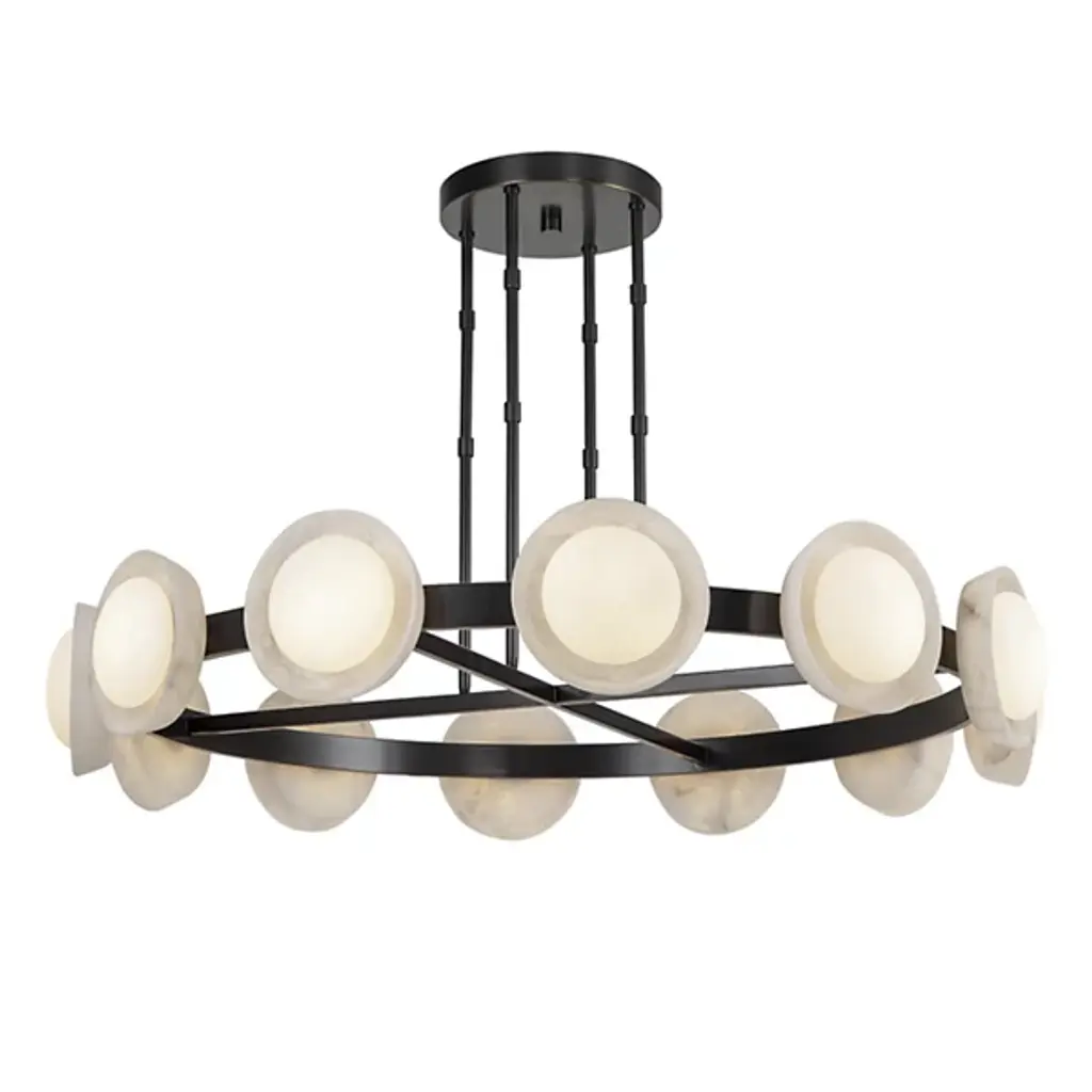 The Alonso LED Large Chandelier by Alora Lighting skillfully harmonizes delicate and robust forms through its captivating blend of materials. With innovative use of alabaster in decorative backplate elements and intricately carved shades, this product strikes a harmonious chord between classic allure and modern sensibility. Its substantial forged metal frame provides an ideal backdrop for showcasing the exquisite alabaster details. This collection seamlessly unites timeless and contemporary design, making a bold and elegant statement in any setting. Illuminate your space with the Alonso LED Large Chandelier's captivating blend of form and function.