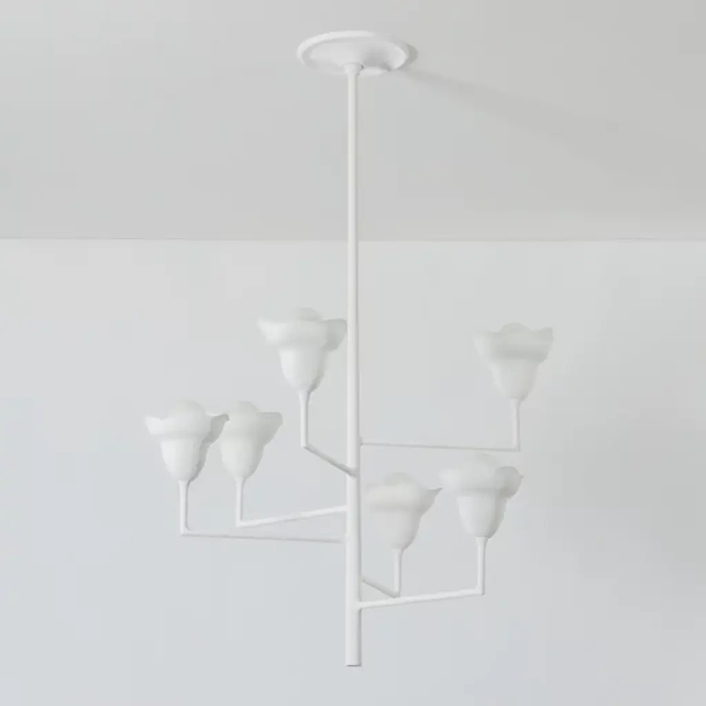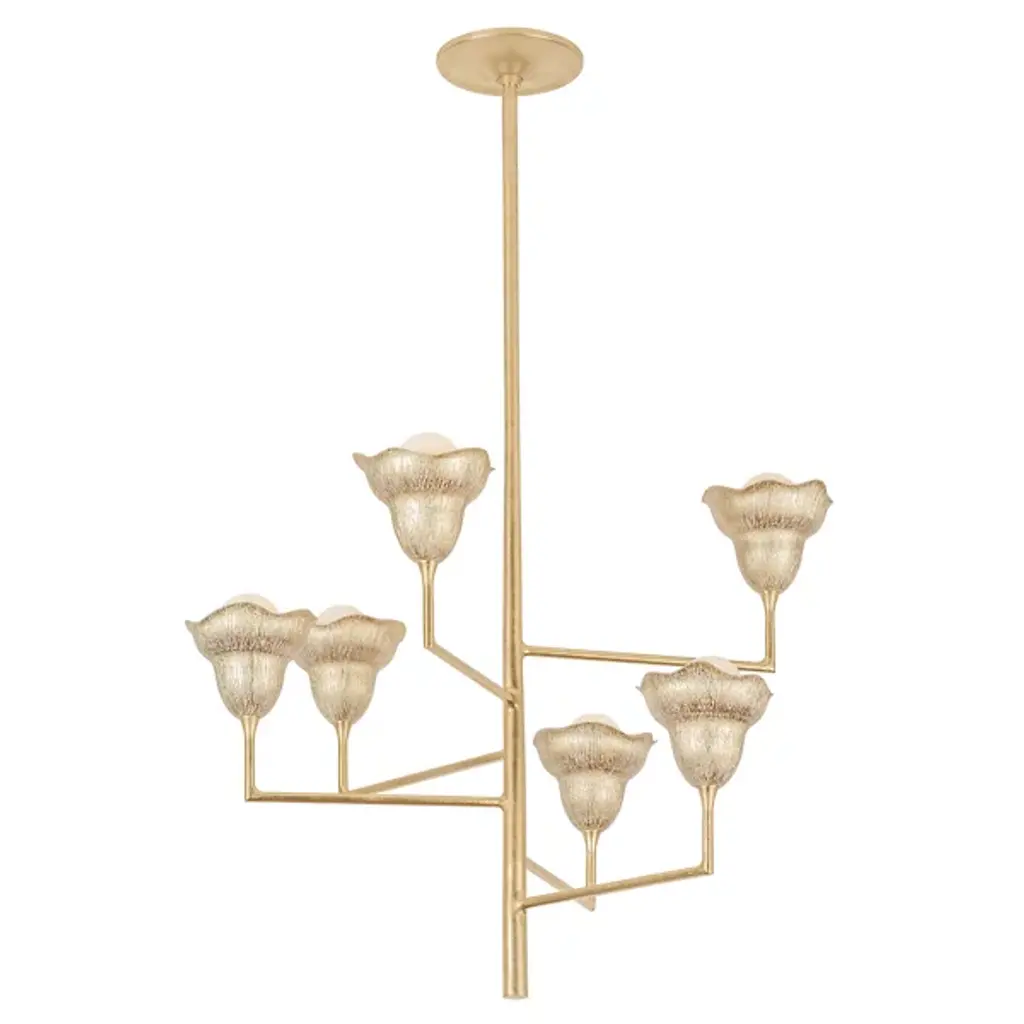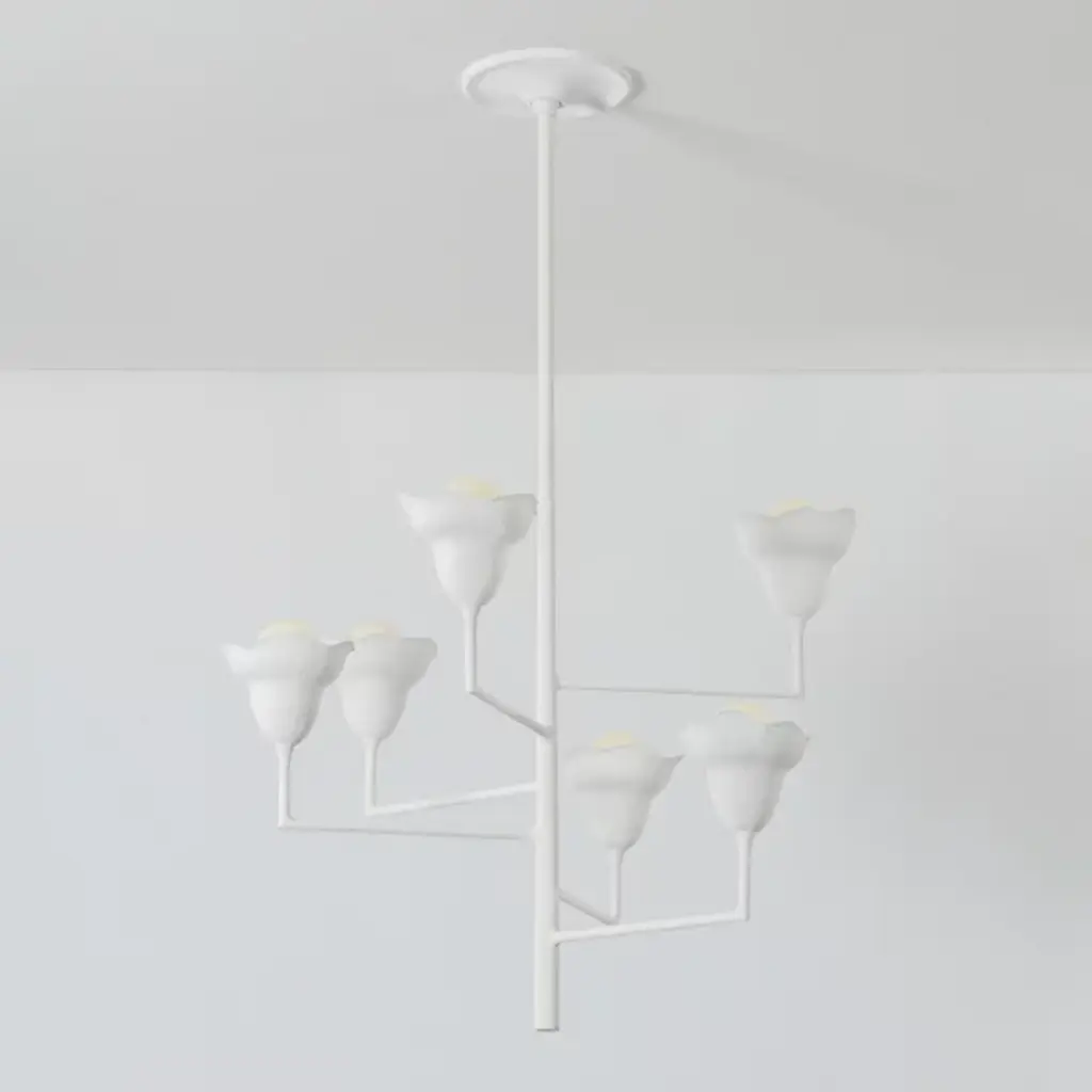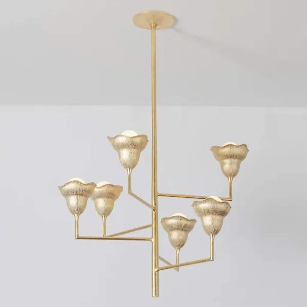 The Alora Chandelier from Hudson Valley Lighting combines geometric framework with organic shade forms. Each floral-inspired shade features hand-sculpted details and textured relief patterns that add depth to their surfaces. The metal frame provides strong horizontal and vertical lines that contrast with the natural irregularity of the shades. In this fixture, the combination of structured metalwork and nature-inspired shades creates an interesting dialogue between manufactured precision and artistic interpretation.