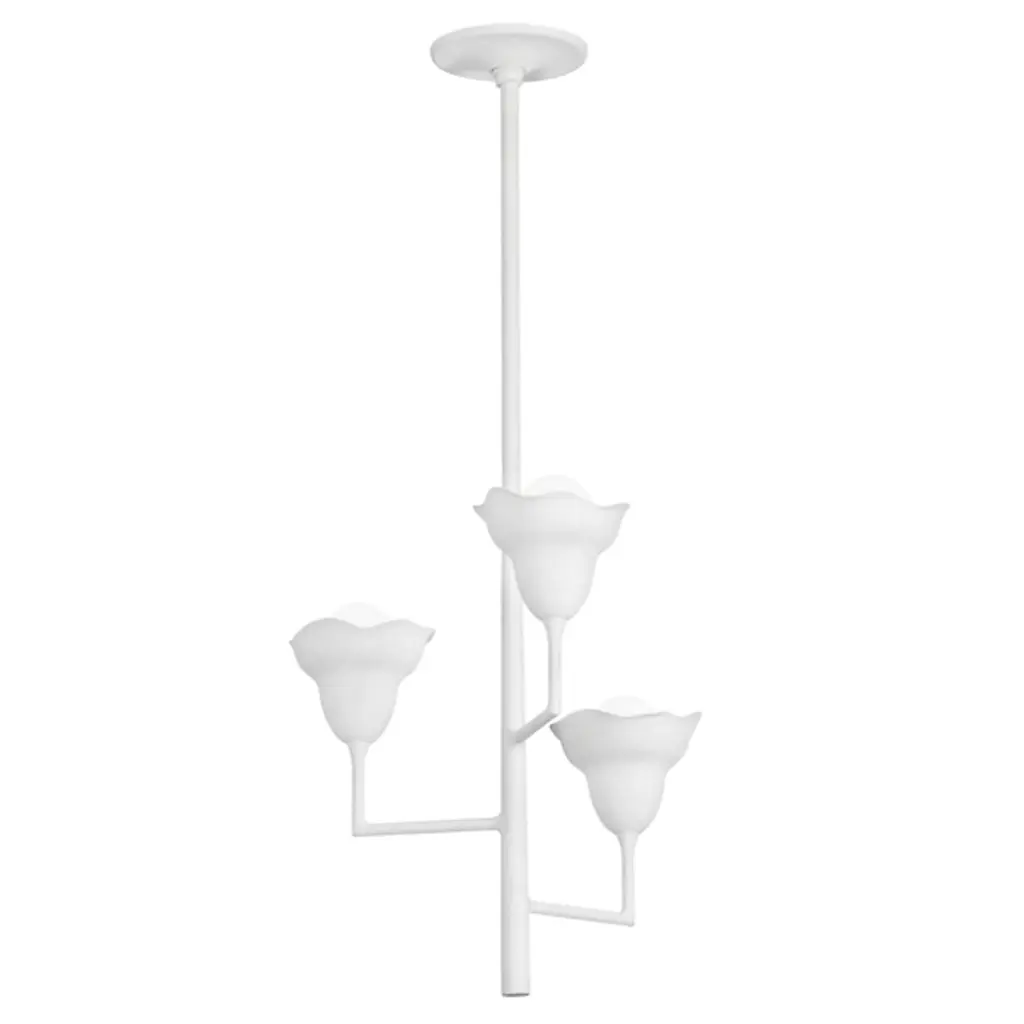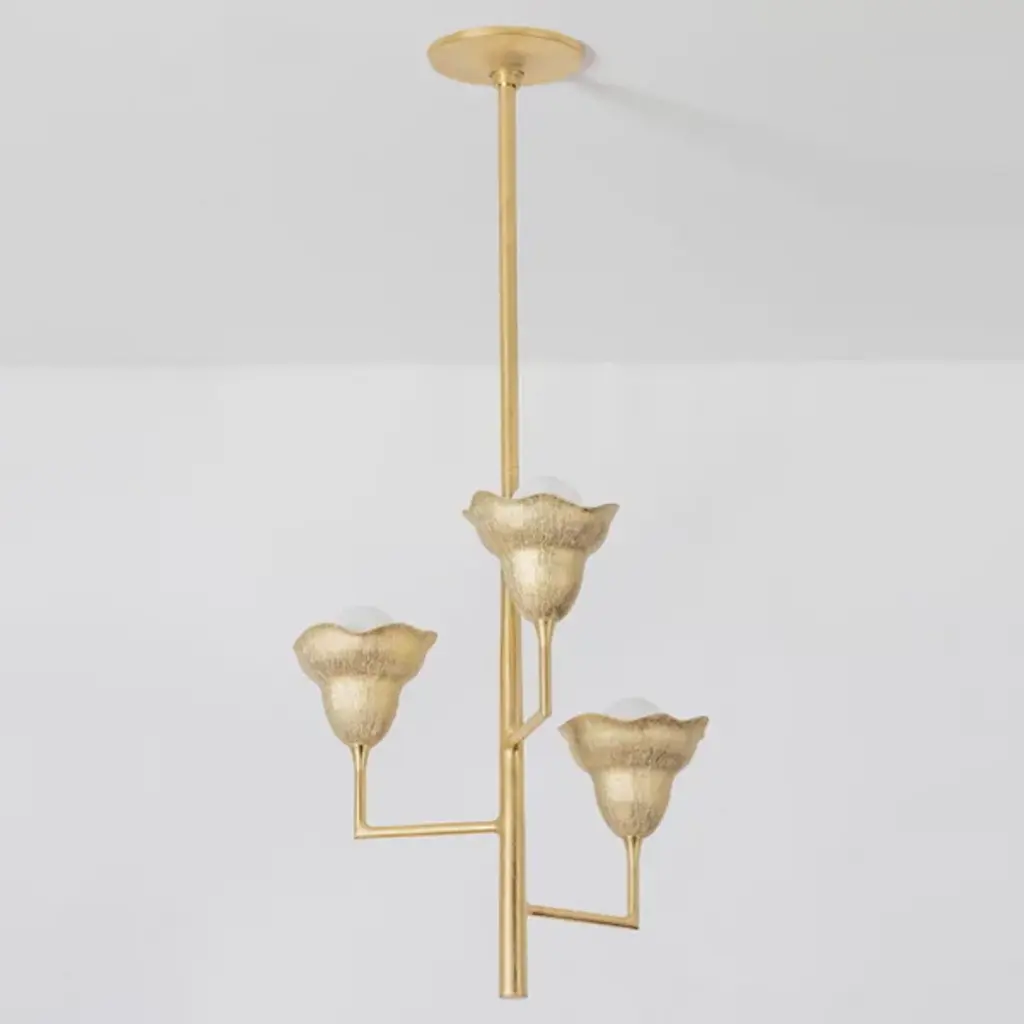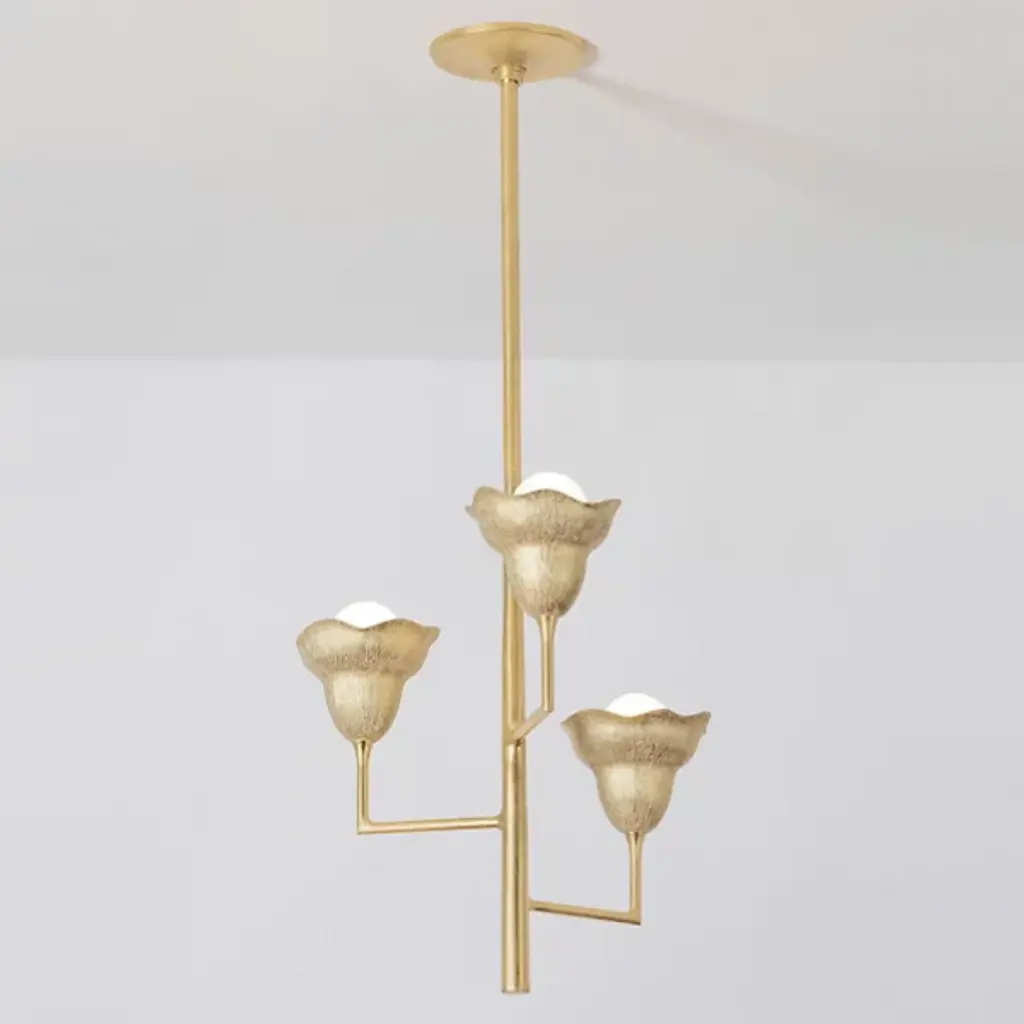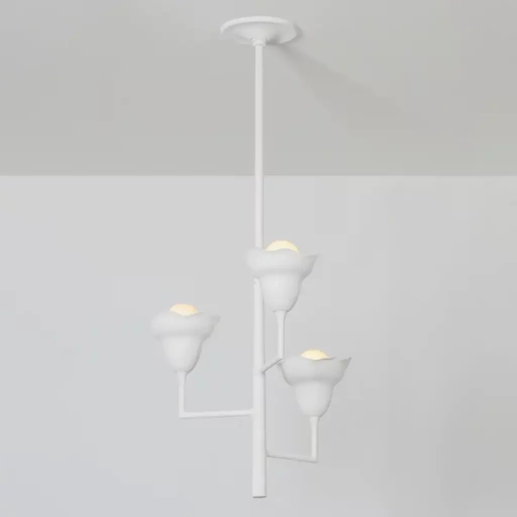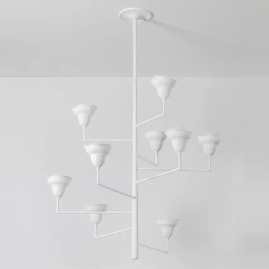 The Alora Chandelier from Hudson Valley Lighting combines geometric framework with organic shade forms. Each floral-inspired shade features hand-sculpted details and textured relief patterns that add depth to their surfaces. The metal frame provides strong horizontal and vertical lines that contrast with the natural irregularity of the shades. In this fixture, the combination of structured metalwork and nature-inspired shades creates an interesting dialogue between manufactured precision and artistic interpretation.