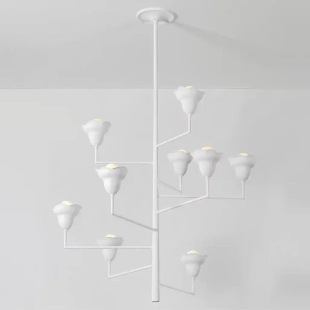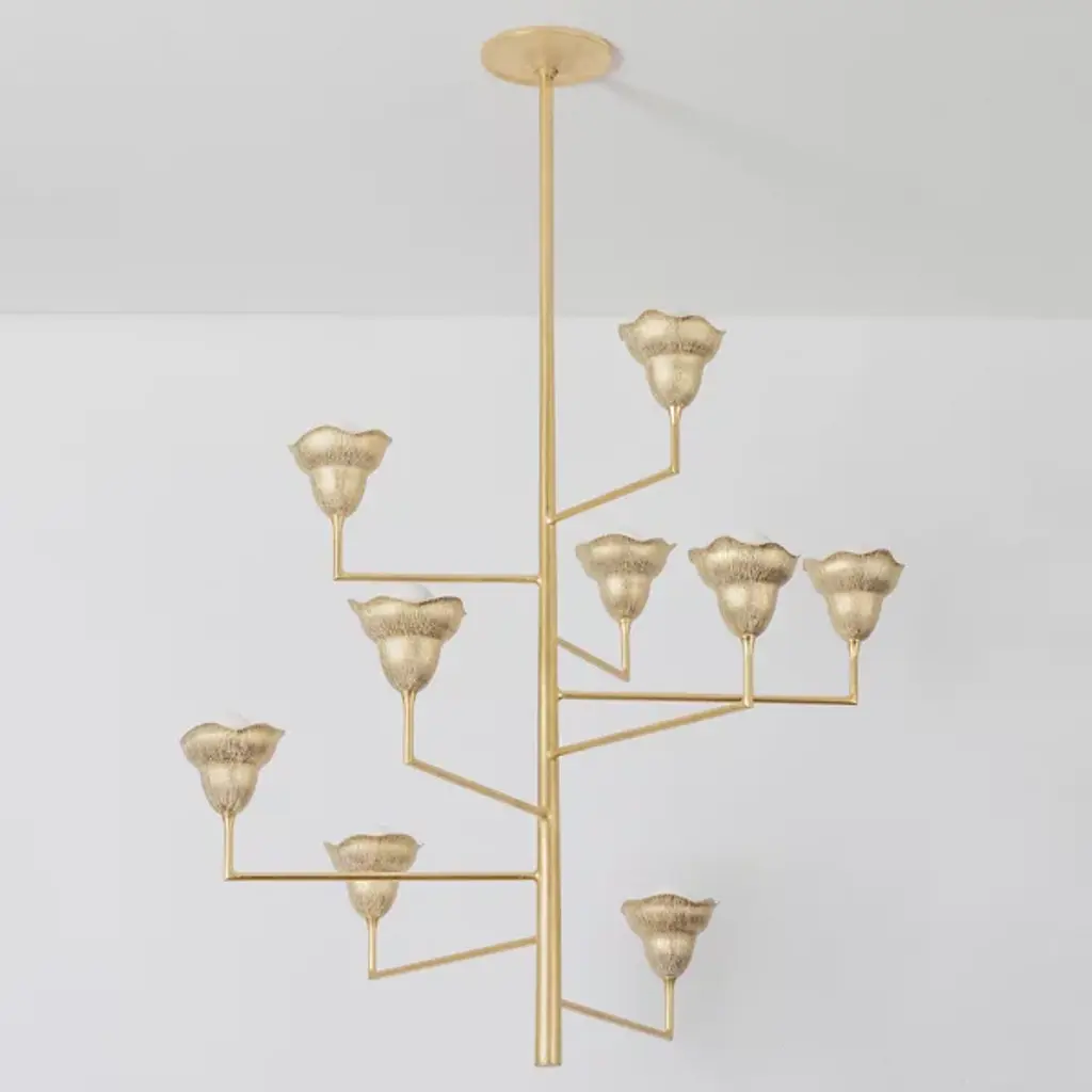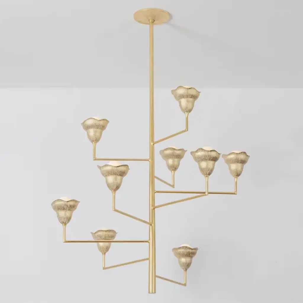 The Alora Chandelier from Hudson Valley Lighting combines geometric framework with organic shade forms. Each floral-inspired shade features hand-sculpted details and textured relief patterns that add depth to their surfaces. The metal frame provides strong horizontal and vertical lines that contrast with the natural irregularity of the shades. In this fixture, the combination of structured metalwork and nature-inspired shades creates an interesting dialogue between manufactured precision and artistic interpretation.