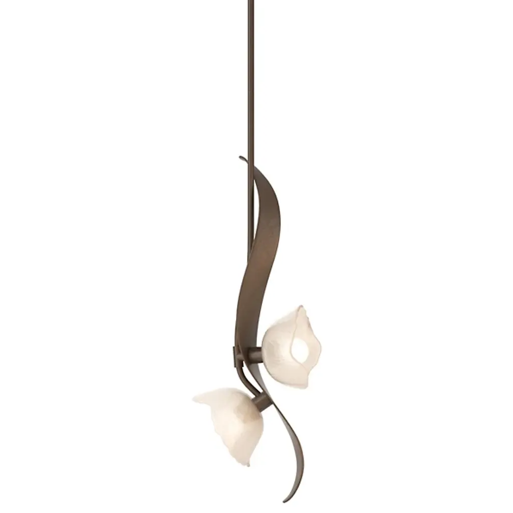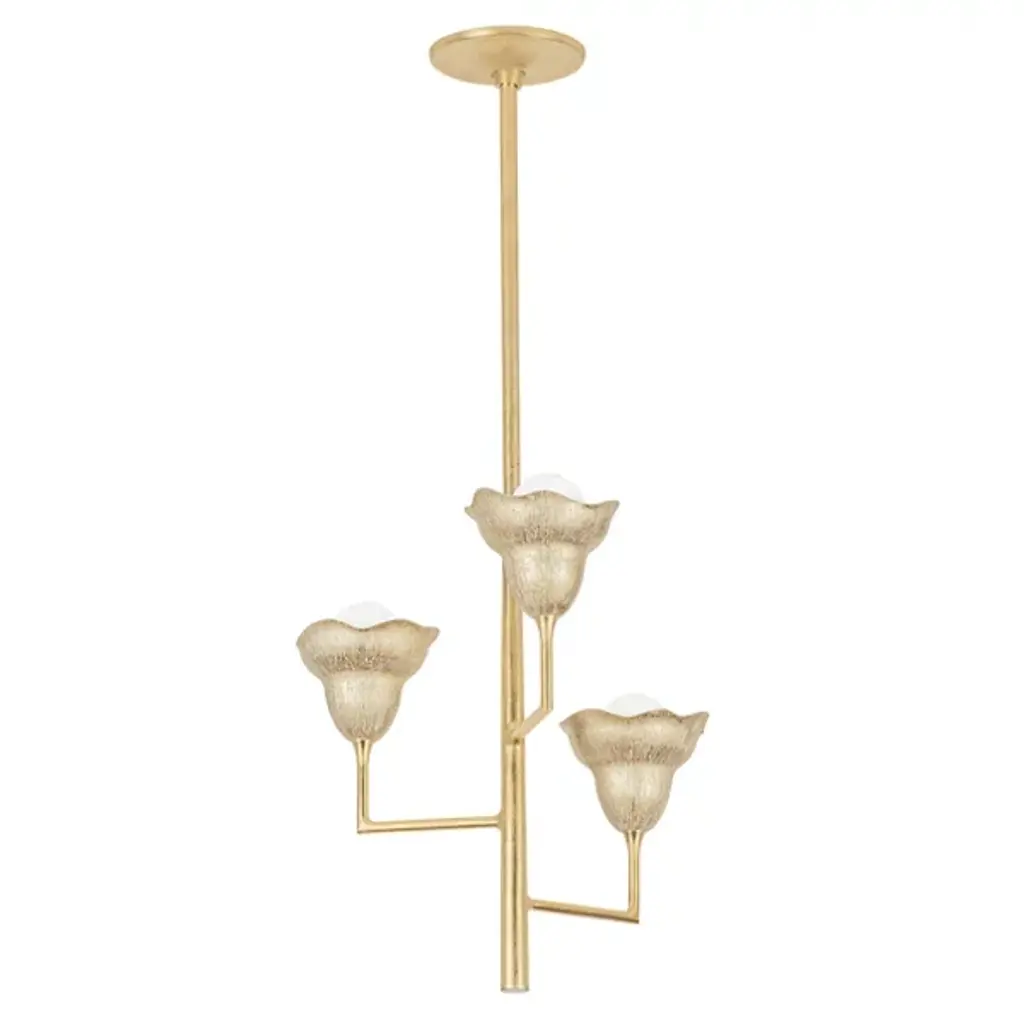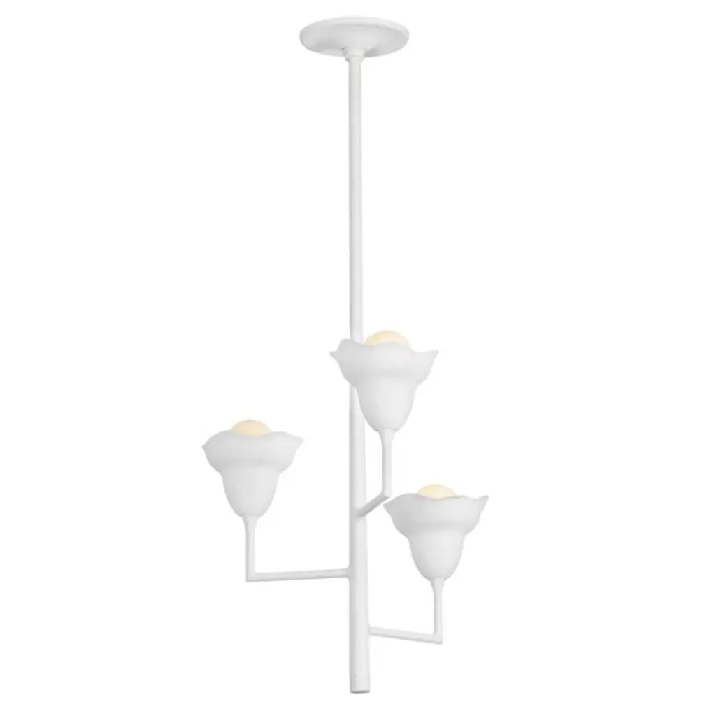 The Alora Chandelier from Hudson Valley Lighting combines geometric framework with organic shade forms. Each floral-inspired shade features hand-sculpted details and textured relief patterns that add depth to their surfaces. The metal frame provides strong horizontal and vertical lines that contrast with the natural irregularity of the shades. In this fixture, the combination of structured metalwork and nature-inspired shades creates an interesting dialogue between manufactured precision and artistic interpretation.