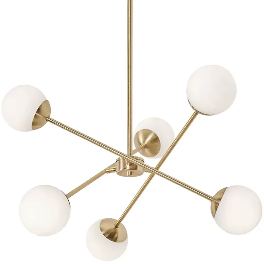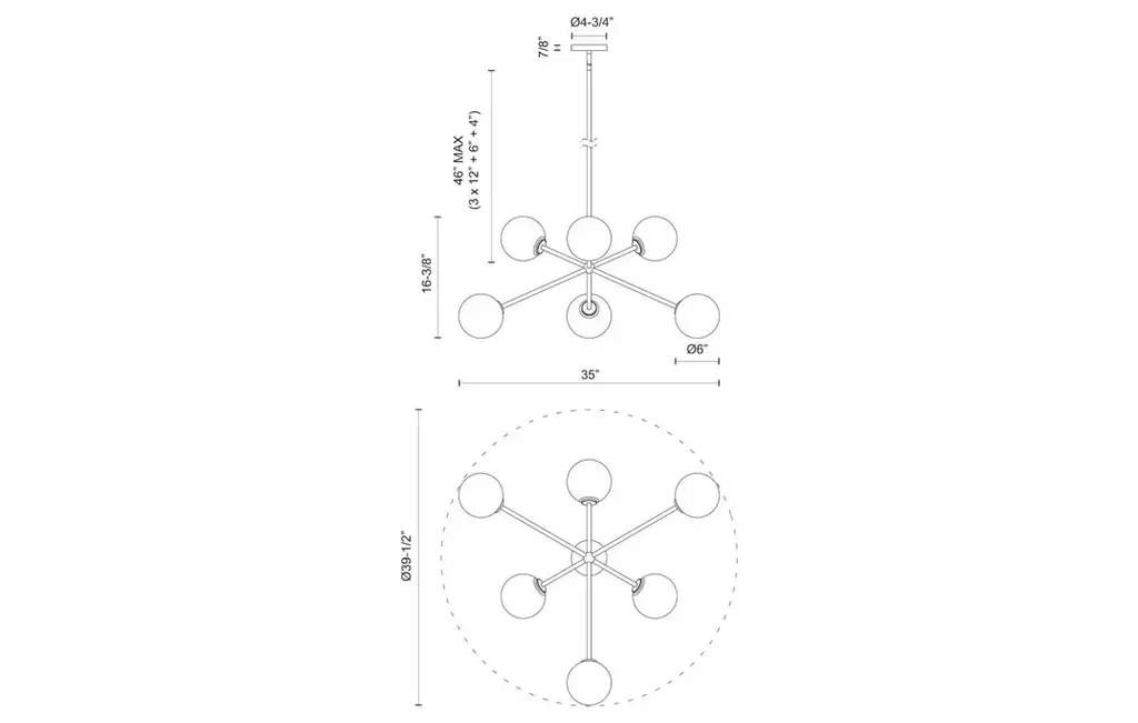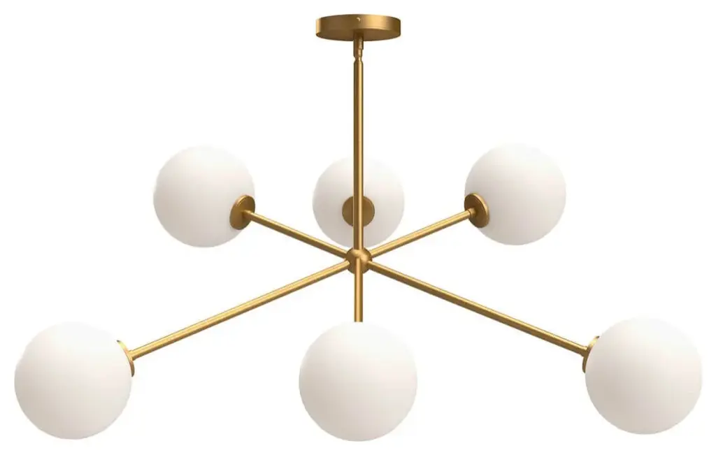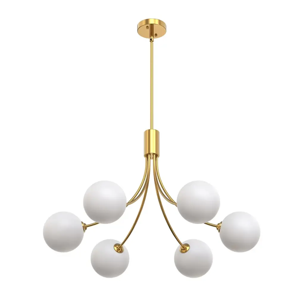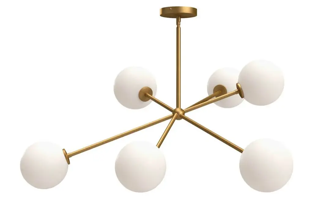 Mid-century shapes meet modern boho flair in the Cassia collection. With Sputnik-style shapes dancing with Opal Matte glass globes, this collection is two parts class, one part sass. Available in two finishes to match the mood of your space, Matte Black or Aged Gold.Painted and Plated SteelOpal GlassE12 Lamp Base Incandescent46" Mounting Rod with 60" Total Wire Length, Suitable for Sloped CeilingProduct Style : ModernMaterial : Glass, SteelGlass Details : Opal GlassSocket Type : Candelabra E12Bulbs Included : NoNo of Bulbs : 6Bulb Max Wattage : 40Fixture Max Wattage : 240Voltage : 120VFixture Diameter : 39.5 inchHeight : 16.38 inchMin Hanging Height : 24 inchWire Length : 60 inchRod Length : 46" MAX (3x12" + 1x6" + 1x4")Canopy Dimensions : D4-3/4" x H7/8"Fixture Weight : 8.37Certifications : ULSuggested Location : Dry LocationShip Via : GroundCountry of Origin : ChinaSloped Ceiling Adaptable : Yes, Up to 45 DegreesCanopy Included : YesWarranty : 1 YearShipping Width : 20.86 inchShipping Height : 8.66 inchShipping Length : 22.44 inchShipping Weight : 11.02Switch Type : Hardwire