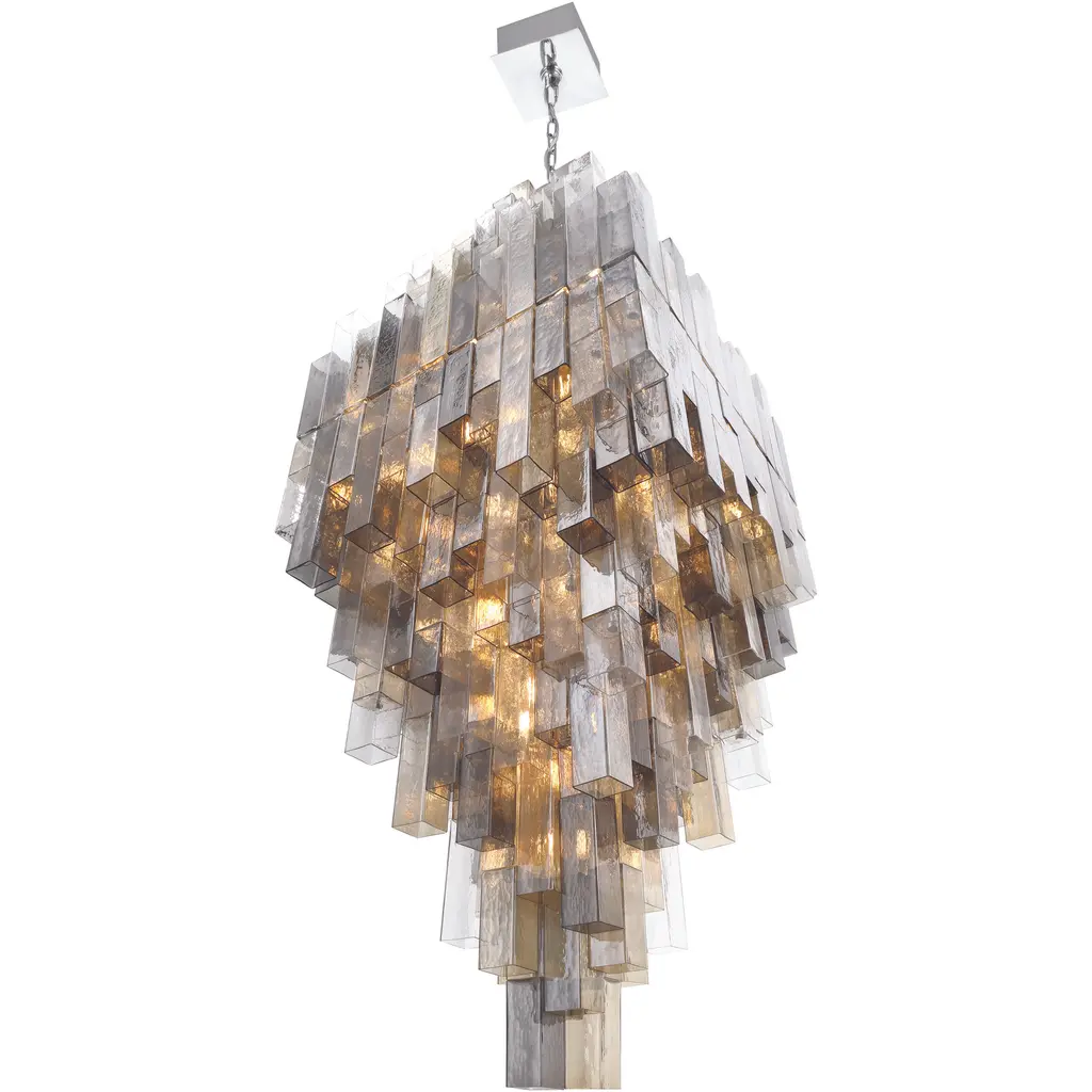 A series of stepped square balusters are the backbone of a staircase adding grace and strength to a functional element in a building. Using this same tiered visual, Altesa dresses square frames with elongated square tubes of glass. The varying lengths, tones and densities of glass influence the depth and color of light, presenting a mesmerizing display in grand proportions.
