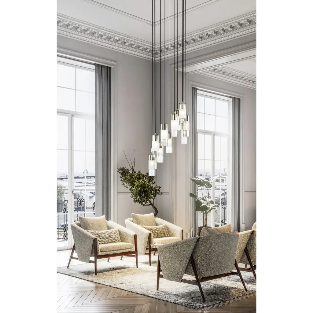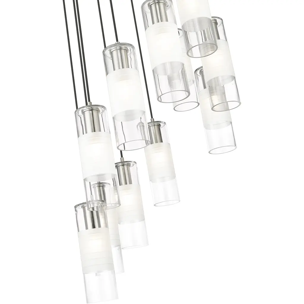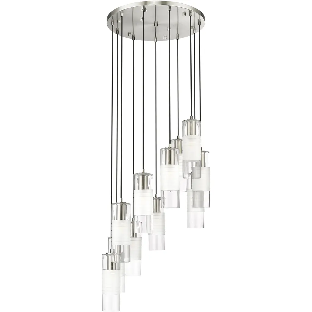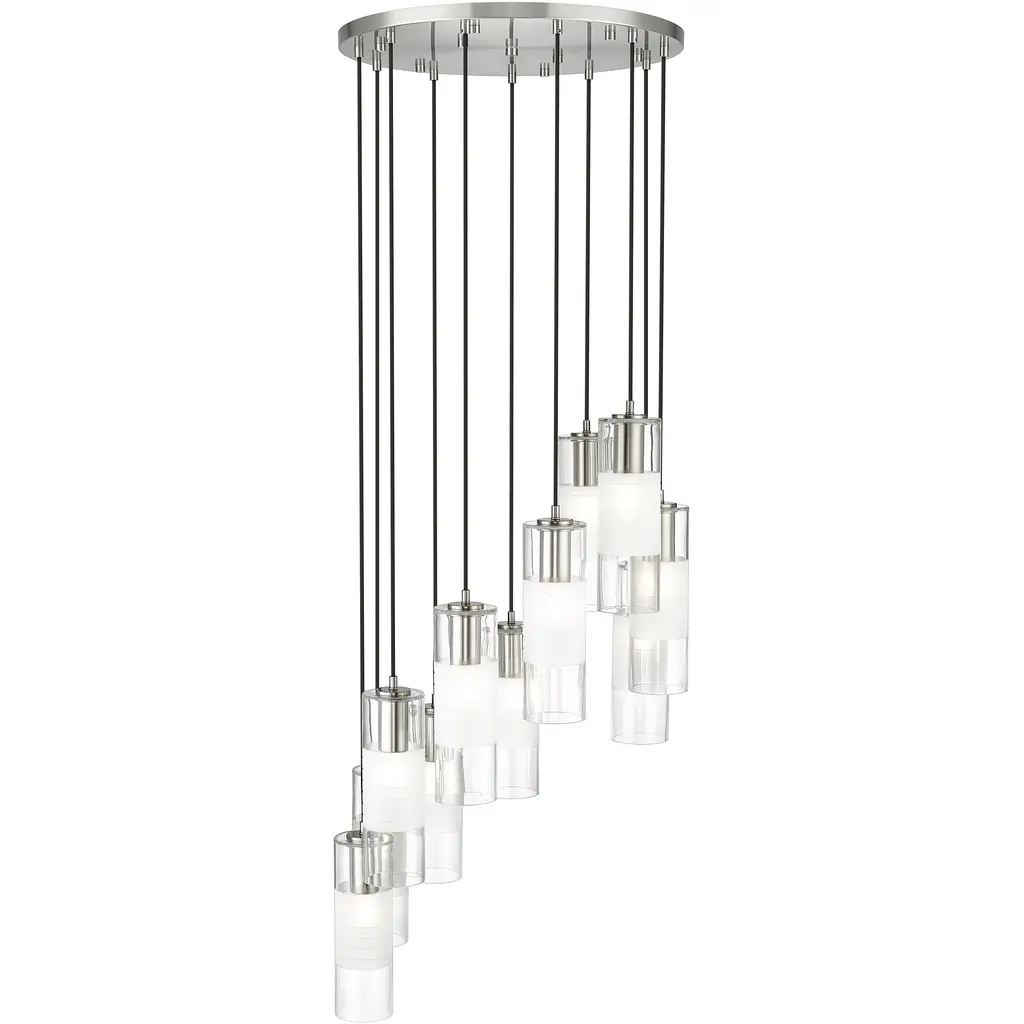 Chic artisan glass pairs with substantial steel housings to create a robust profile for a spiraling modern 11-light chandelier. Clear and frosted glass elements shade illumination to create lovely diffusion, offering exceptional ambiance over a dining table or foyer. Brushed nickel finish adds a refined, sleek touch.