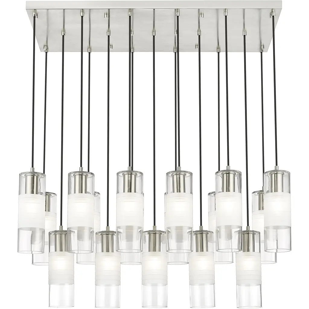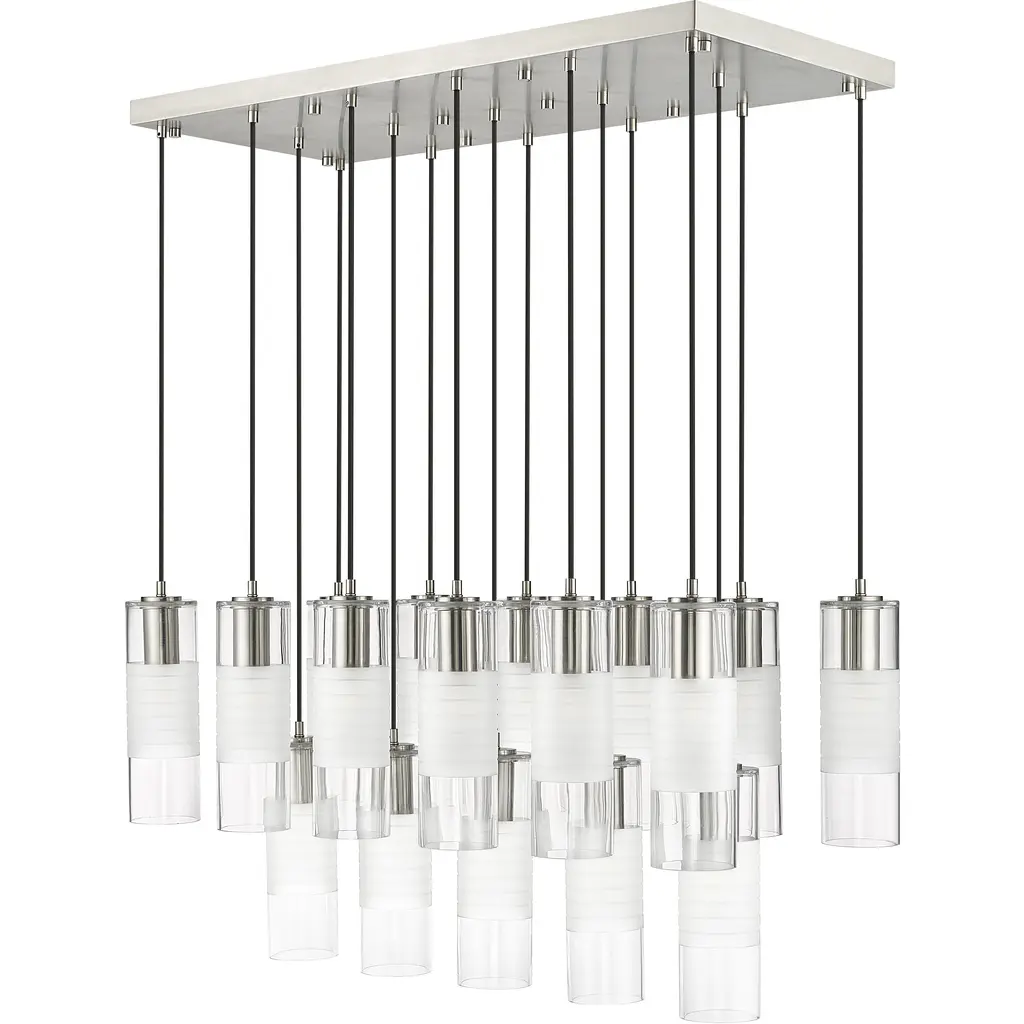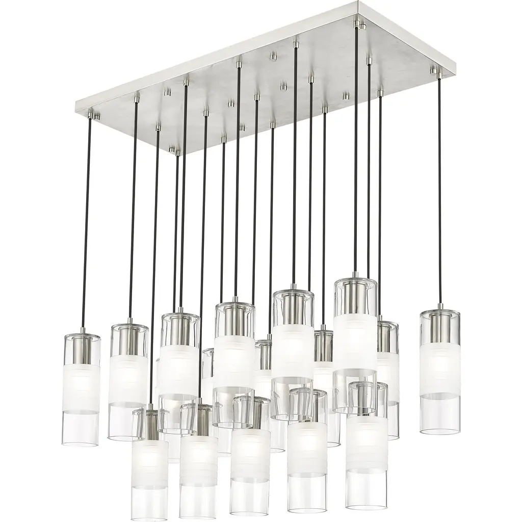 Two tiers create a staggered effect for the individual suspended lights featured in a modern 17-light linear chandelier. From the Alton collection, its deceptive simplicity is enhanced with clear and frosted glass elements and braided clothe cords that effect a fresh, tailored ambiance perfect for sophisticated spaces. Its housings and rectangular canopy receives brushed nickel finish, instilling a sleek, refined sensibility in any space.